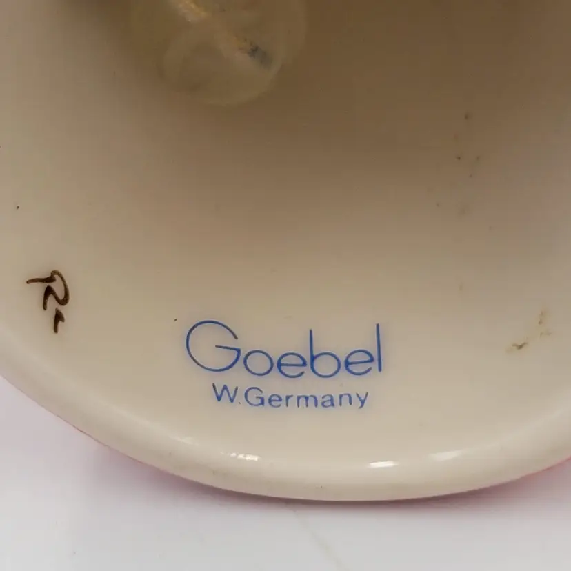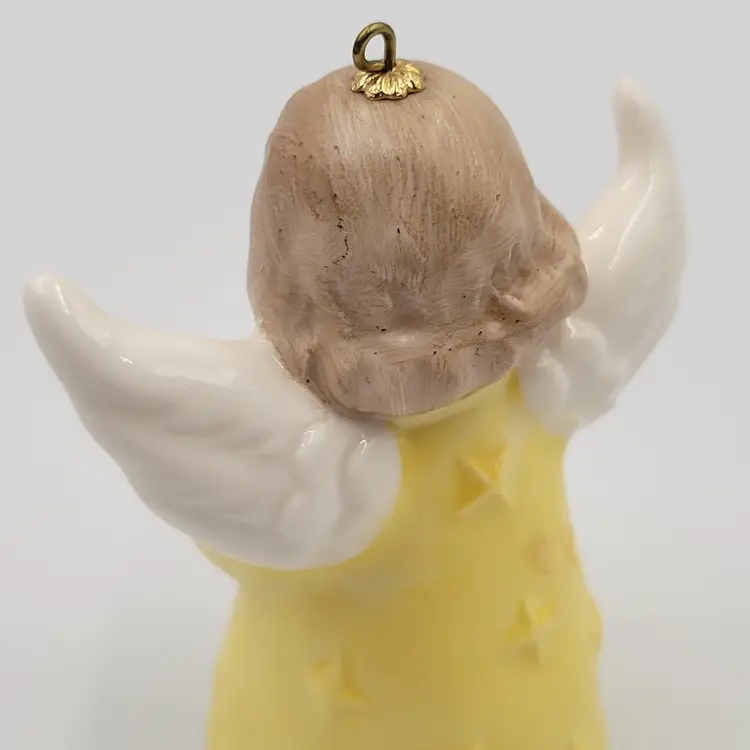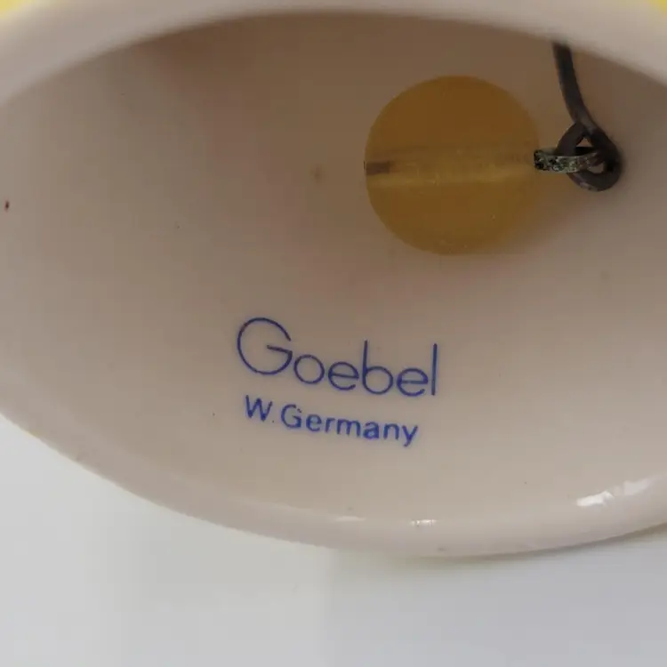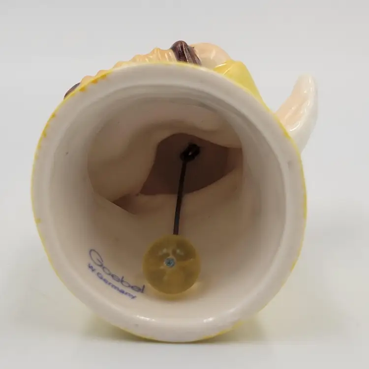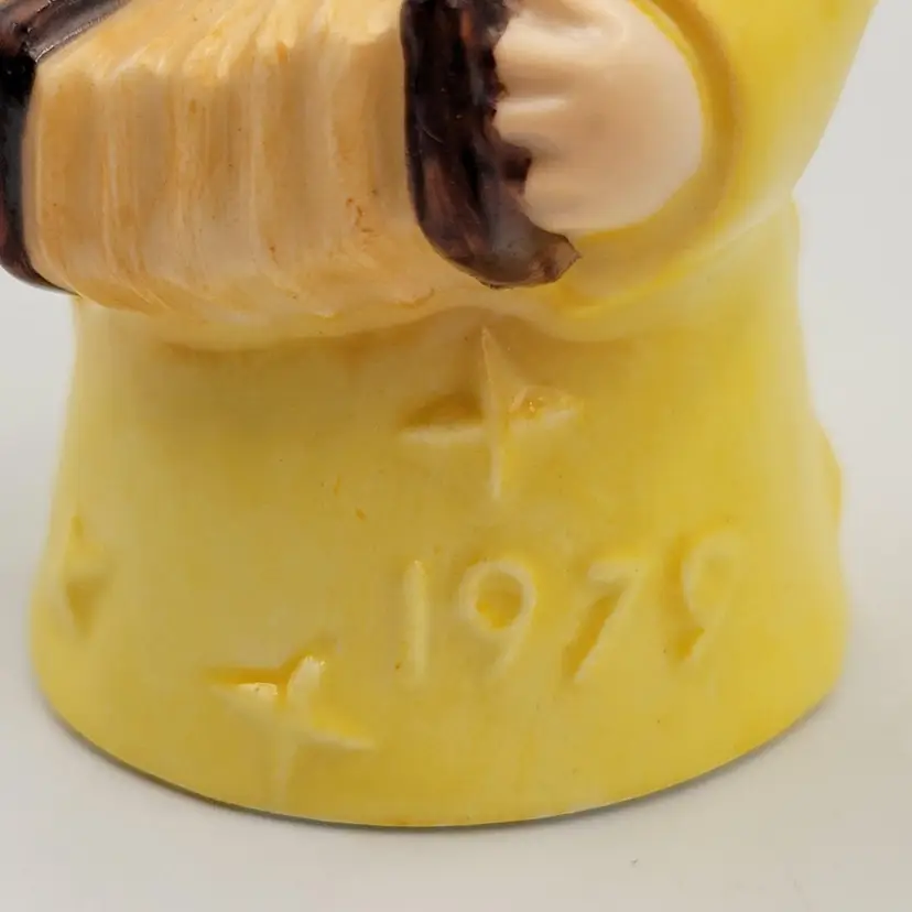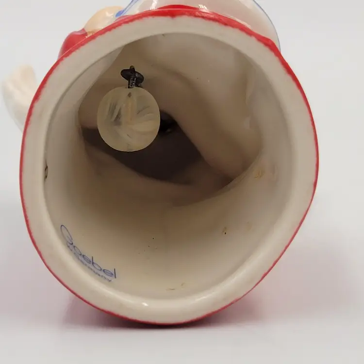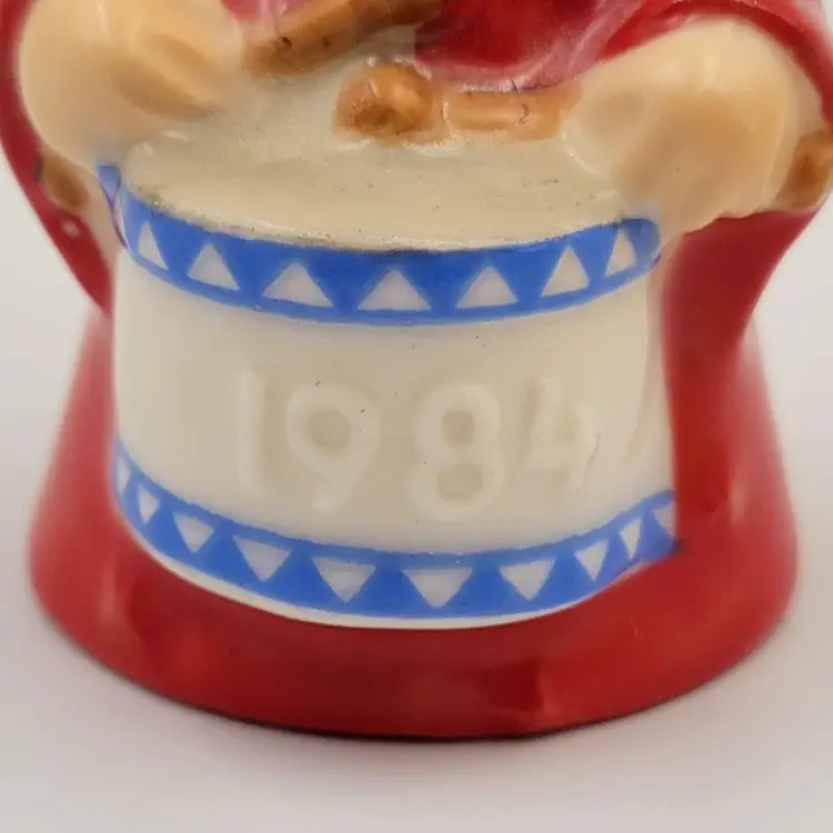 This is a set of 2 vintage Goebel angel bell ornaments. A yellow one dated 1979 holding an Accordion and a red one dated 1984 playing a drum. These ornaments measure about 3 inches tall. There are no chips or cracks. On the red angel, the gold cap on the top is bent up (see photos).