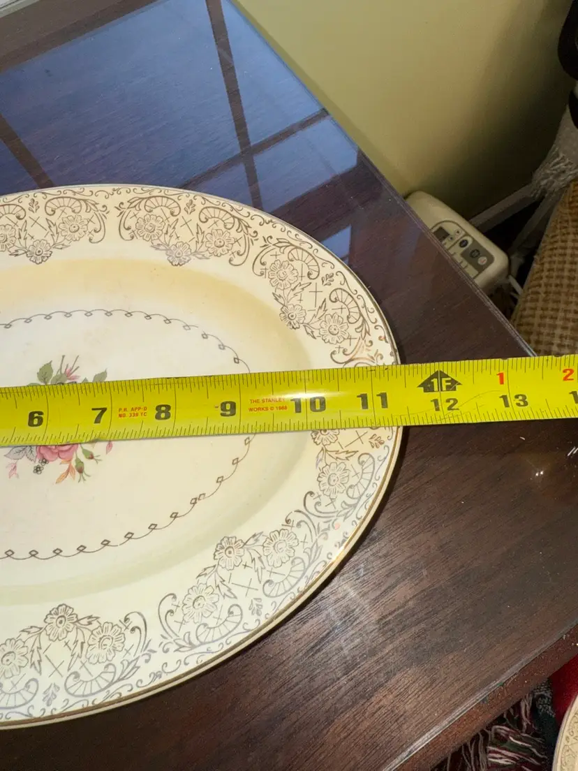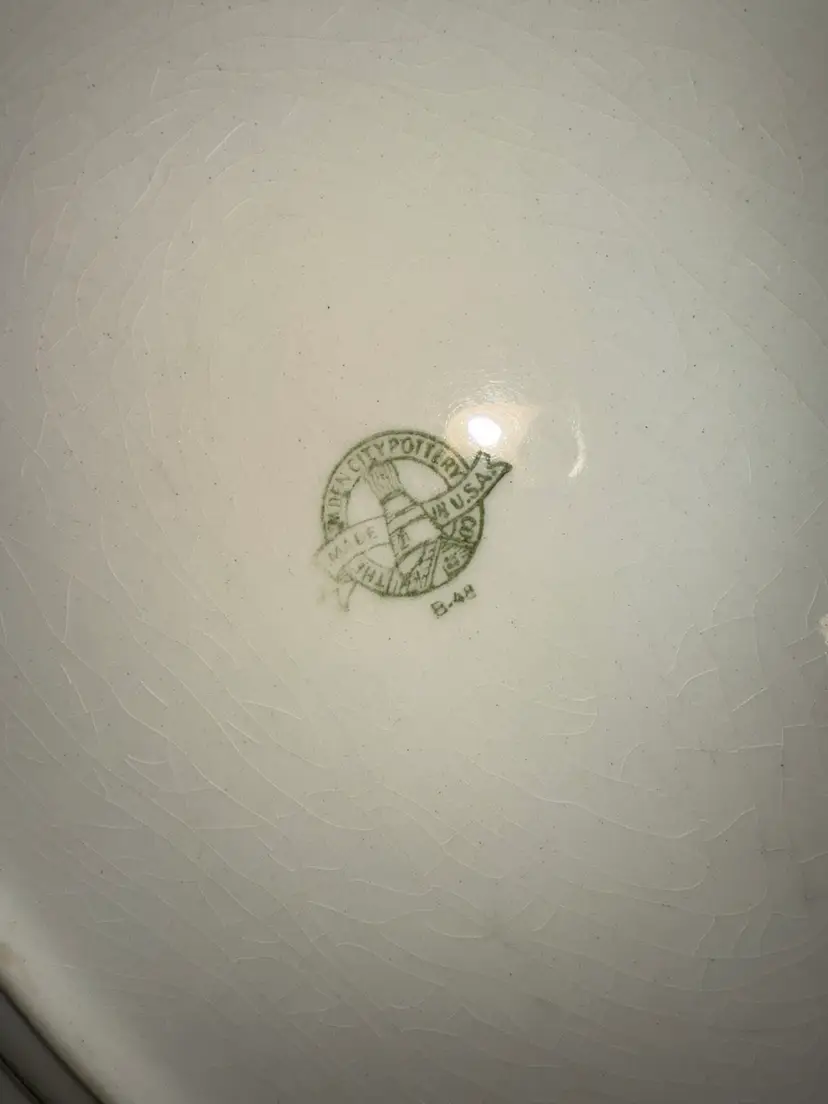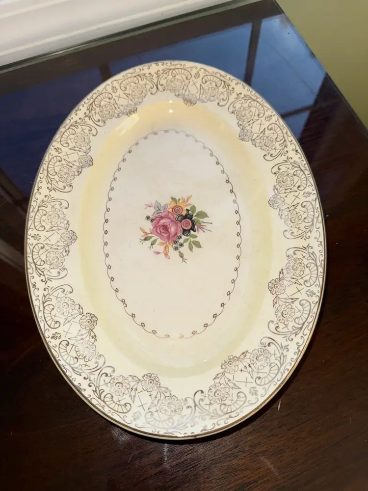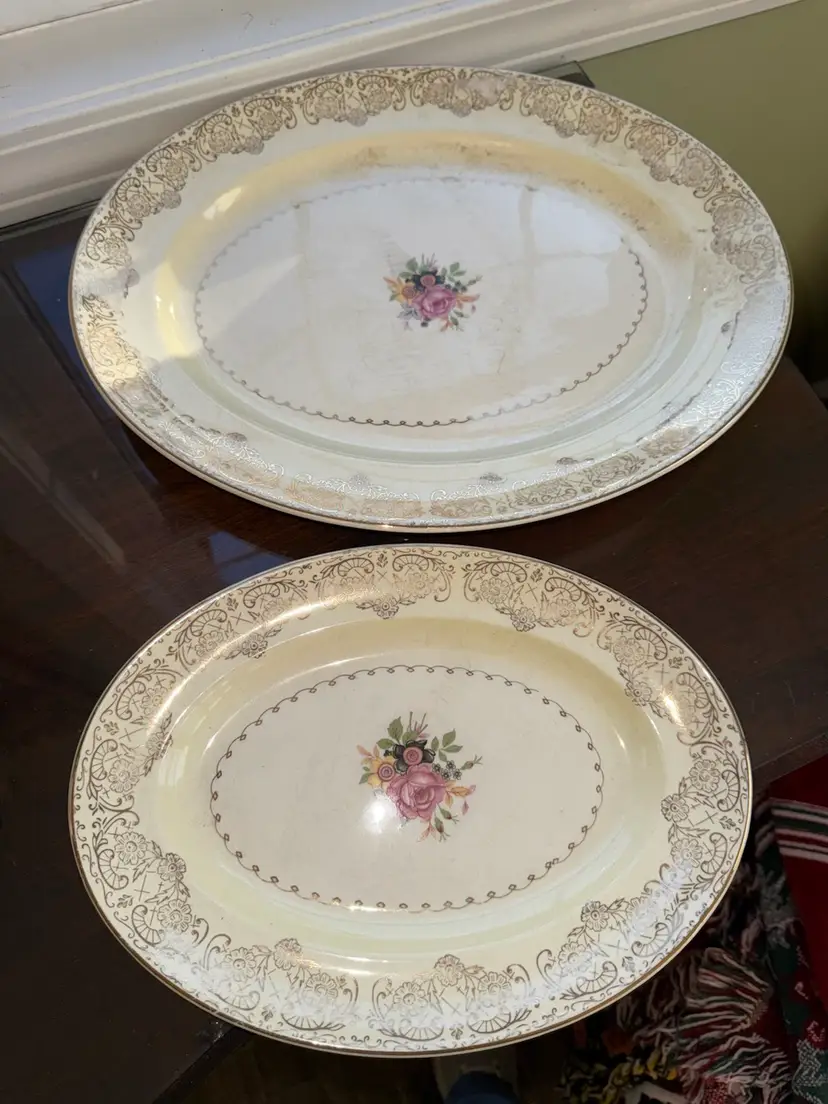 This set of 2 vintage Paden City Pottery serving platters features a beautiful floral pattern with pink roses and 22k gold trim. Made of ceramic with a glossy finish, these oval-shaped platters exude a mid-century modern style from the 1950s. The largest platter measures 16“ x 13“. The other platter measures 12“ x 9“. The multicolor design adds a touch of elegance to any dining table, and the brand's originality ensures a unique addition to your collection. Hand wash only to preserve the vintage charm of these stunning platters. these platters have some crazing due to aging. Beautiful pieces.