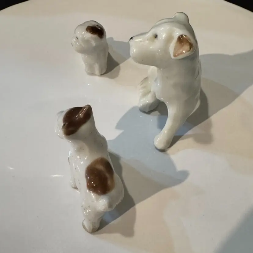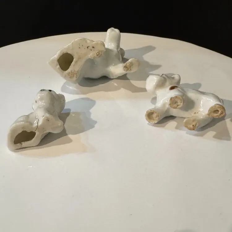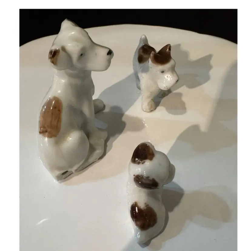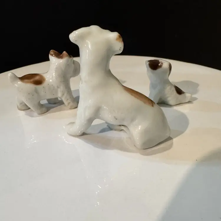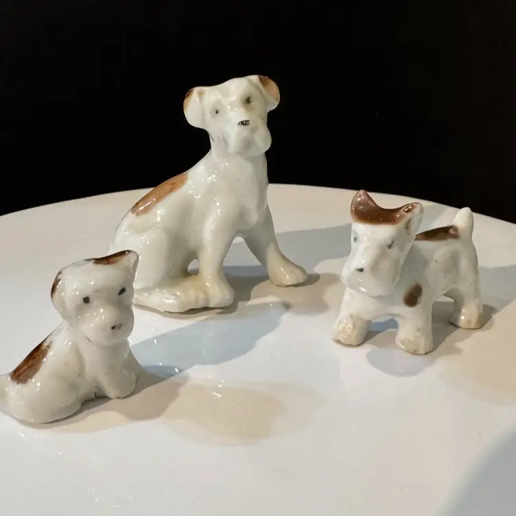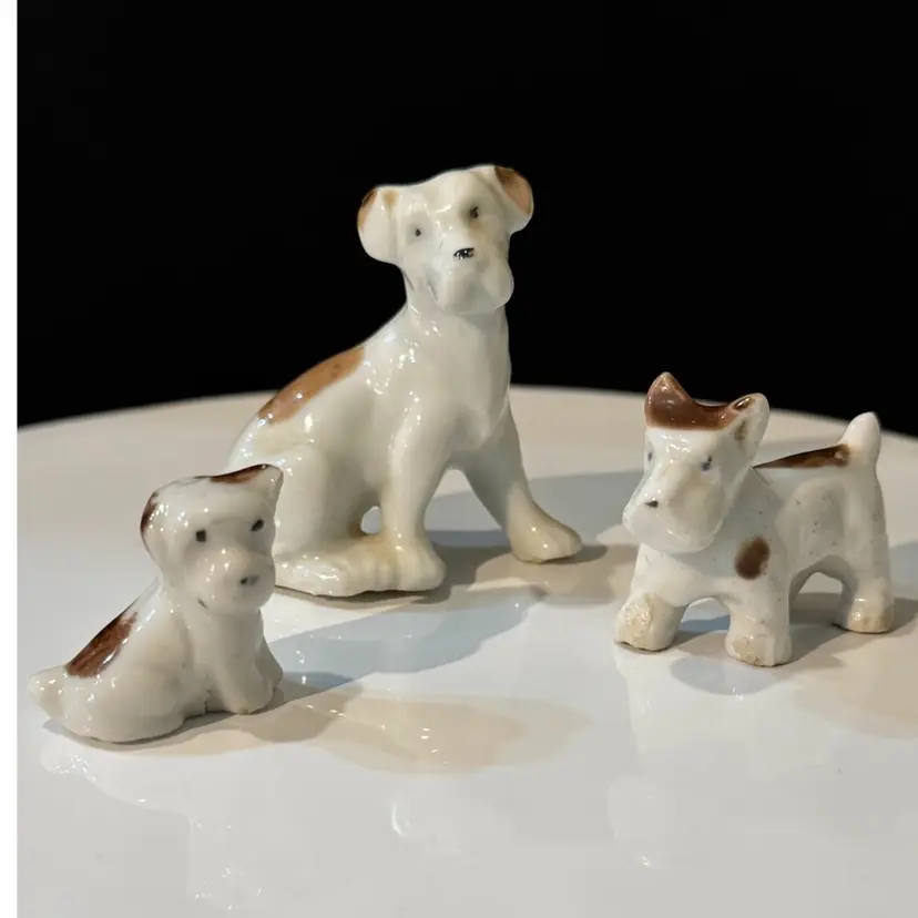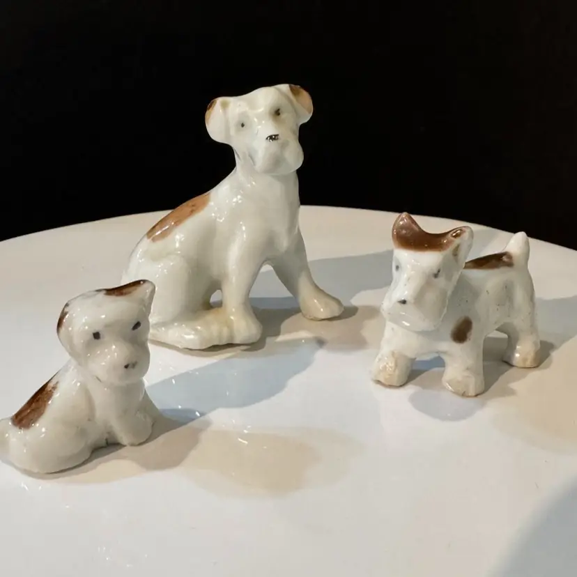 Adorable set of three vintage terriers. No chips or cracks. Paint loss consistent with age. Tallest measures 2 inches and smaller measure about an inch tall each.