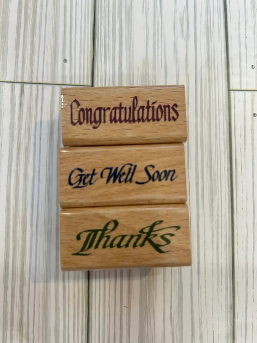 These three stamps read Congratulations, Get Well Soon and Thanks and have never been used. They measure 1x2”.