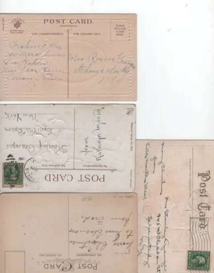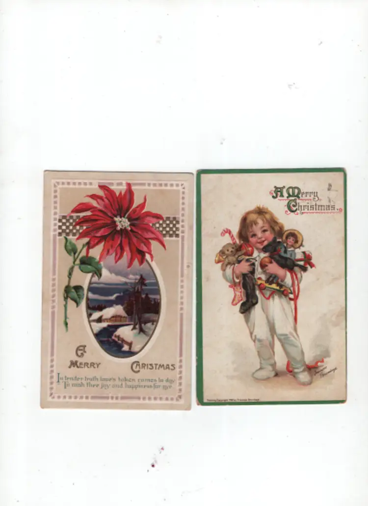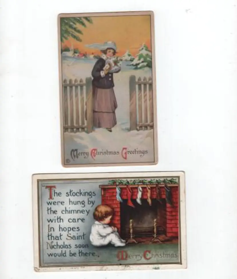 4 charming Christmas postcards that have all been postmarked. One is 1913, the others the date is either faded or just handwritten with no date.