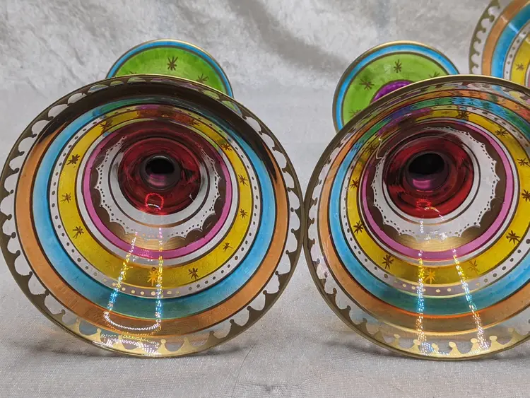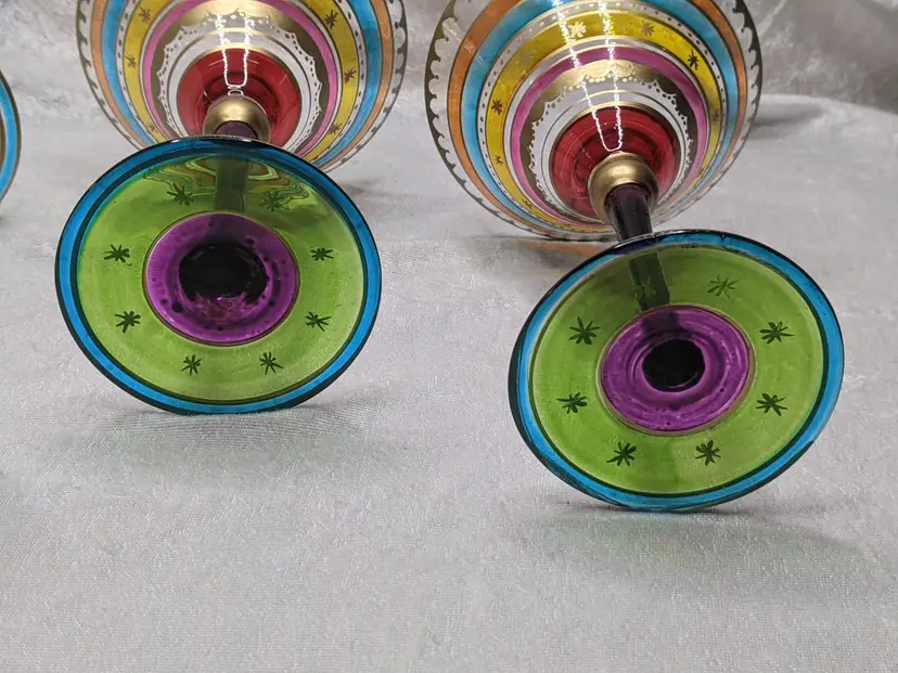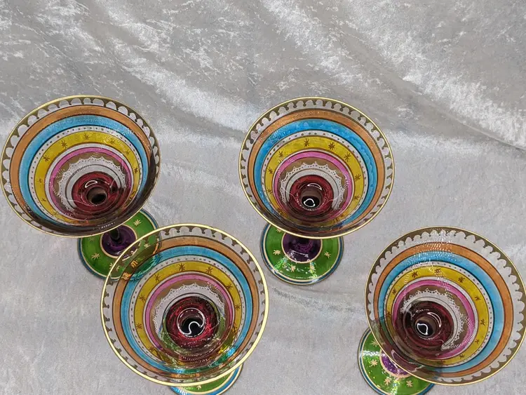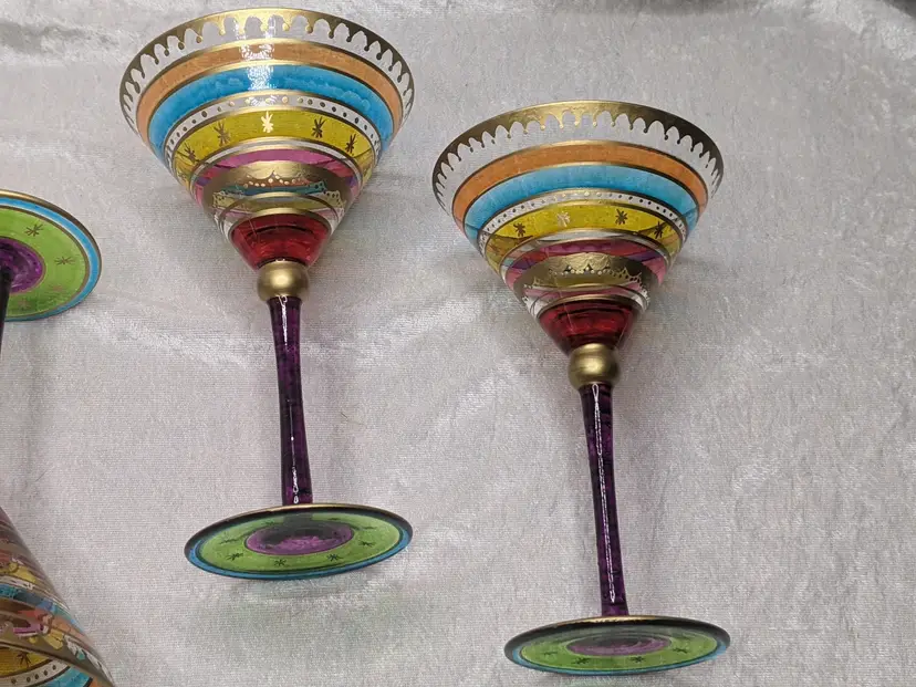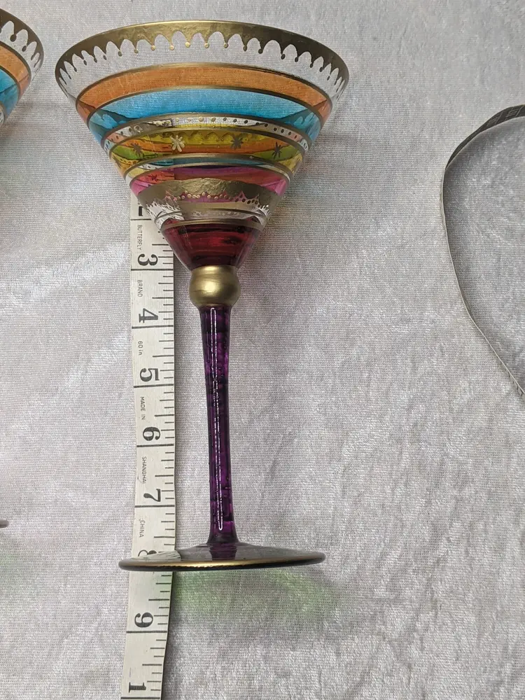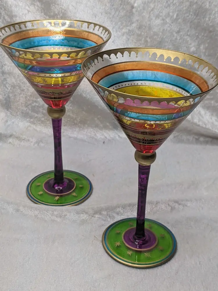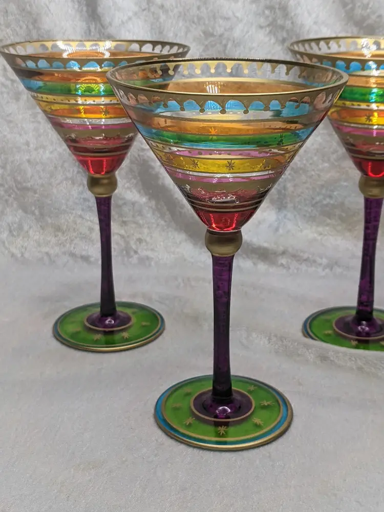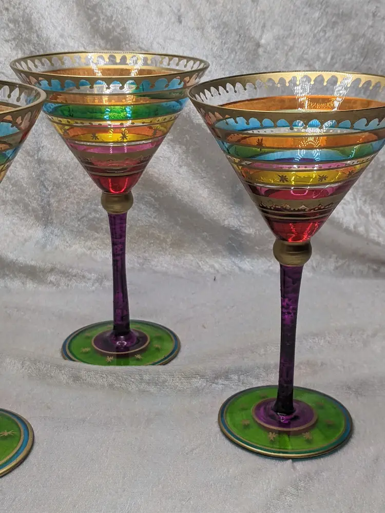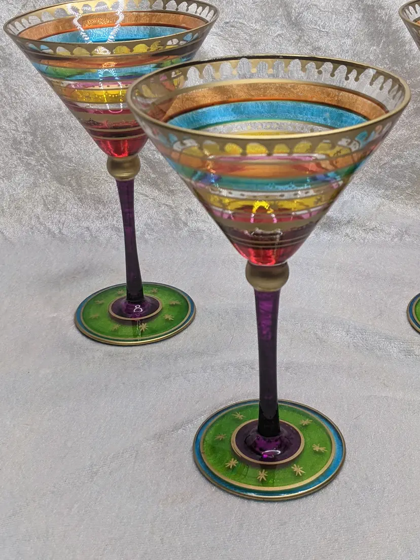Set Of 4 Pier 1 Hand Painted Martini Glasses Stars and painted stripes with 4 colors. They have Purple Stems with Gold trim . Very much Bohemian, Gothic, Castlecore and Fairy decor. Would make a wonderful gift for Christmas or a Wedding toast . Great condition Clean with no damage.no chips or cracks no weird smells. Please check the photos for details. Comes from a smoke free home. We do have pets.