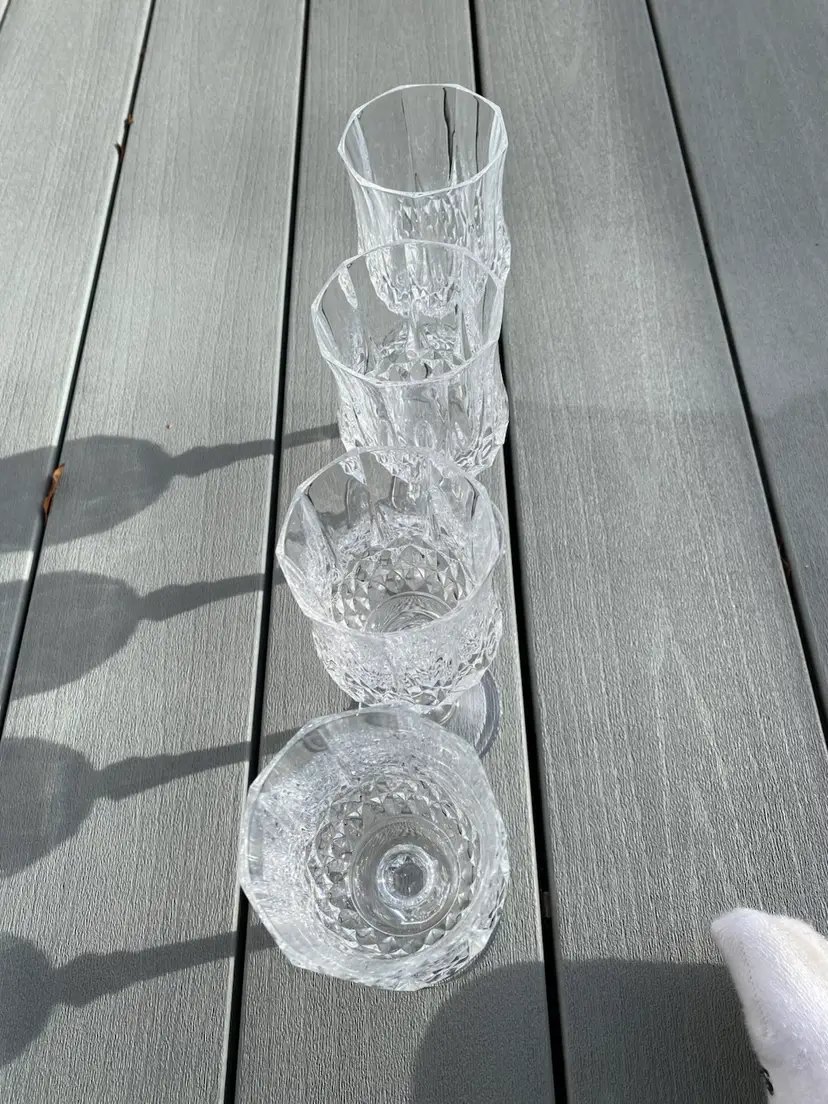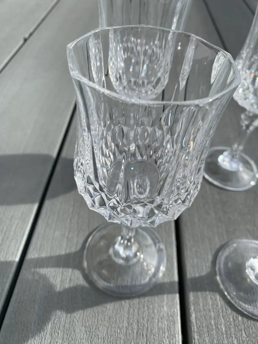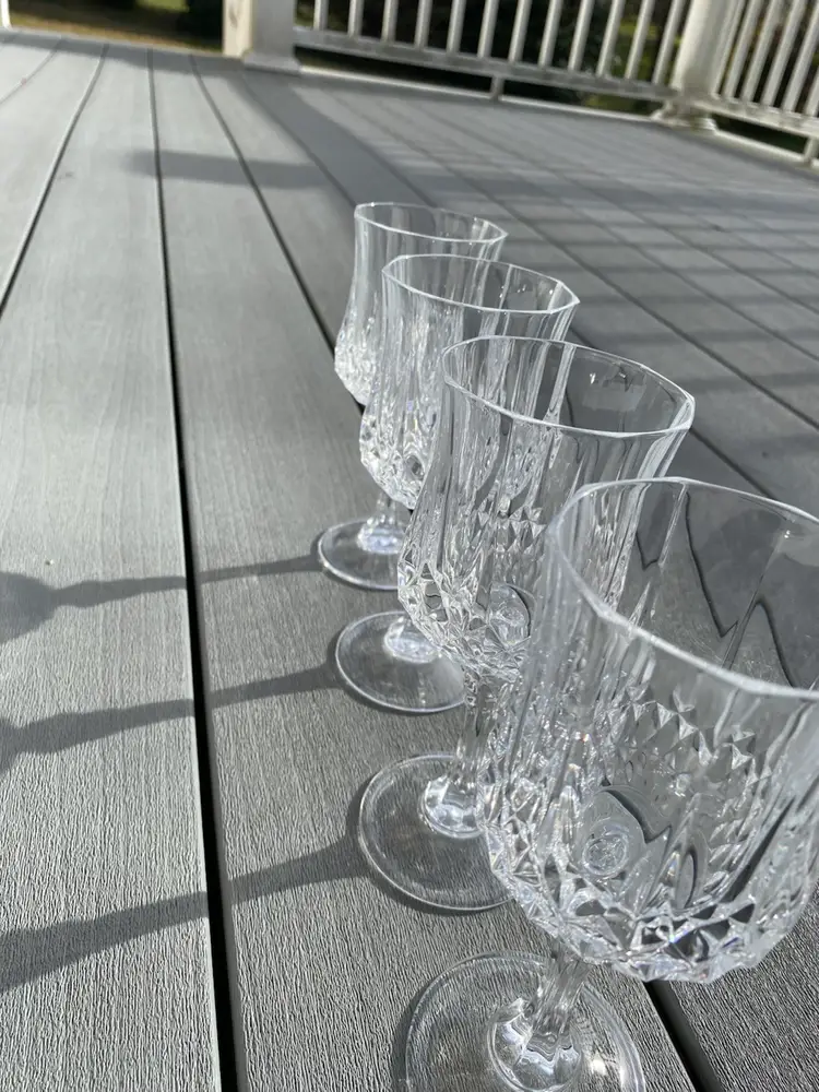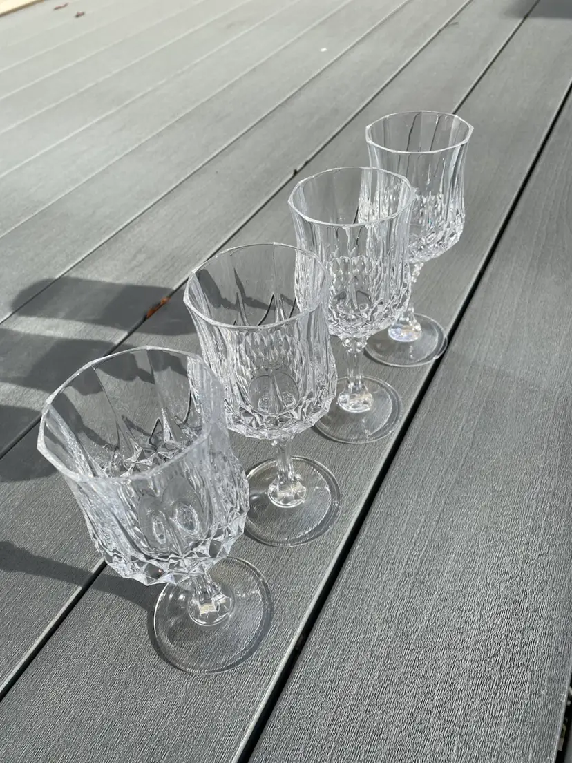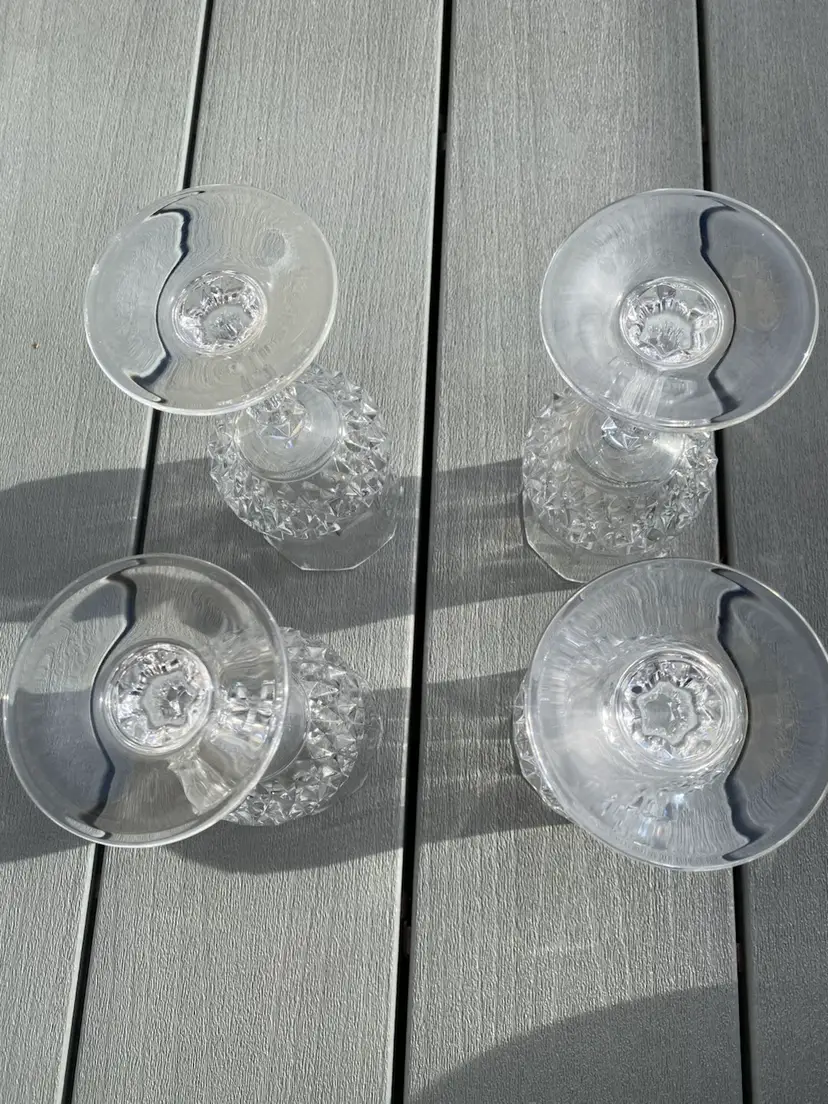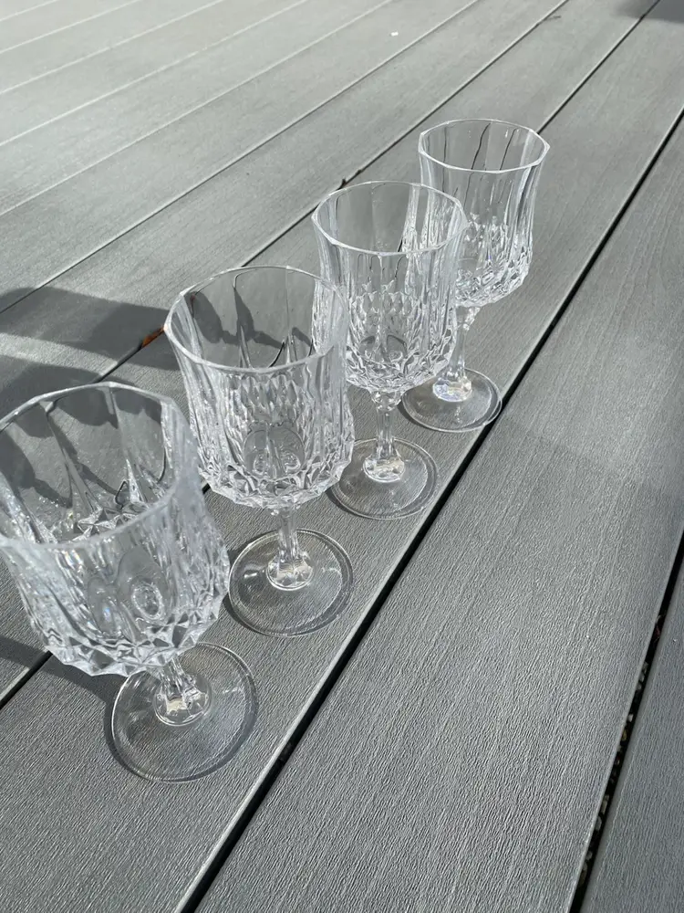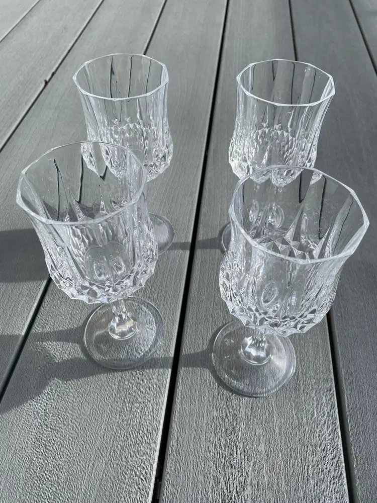 This is a stunning set of 4 vintage CRISTAL D’ARQUES LONGCHAMP wine glasses. This style of glass first created in 1968 features a diamond-pattern cut-glass design. The glasses are made of clear non-leaded crystal. These glasses are approximately 7 1/4” tall with a 3” mouth and are in excellent like new condition. These gorgeous glasses would be a lovely addition to any dining table.