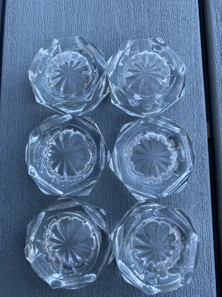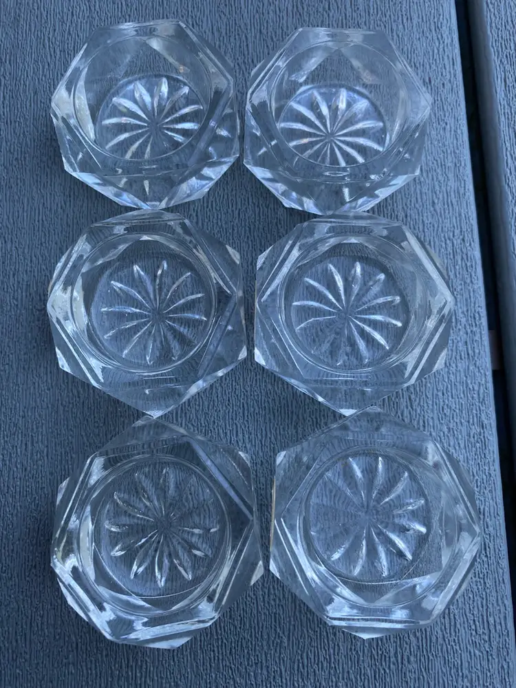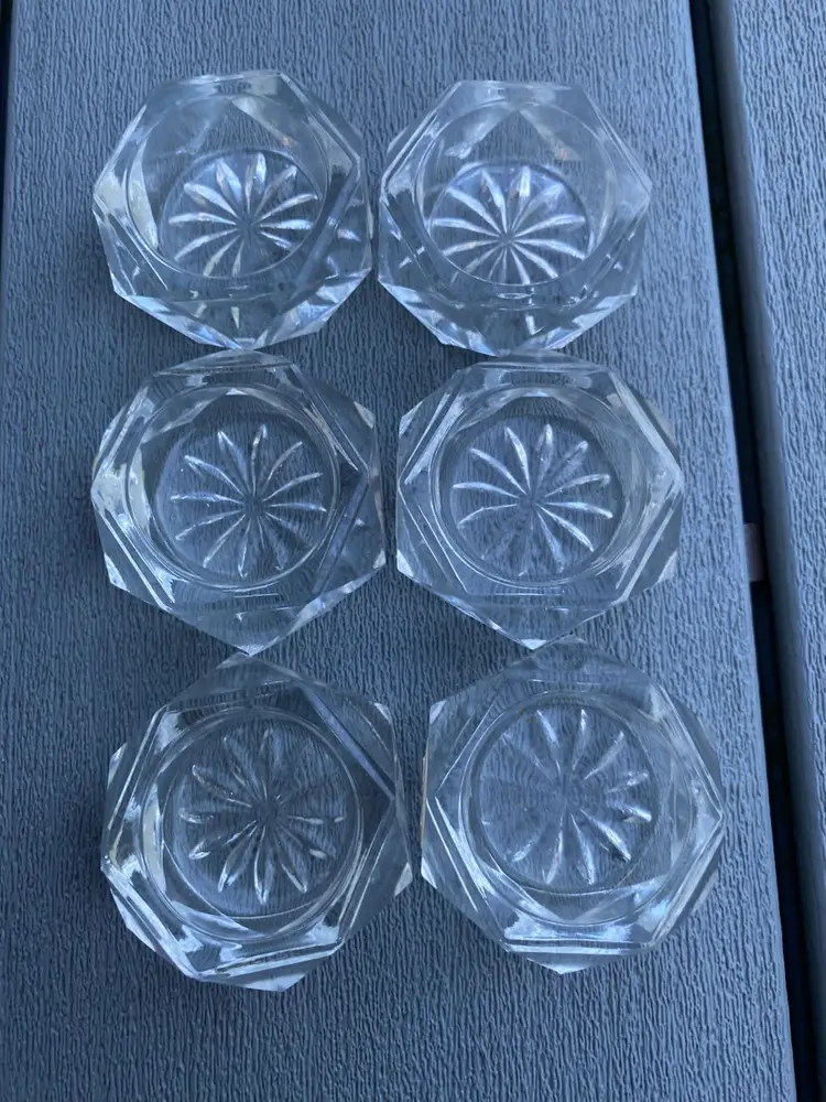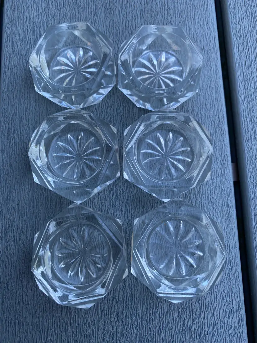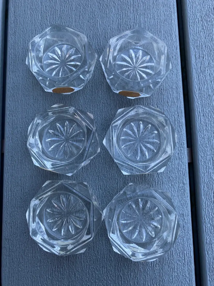 This vintage set of six new BOHEMIA CRYSTAL SALT CELLARS is a beautiful addition to any dinnerware collection. The diamond cut pattern, star on the bottom, and clear color add an elegant touch to your table setting. The salt cellars are pristine new condition, all with original labels. Each salt cellar measures approximately 2 1/2” by 2 1/2” by 1”. Add a touch of elegance to your table setting!
