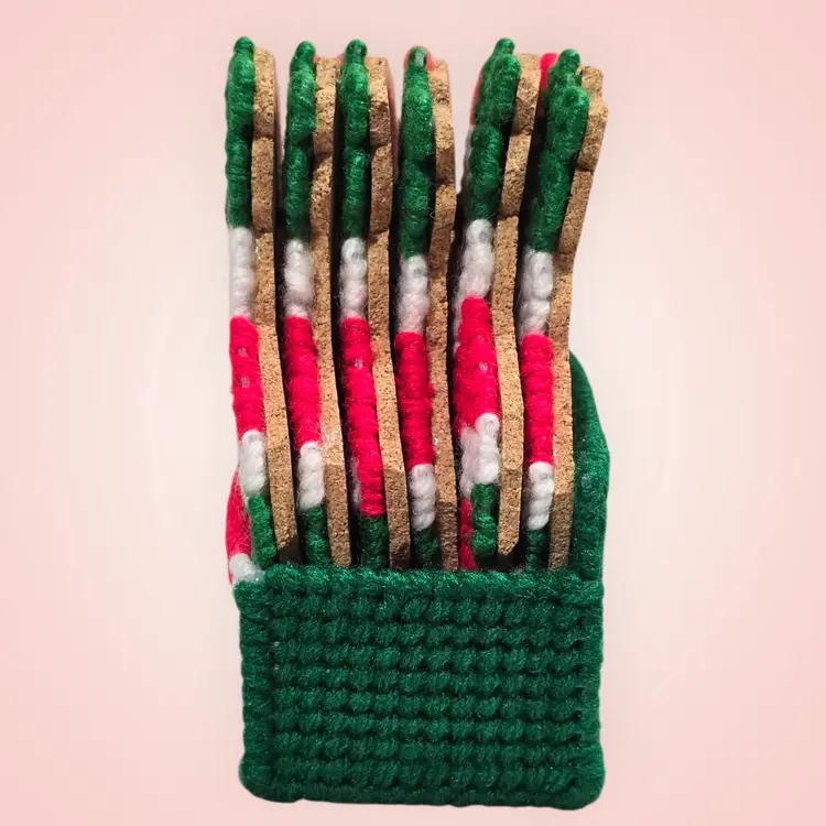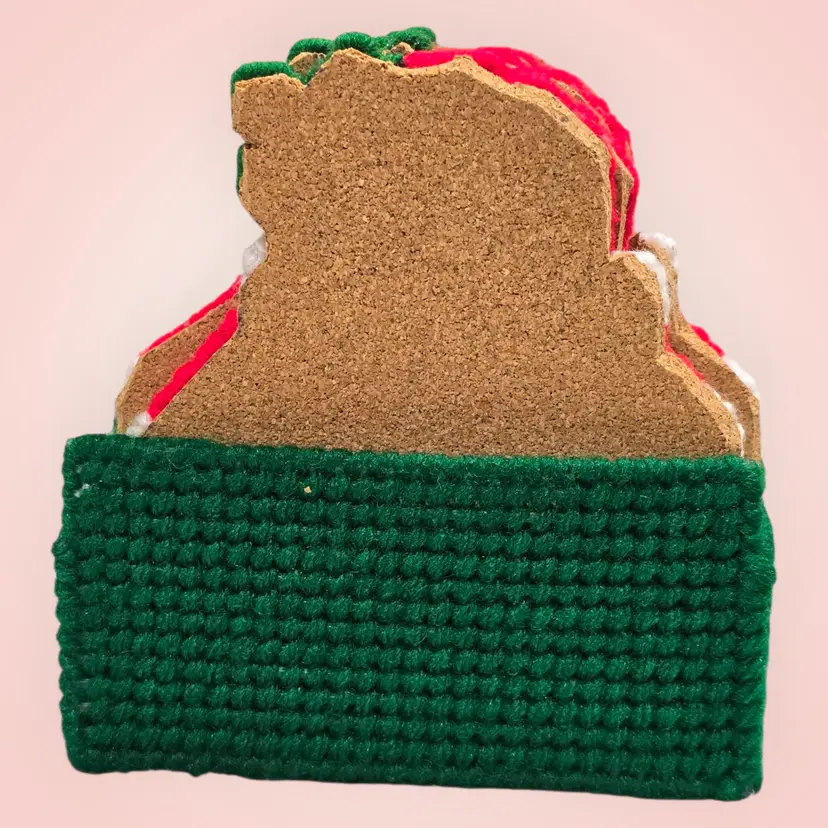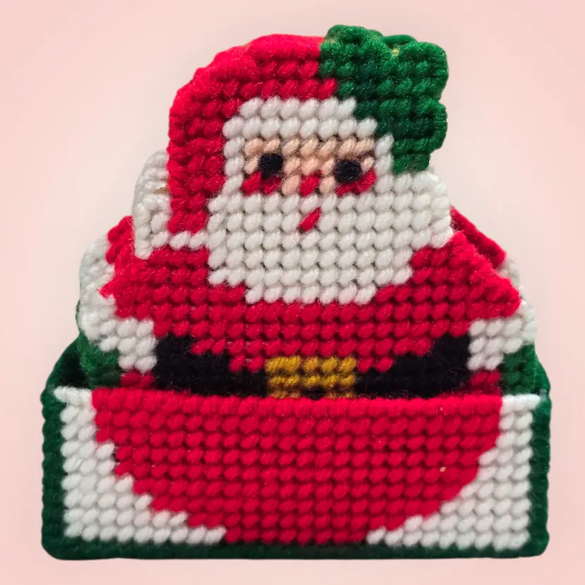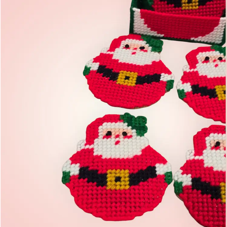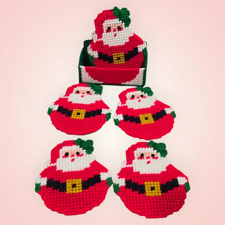 Set of 6 Vintage Handmade Plasticanvas Santa Claus Drink Coasters in Holder