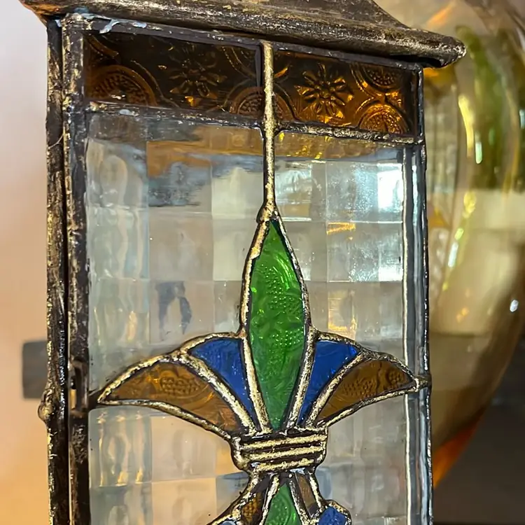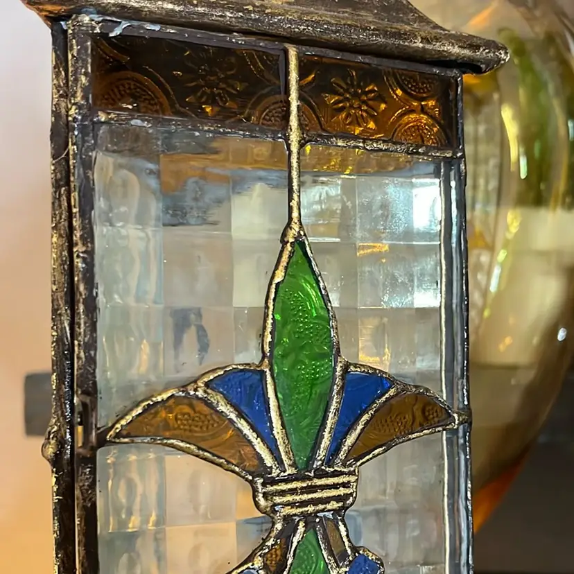 These tea light candle lanterns are gorgeous! Made of metal and glass. The large stands at 15' tall and the small stands at 12' tall. They are in excellent condition