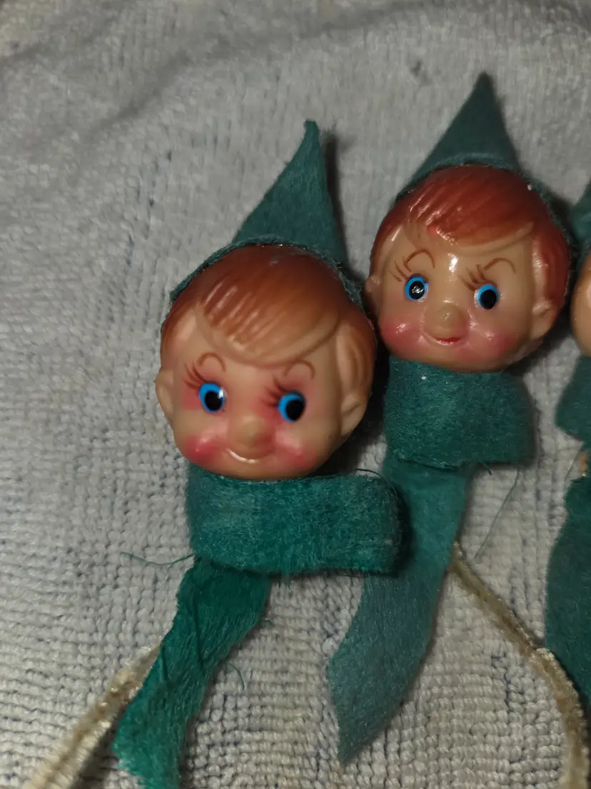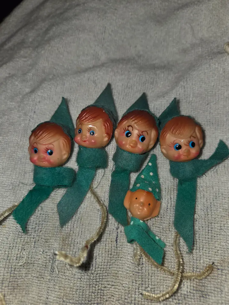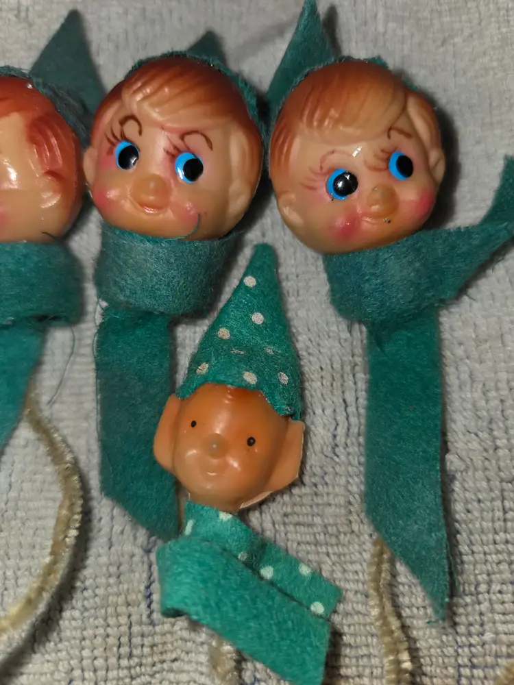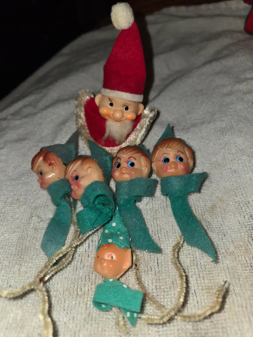 Cute vintage set of wreath or craft elves and a Santa. 6 pieces in the set. Felt with plastic faces.