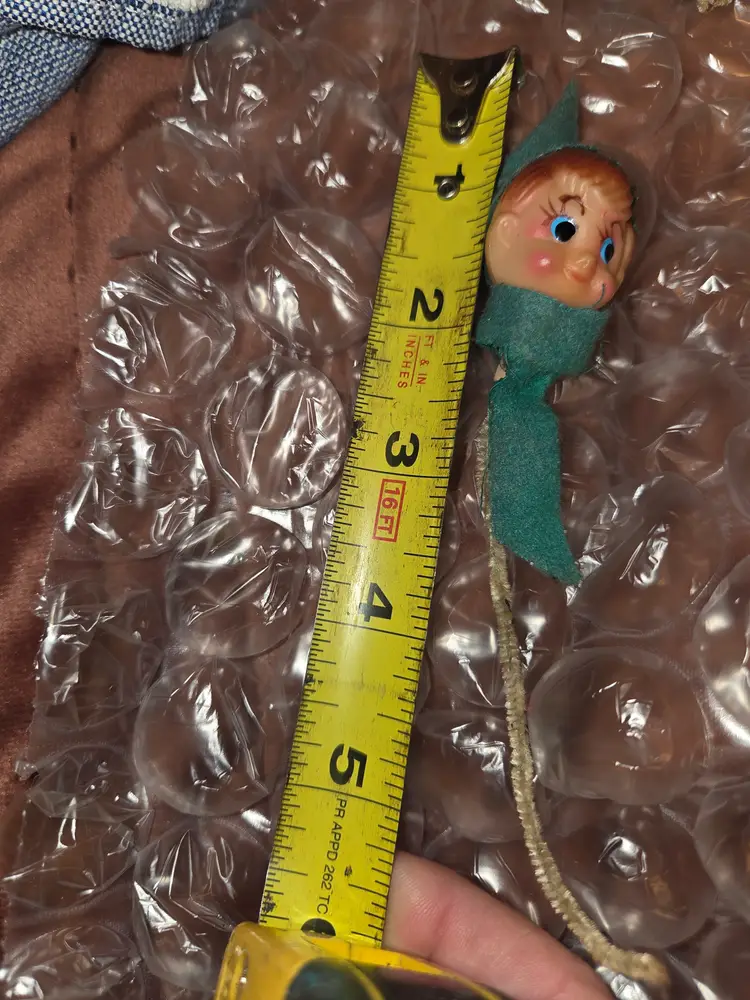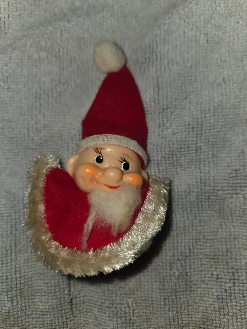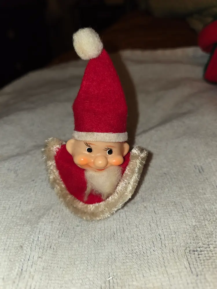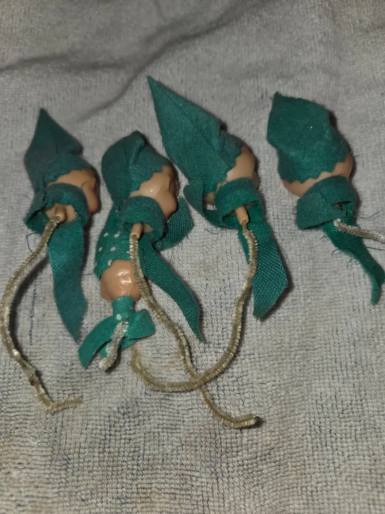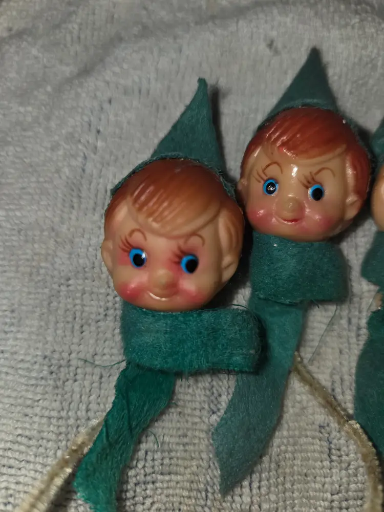 Cute vintage set of wreath or craft elves and a Santa. 6 pieces in the set. Felt with plastic faces.