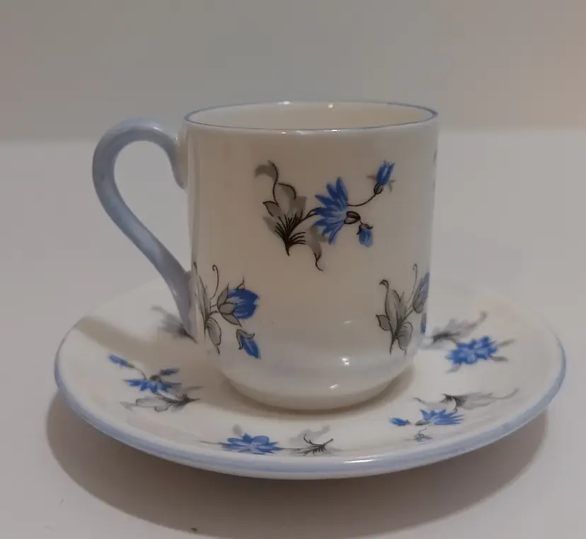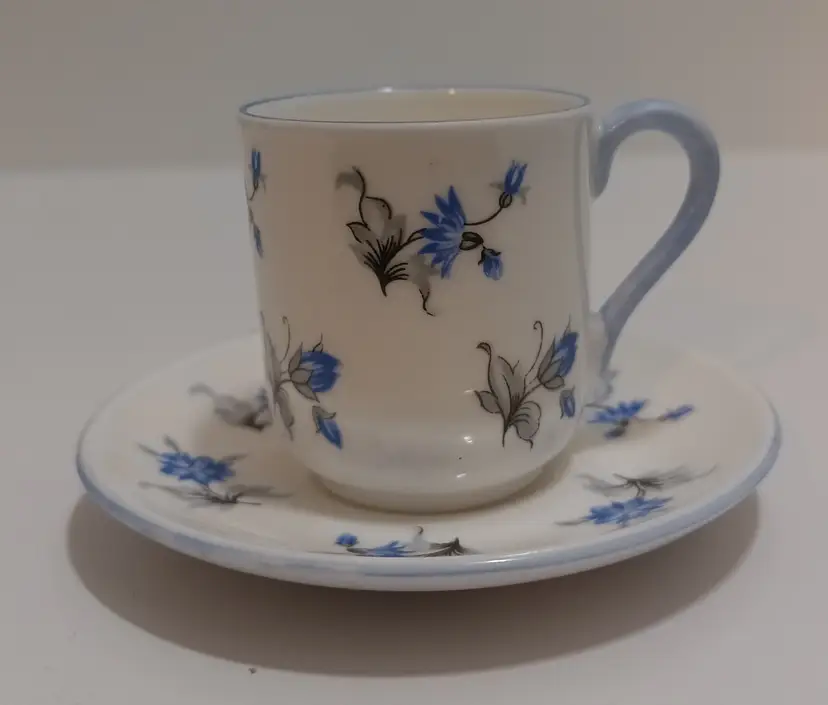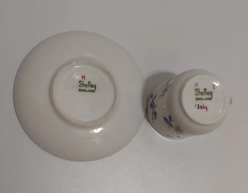 Sweet Little Shelley Miniature Cup & Saucer; Adorable Little Blue Flowers & Buds Adorn This Darling Set! Marked Shelly England & #13864; No Chips or Cracks; Cup 1 5/8" T x 1.25" W; 2" W from Handle; Saucer 3" Diameter