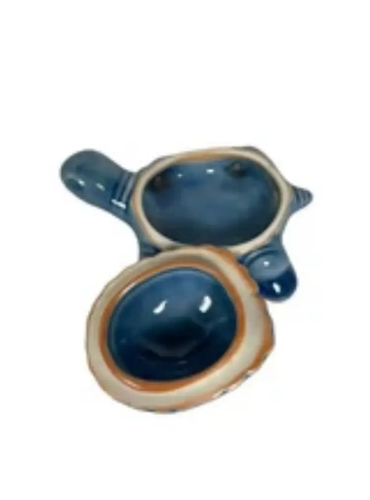 Wood ash glaze. Light crazing. Height with lid 2”, length 4.5”, width 3”, depth .25”. No chips or cracks.
