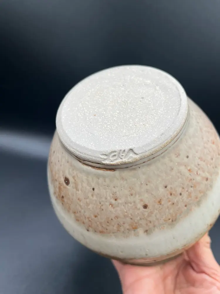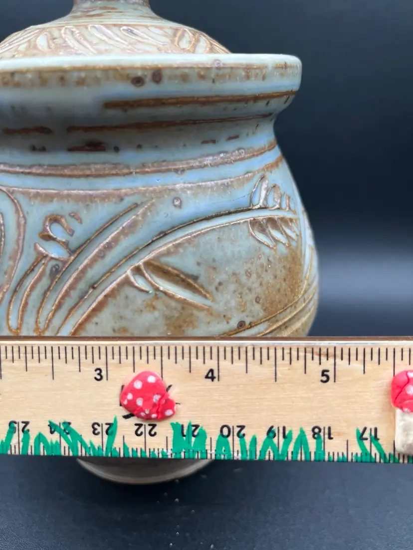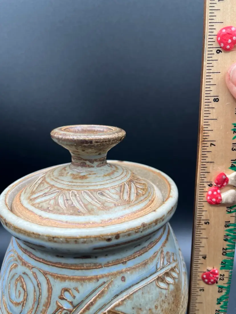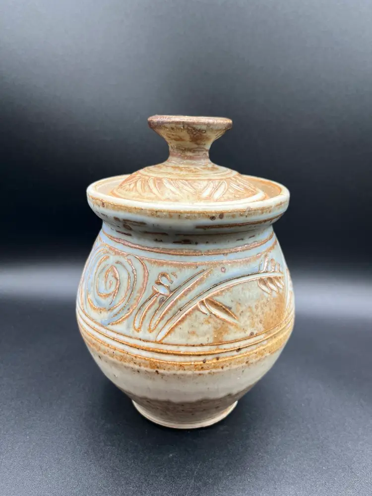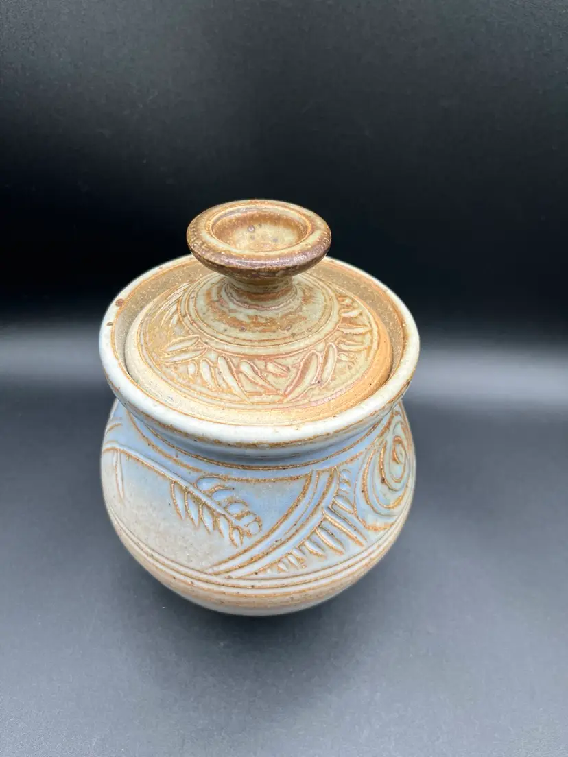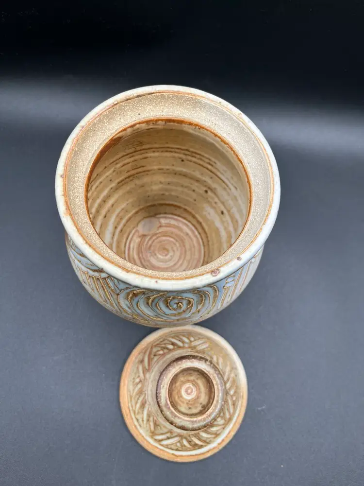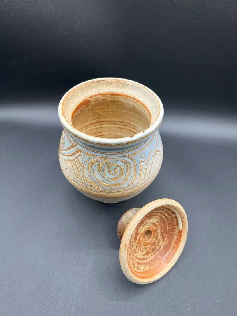 Gorgeous Signed Art Pottery Tan & Blue Harvest Swirl Motif Stoneware Storage Jar With Lid 7.5”