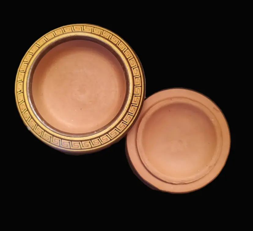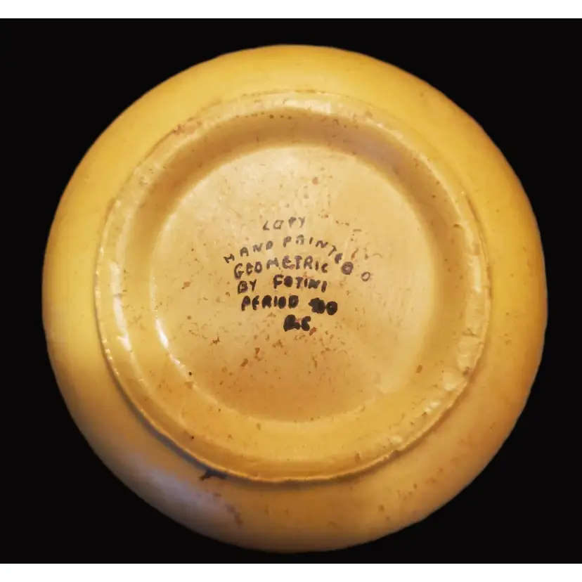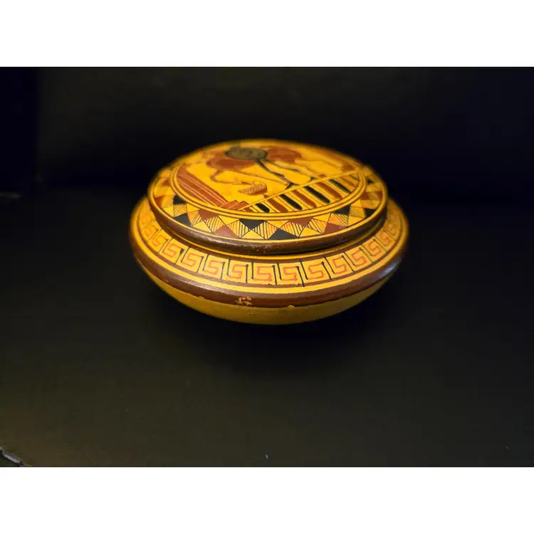 Vintage Greek Geometric Trinket box. It is a Hand painted museum copy 700 BC by Fotini. Made in Greece. It measures 3 1/2" round and 1 1/4" high