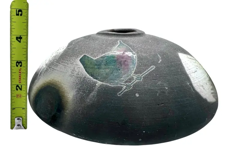 Raku vase with metallic birds. It is signed by Sharon Ellsworth.