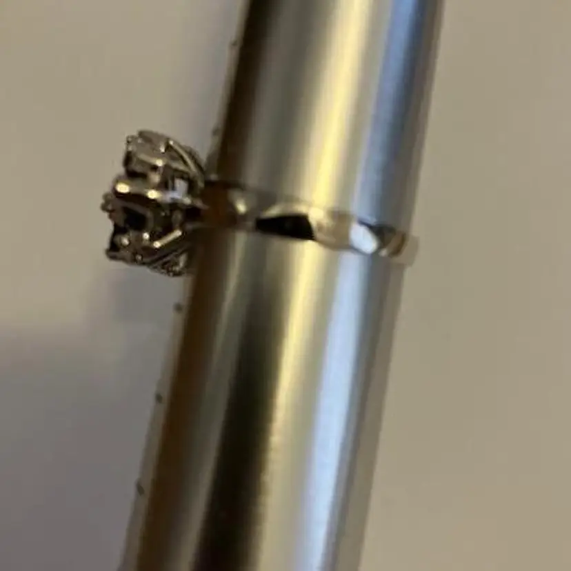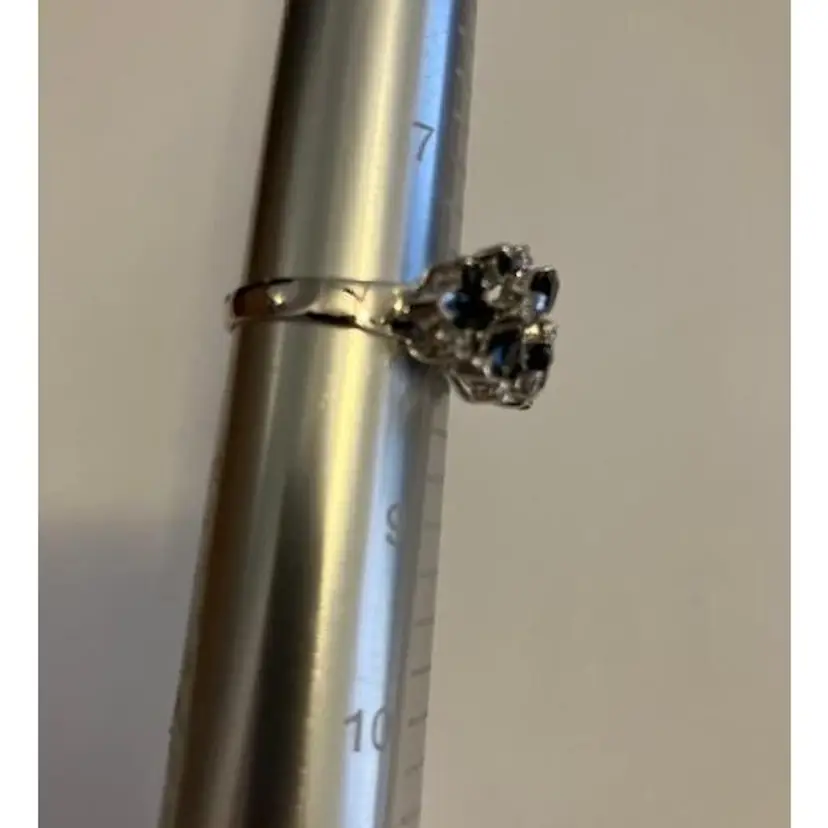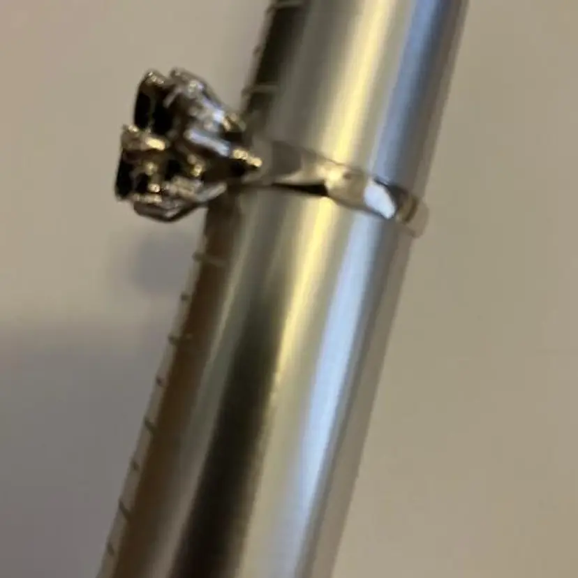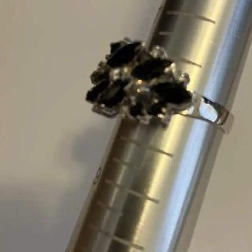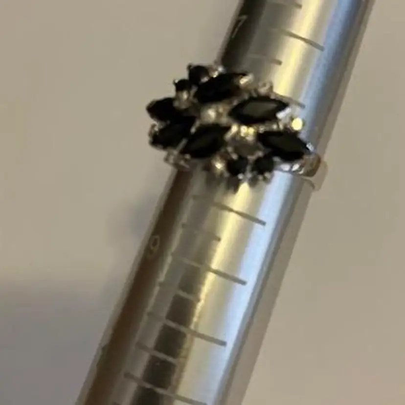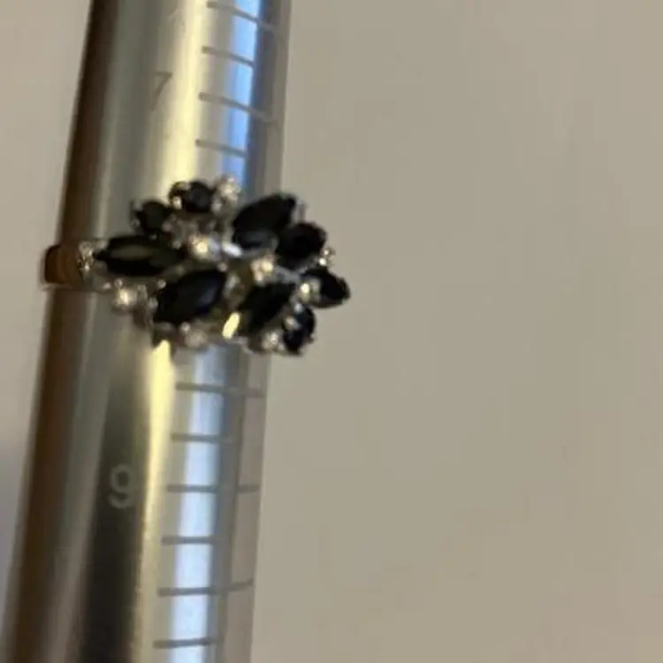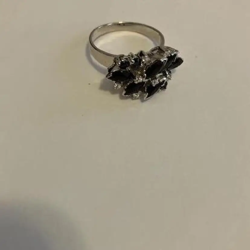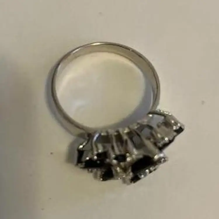 Silver tone with prong set marquise shaped & round black stones and round white rhinestones. Size 8. No marks or signatures.