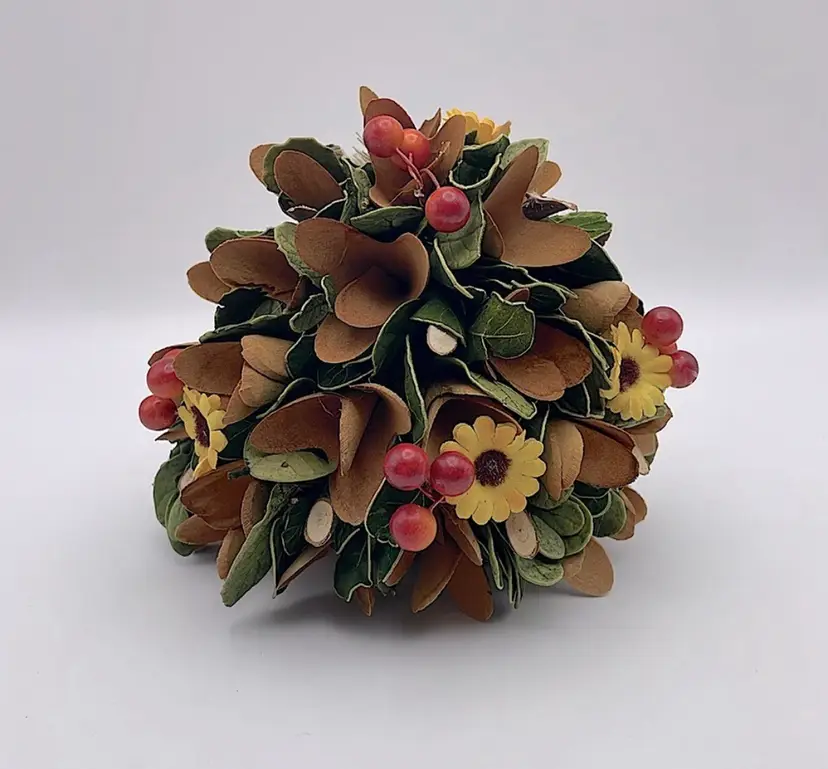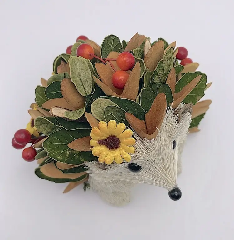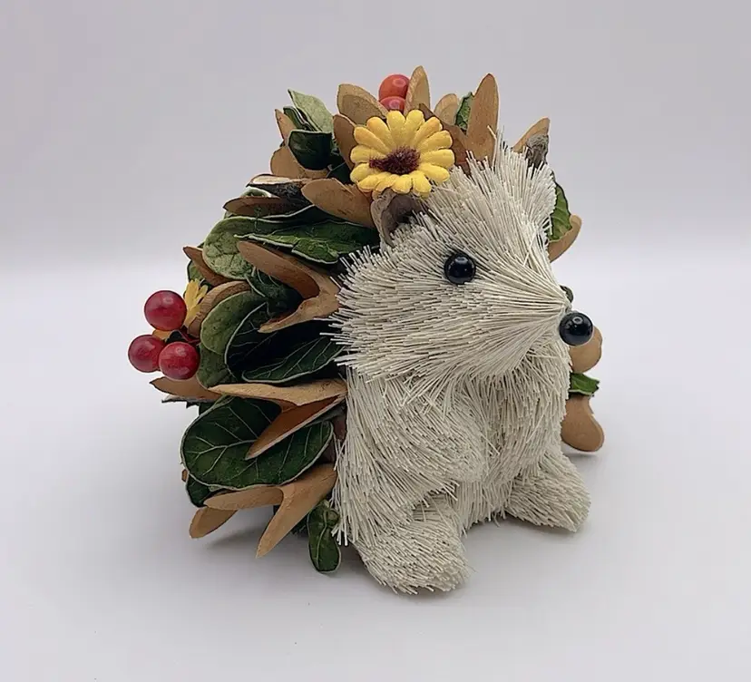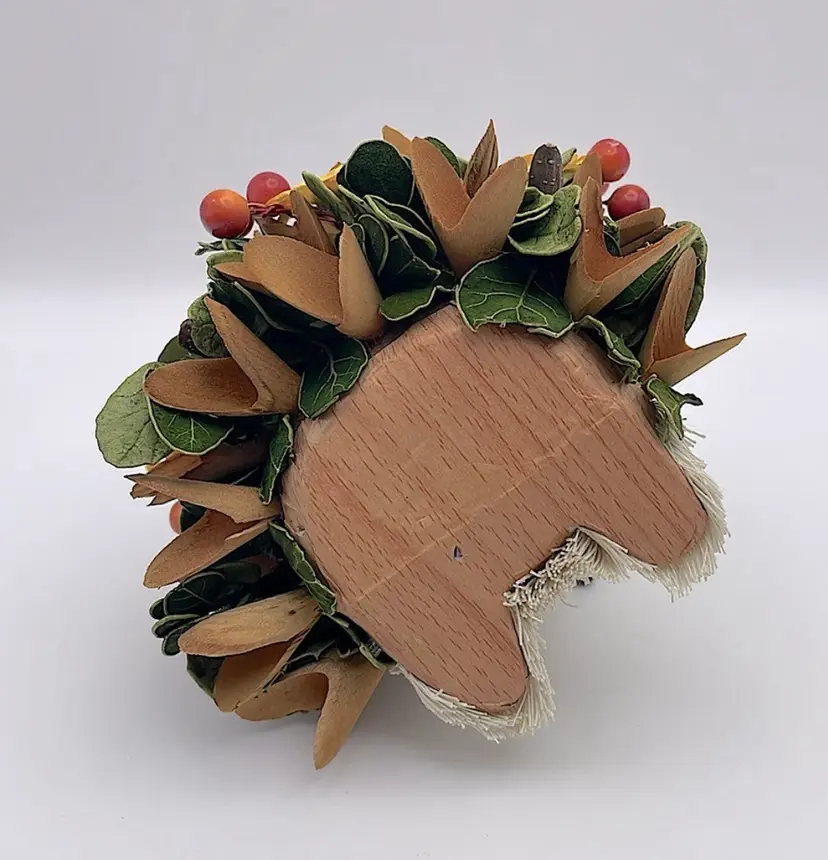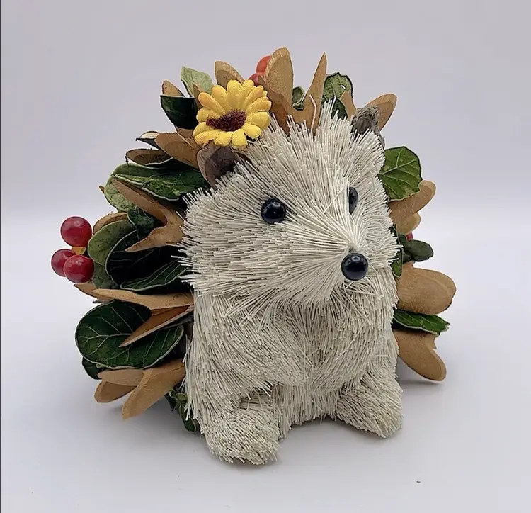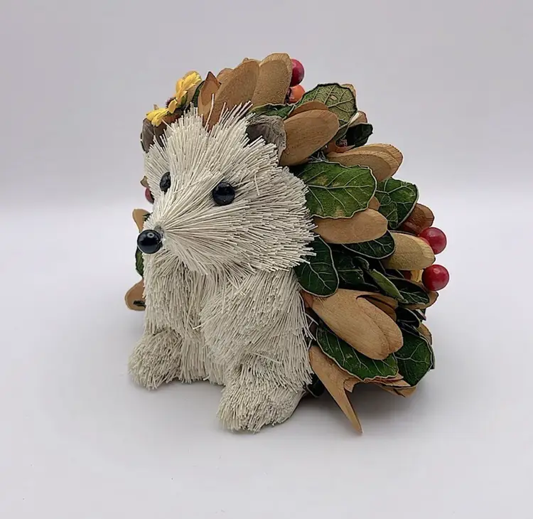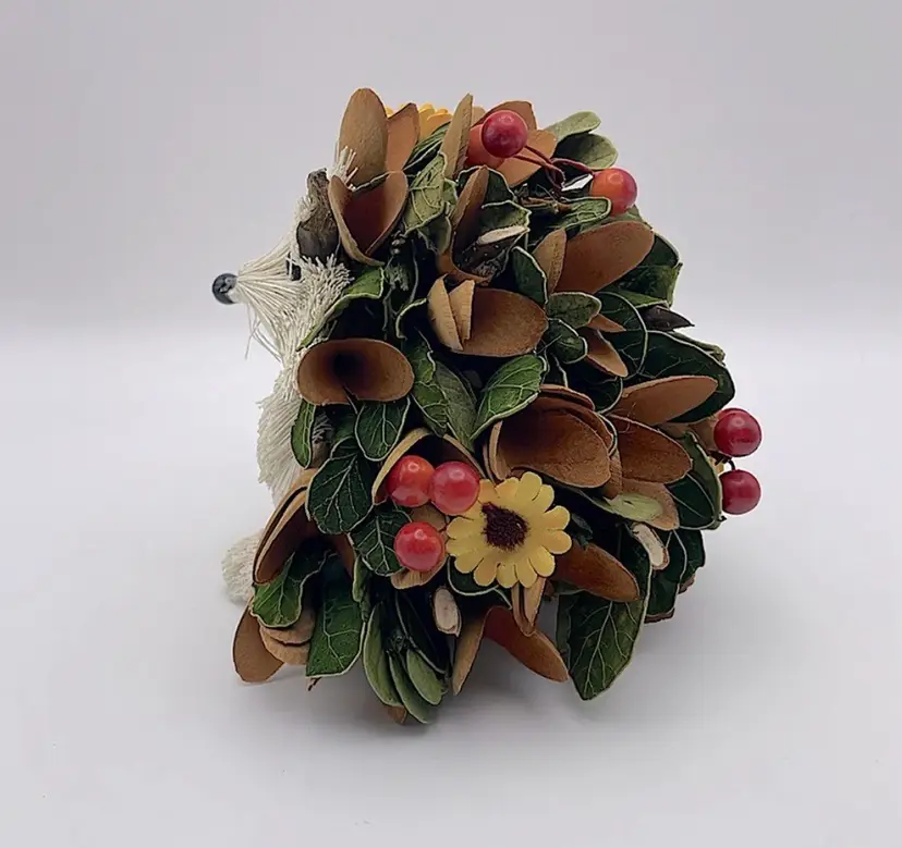 Sisal Hedgehog, Faux Flowers/Berries/Leaves along with Wooden Accents, 5” Tall Please see pictures for measurements.