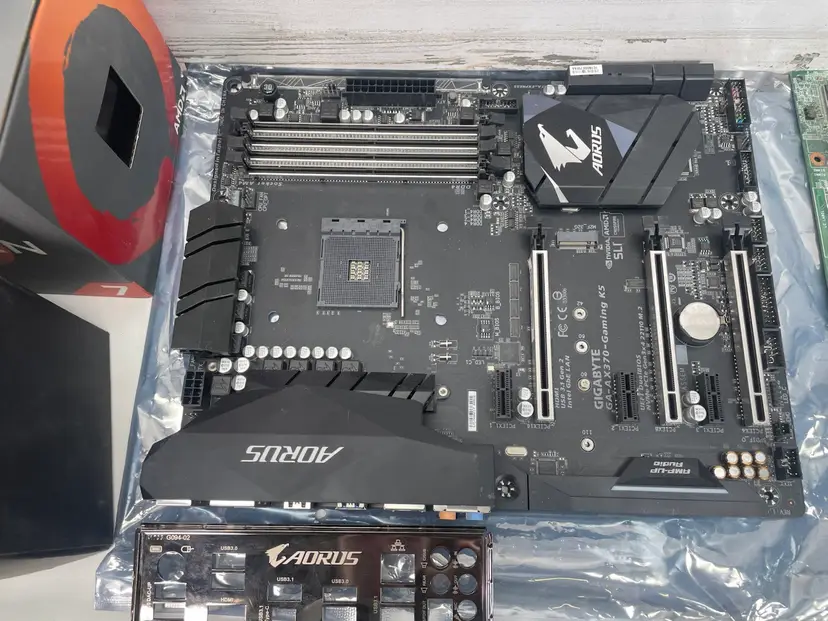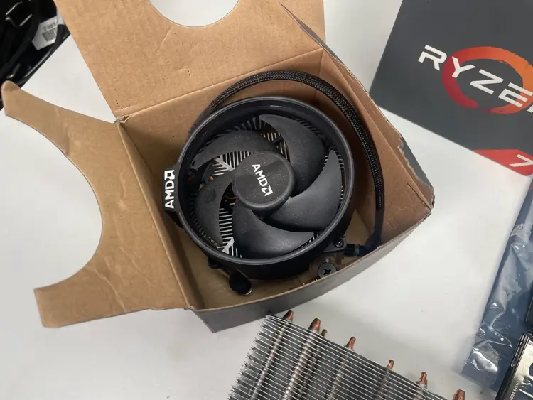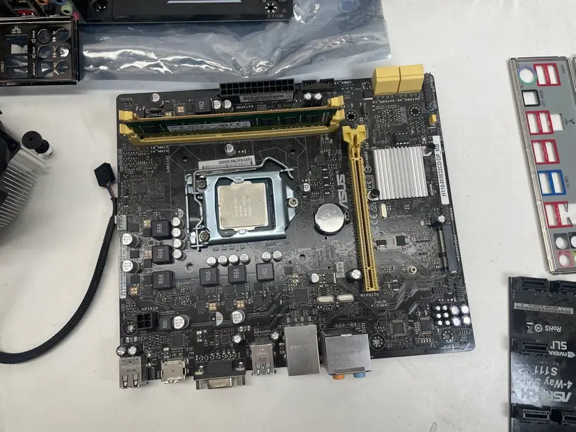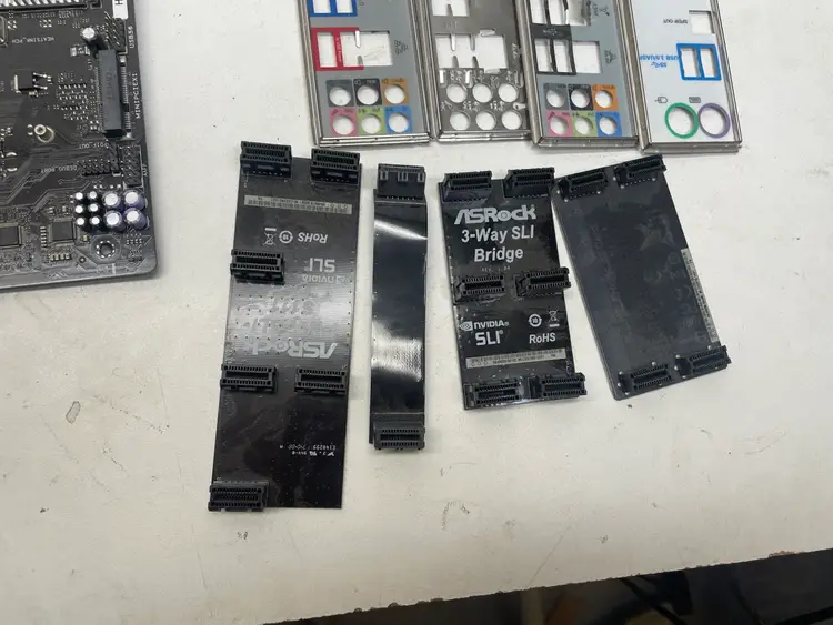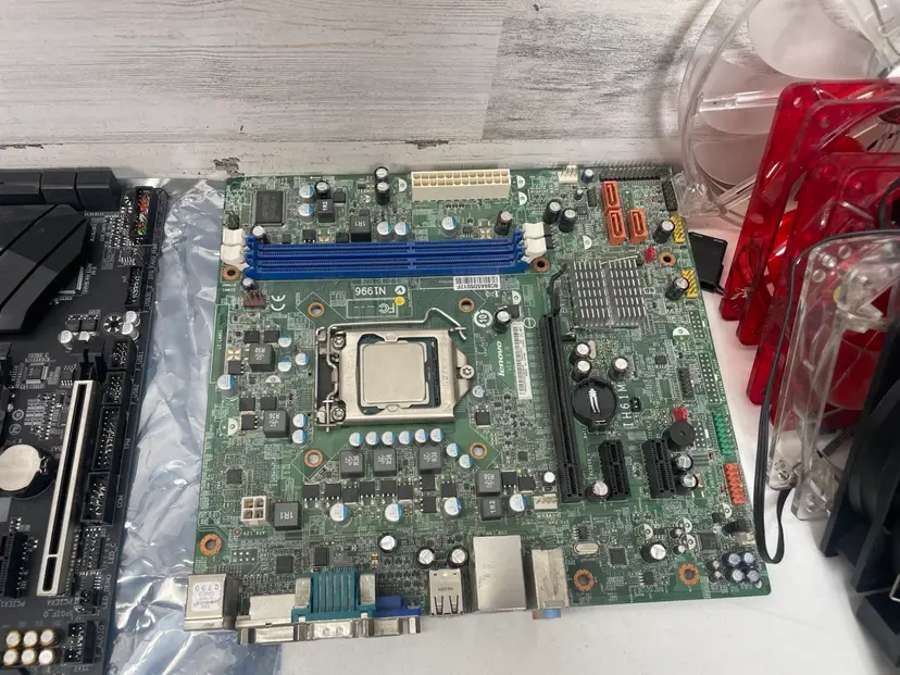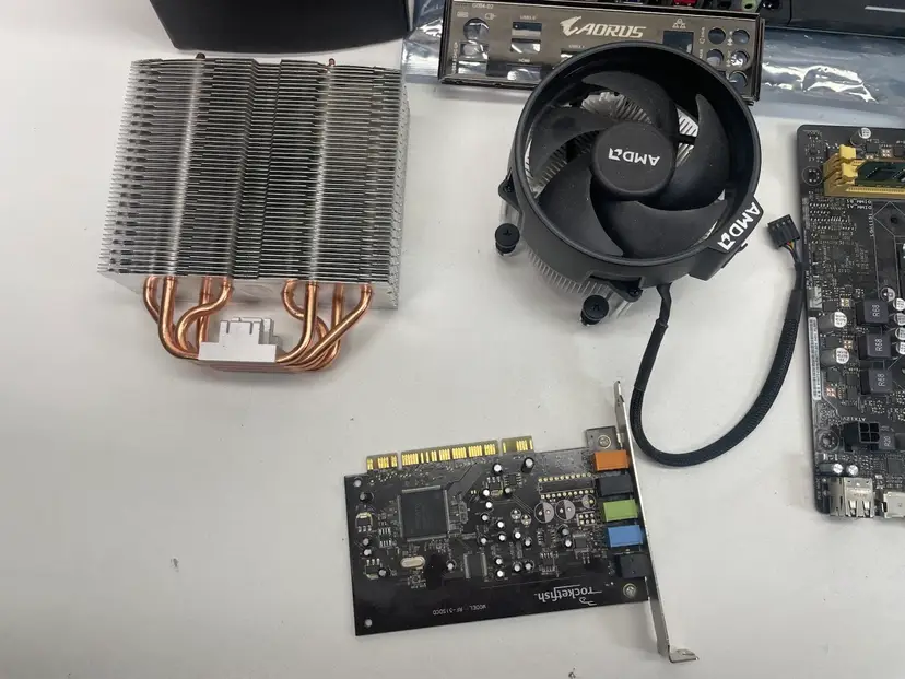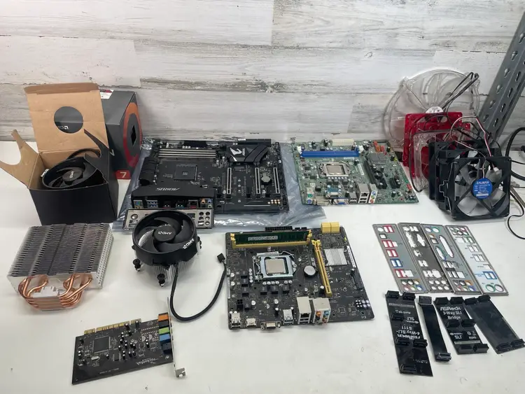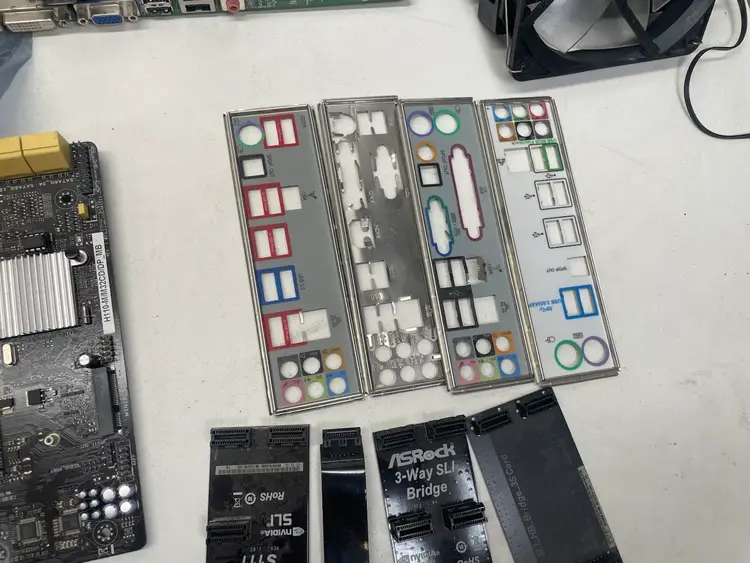 Small lot of computer equipment. Untested 3 motherboards 2 cpus 3 and coolers 1 cooler master cooler 1 audio jack 4 sli bridges 1 ram stick 5 back plates 7 case fans