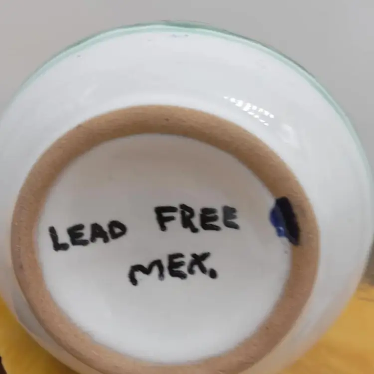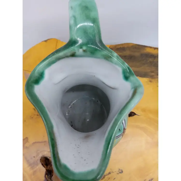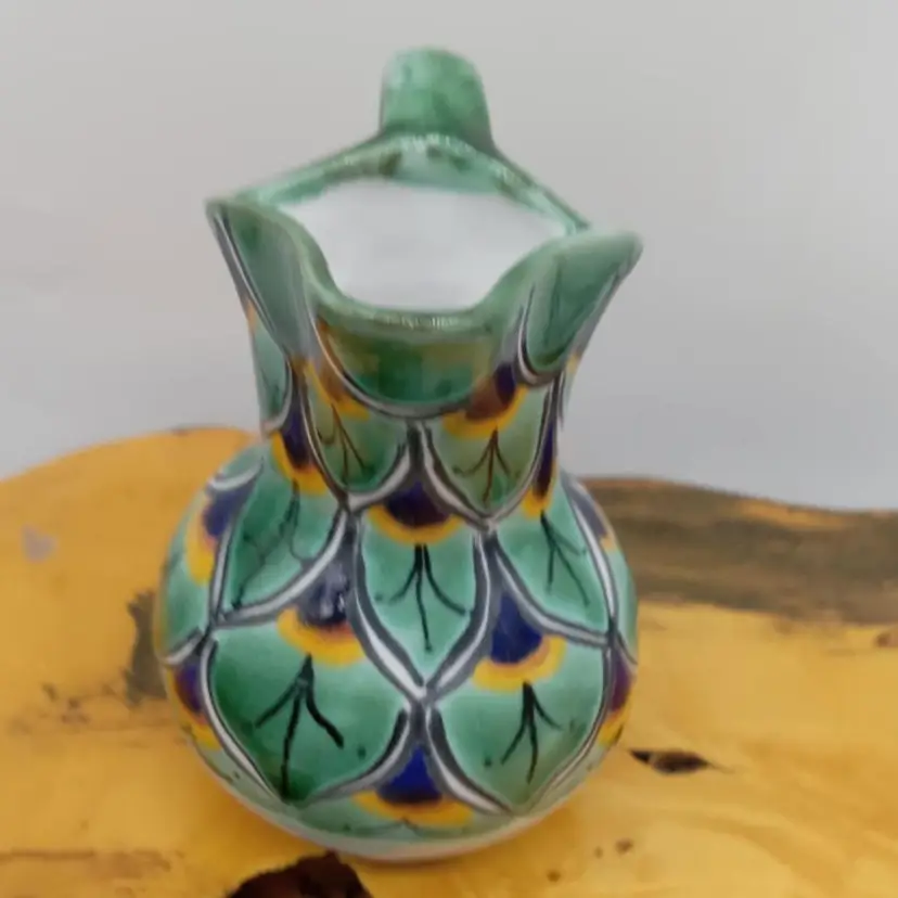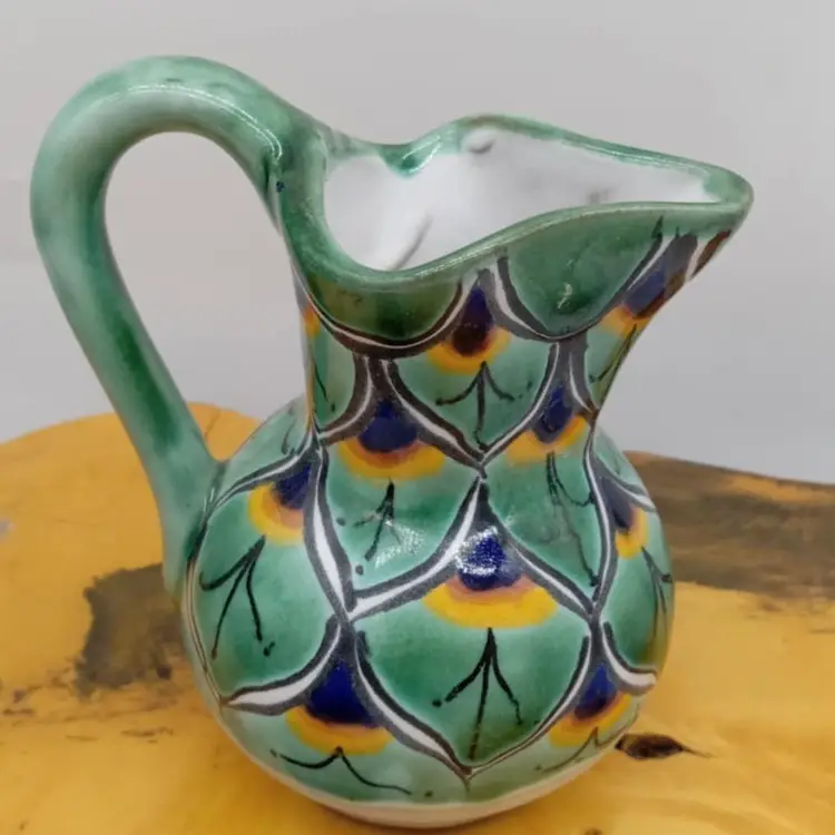 Here's a beautiful pottery pitcher made in Mexico. It's blue, green and yellow. It's 5.5 inches tall and has no chips or cracks.