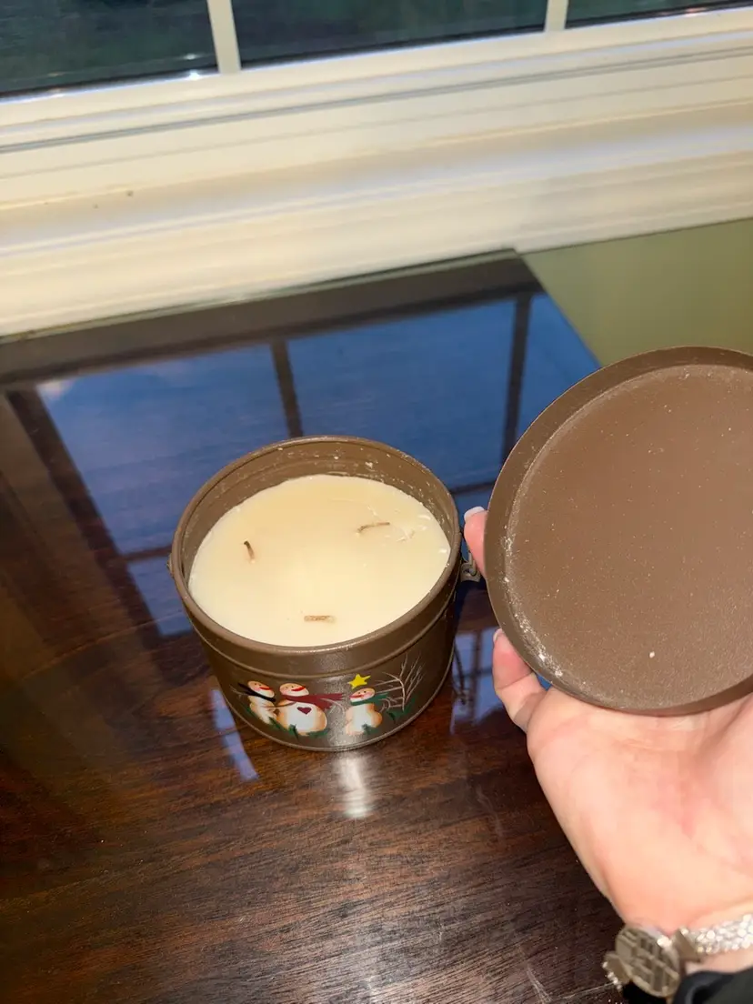 This small primitive snowman metal tin/candle is a festive and charming addition to your Christmas decor. With its round shape, snowman pattern, and multicolor design, this rustic/primitive style piece is perfect for adding a touch of holiday cheer to any room. The tin container has a candle inside. The handle and lid make it easy to transport and display, whether mounted on the ceiling or wall. Made in the United States, this 3" tall snowman tin/candle is a delightful home accent for the holiday season.