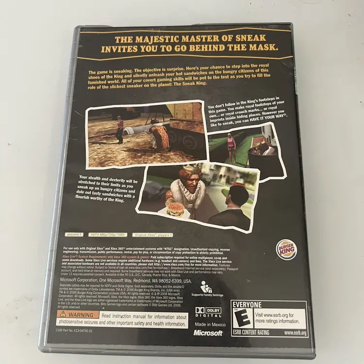 Region Code: NTSC-U/C (US/Canada) Platform: Microsoft Xbox 360 Release Year: 2006 Rating: E-Everyone Features: Manual Included Publisher: Microsoft Genre: Action/Adventure, Adventure, Action/Adventure Game Name: Sneak King