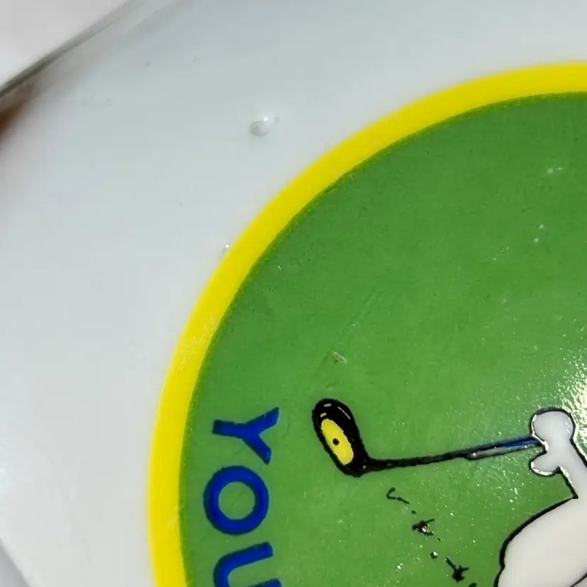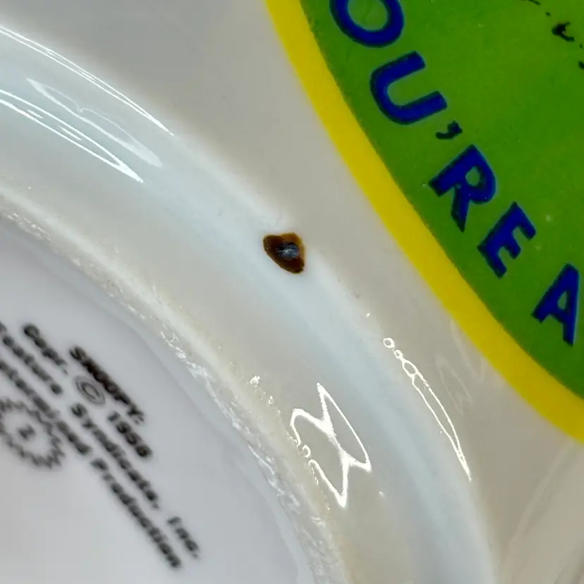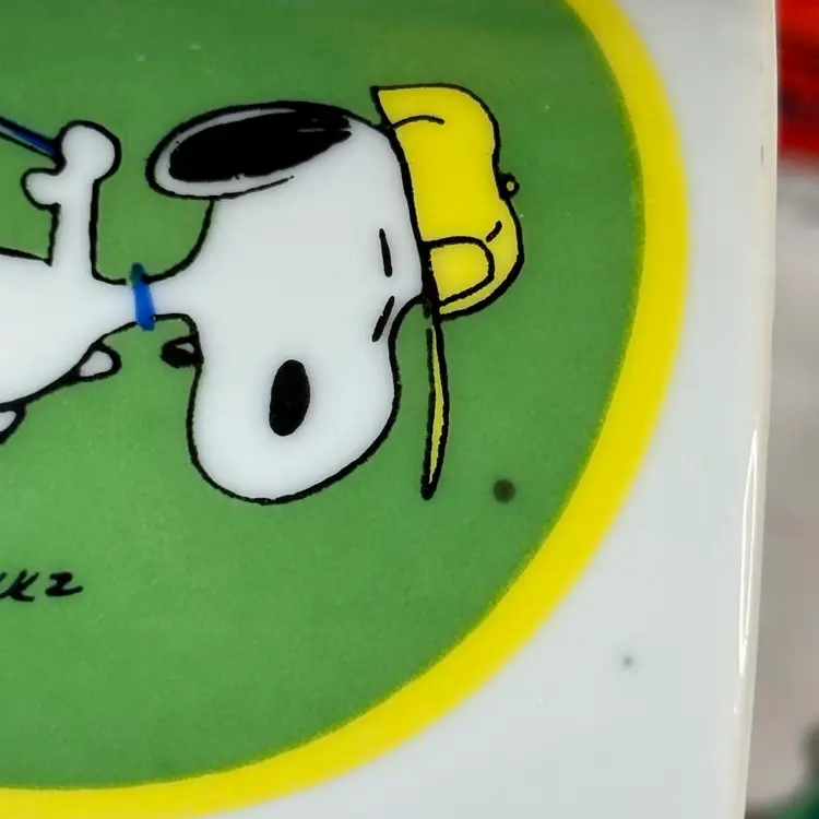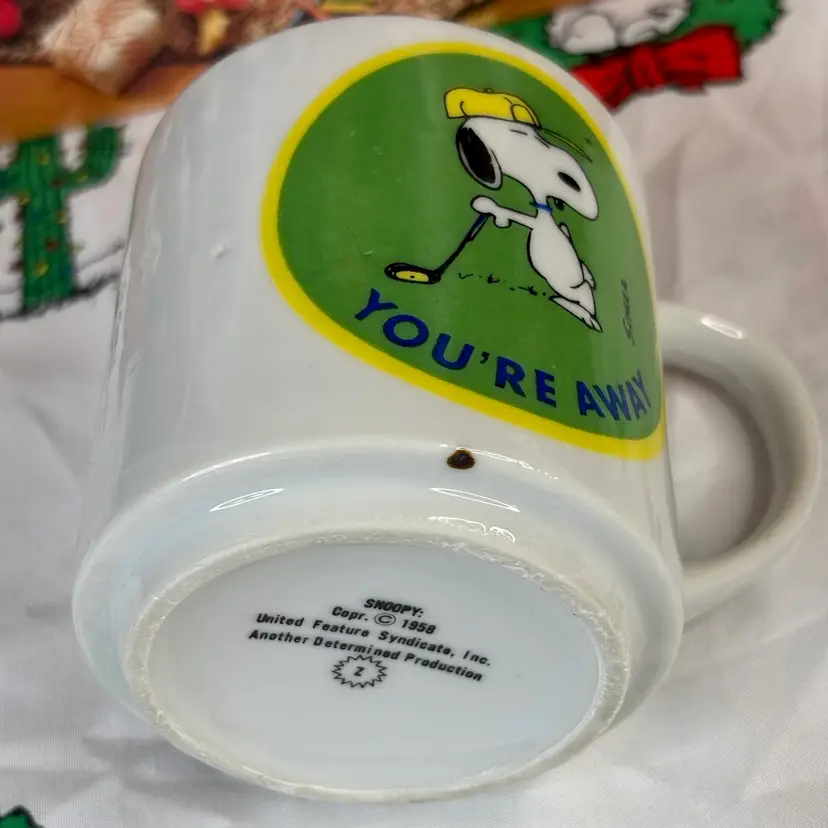 This cute mug is smaller than the average mug. It features Snoopy with a golf club and hat, and says “You’re Away.” Made by Determined Productions. Has some manufacturers defects in the ceramic as well as a burn(?) mark on the bottom rim. There are also a couple marks on the print as seen in the photos. Still a super cute mug to have in any collection!