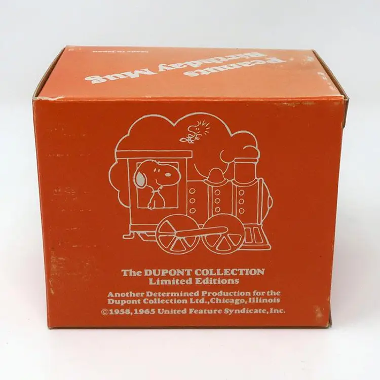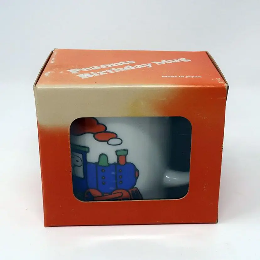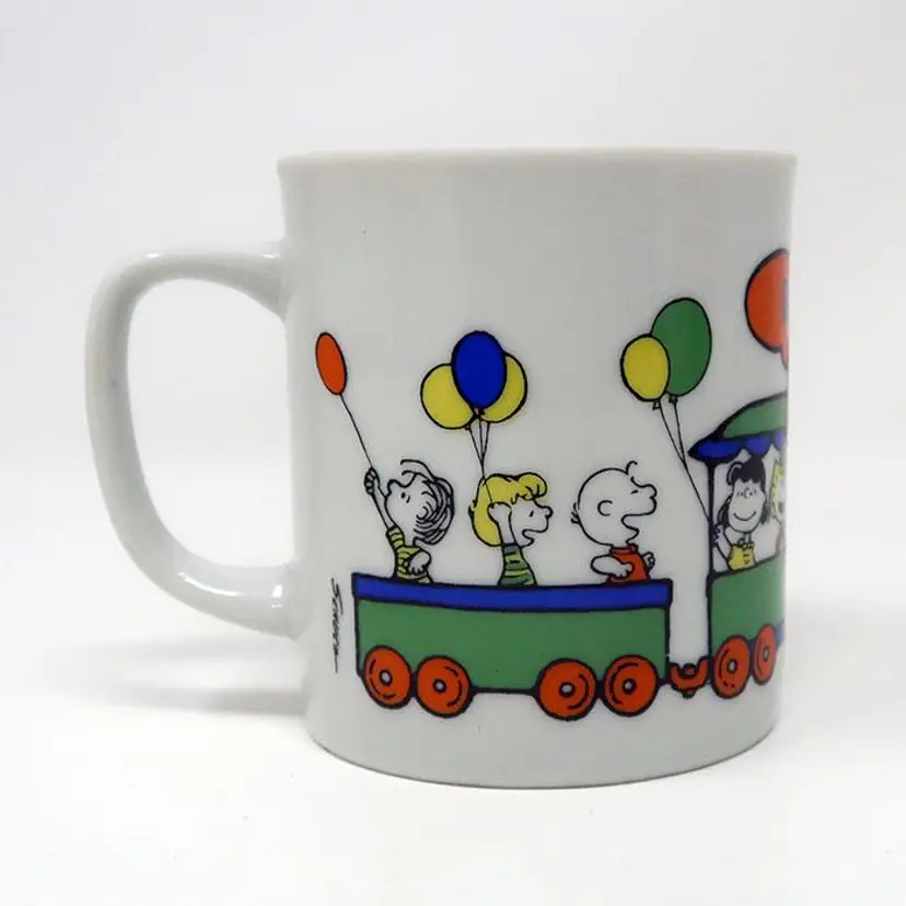 Celebrate birthdays with this charming Snoopy Happy Birthday Train Mug. Featuring Snoopy, Woodstock, and friends riding a colorful train with 'Happy Birthday' in the train's smoke trail. Made of ceramic, it's great for enjoying your favorite hot beverage. A delightful addition to your Peanuts collection or a thoughtful gift for a fellow fan. In excellent condition with some fading on the box. Made by Determined Productions.