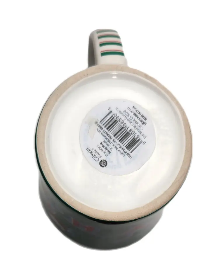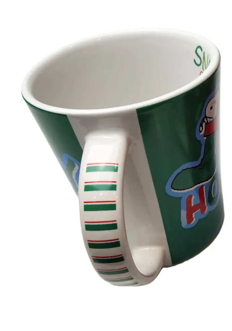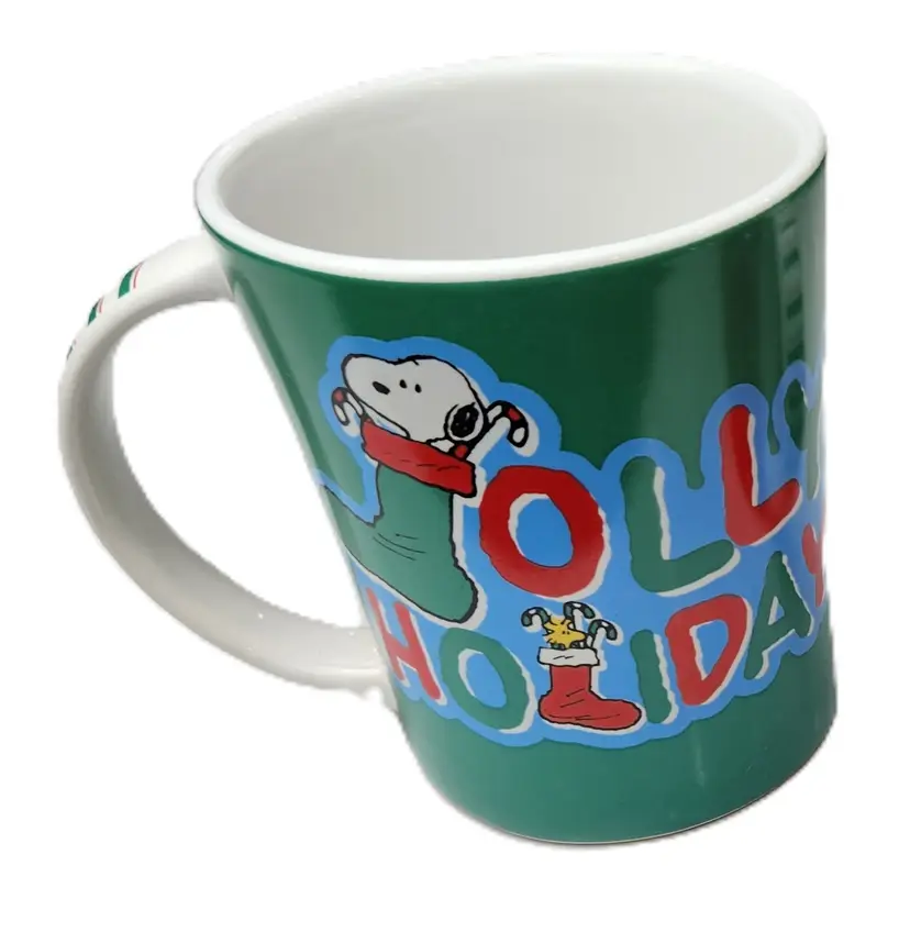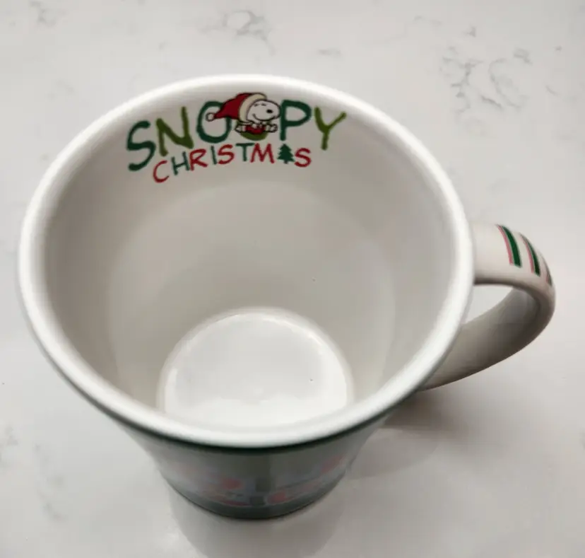Mug was displayed but never used. No signs of wear at all. Features Snoopy & Woodstock in a Christmas Stocking on outside and "Snoopy Christmas" with Snoopy in hat on inside rim. Made by Gibson. Measures approx 4.25" tall. Holds 15 oz. Nice big handle.