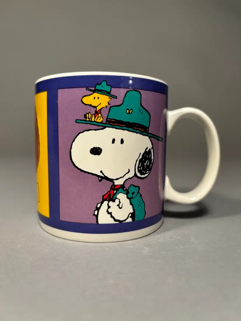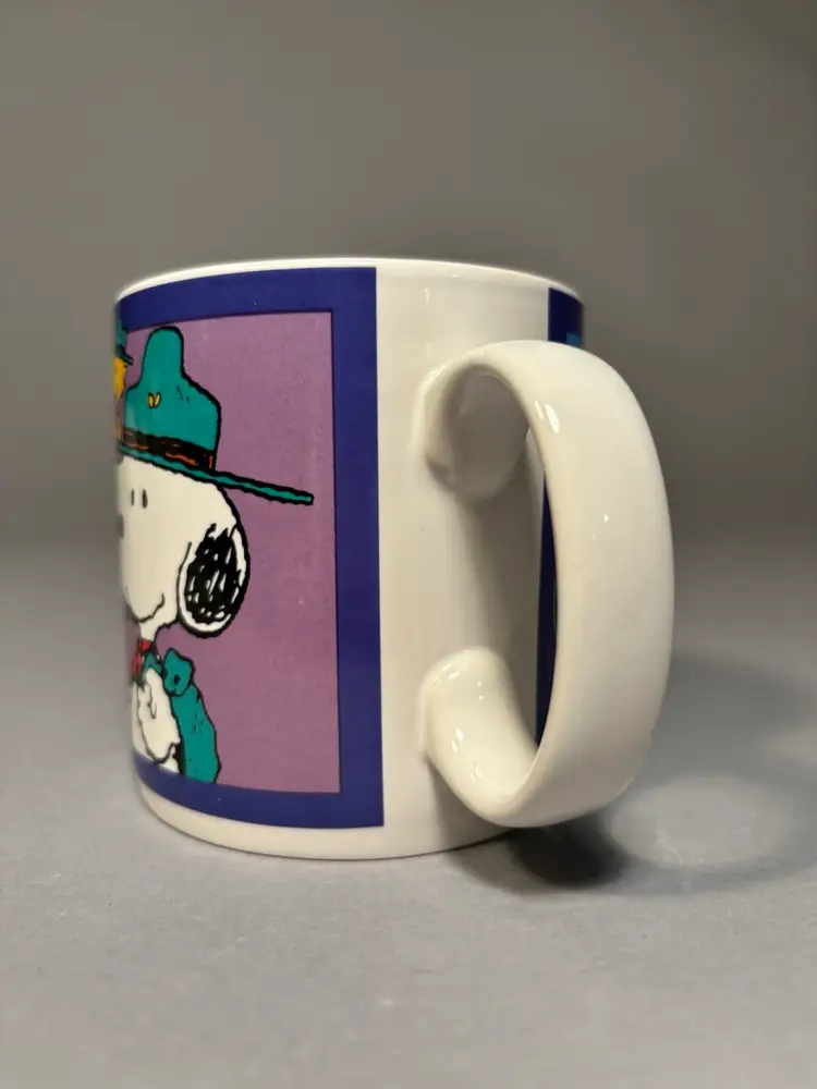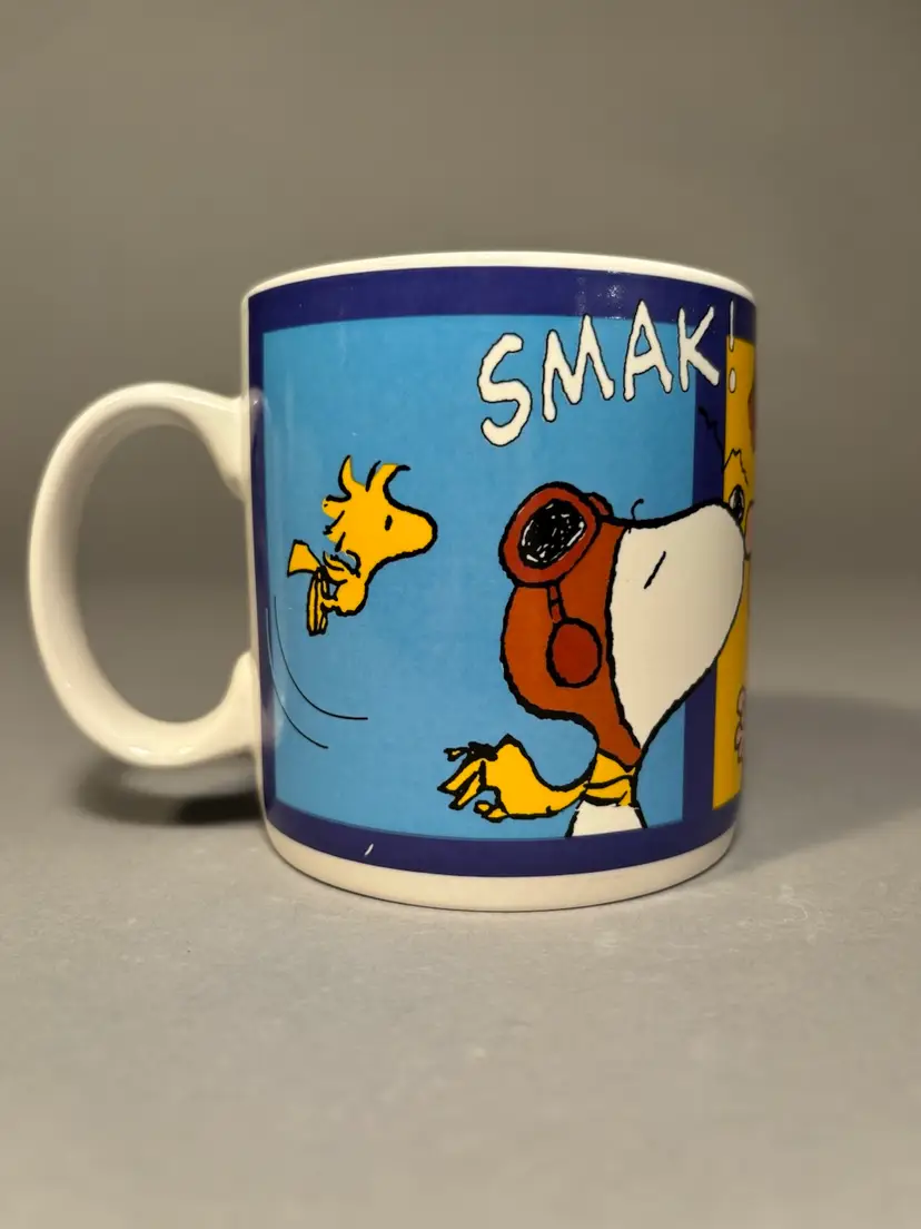 “Smak!” This vintage mug was produced by Sakura. It features Woodstock (as himself), the WWI Flying Ace, Peppermint Patty, Beaglescout Snoopy, and Beaglescout Woodstock. Please note that while most of the white spots in the photos are due to lighting reflections, there is one small scratch on the bottom border in the first photo. I am not sure if this was a manufacturing defect or if it happened later, but it does not detract from the overall aesthetic of this mug’s design. As Snoopy says in the comics, “She’ll feel better now for weeks!”