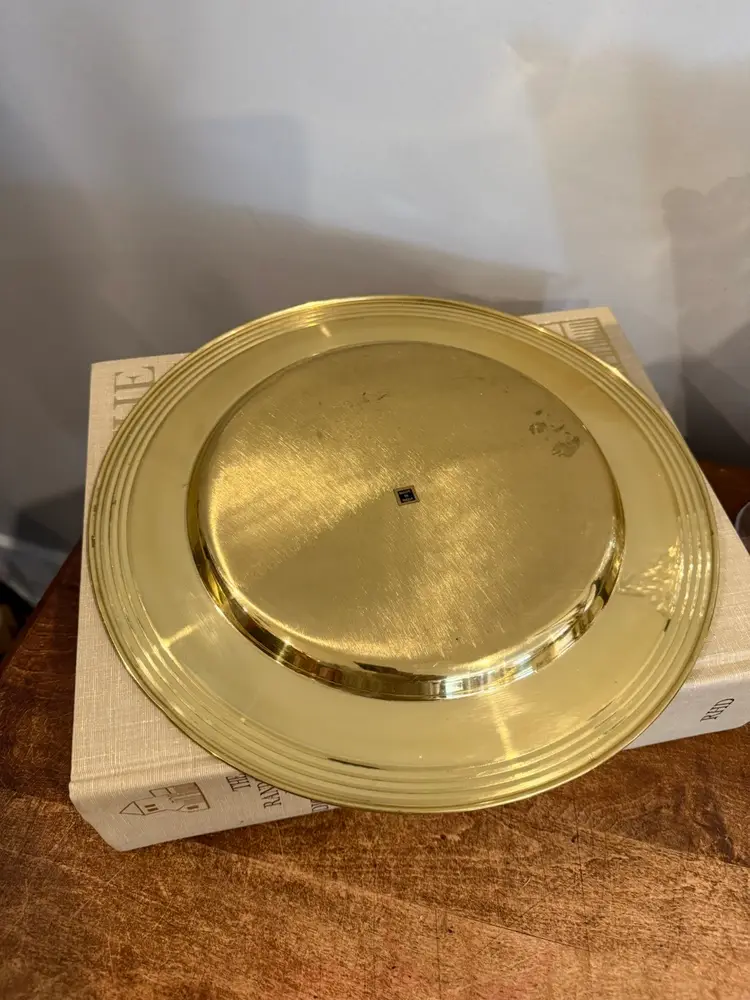 The substantial and elegant charger plate provides a luxurious base for your centerpieces, perfect for special occasions or adding a touch of vintage glamour to everyday table scape. Warm patina of solid brass, offering a timeless aesthetic. This is in good vintage condition, showing some signs of wear consistent with age, which adds to its authentic charm.