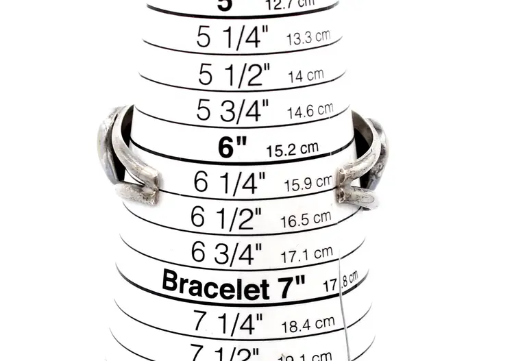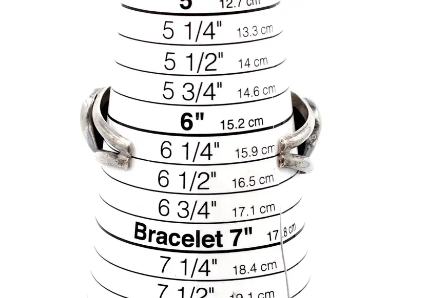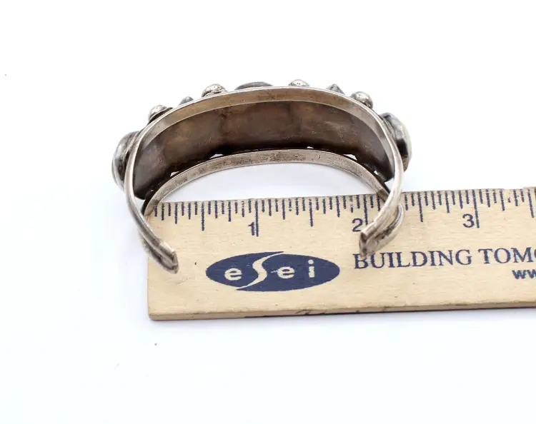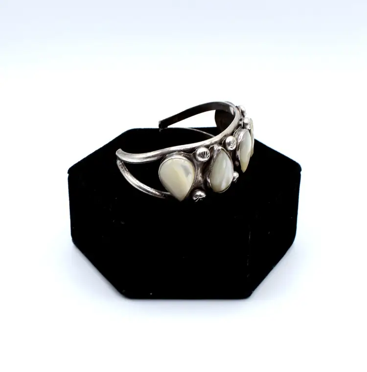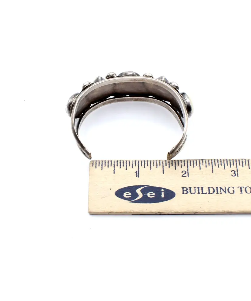 Beautiful unsigned Native bracelet. Six teardrop pearls set in smooth bezels and adorned with stamped dots set on a 2 rails. Inner diameter 5", gap 1.5",1" wide. Buy with confidence, all items are tested with XRF and Presidium analyzers.