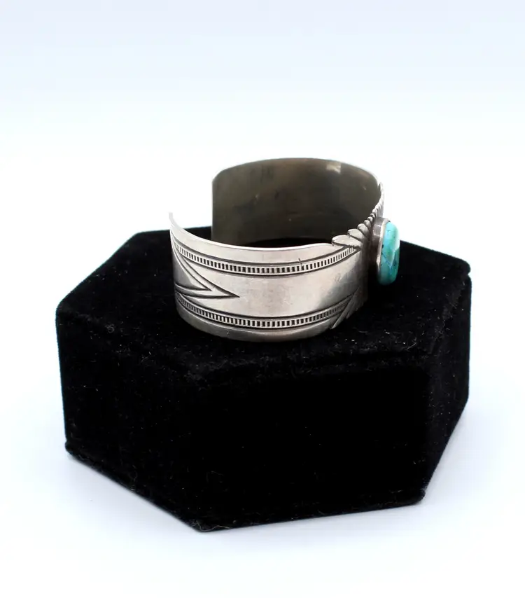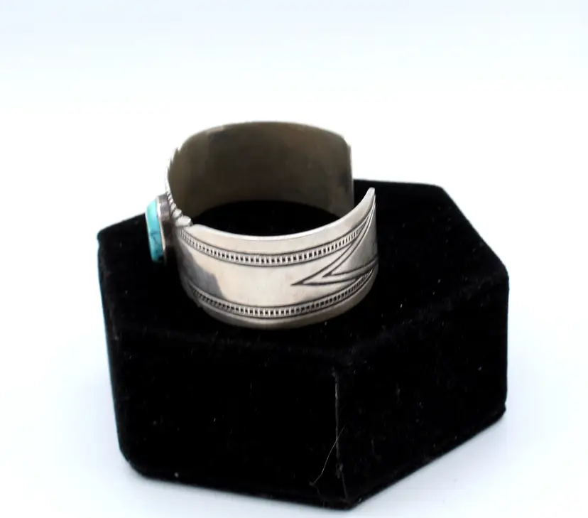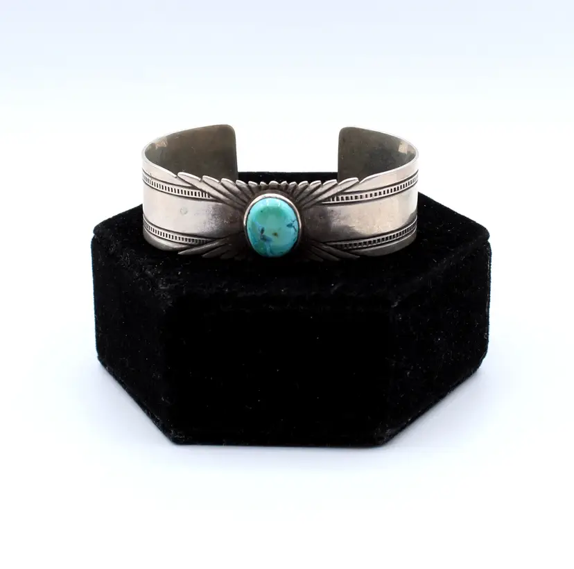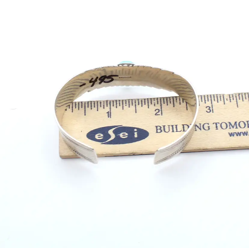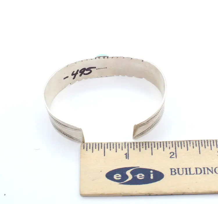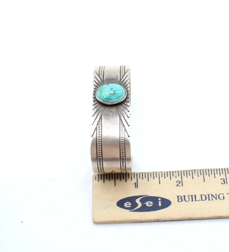 Fantastic simple unsigned bracelet stamped sterling. Single light blue turquoise set in a smooth bezel. Hand stamped design on the oval shaped band. Inner diameter 5.5", gap 1". .75" wide. Buy with confidence, all items are tested with XRF and Presidium analyzers.
