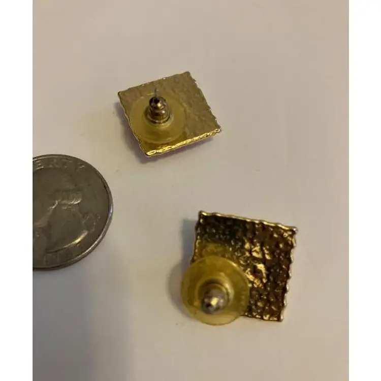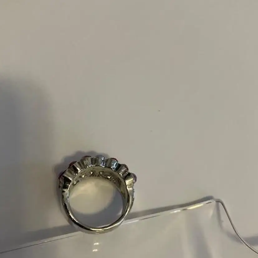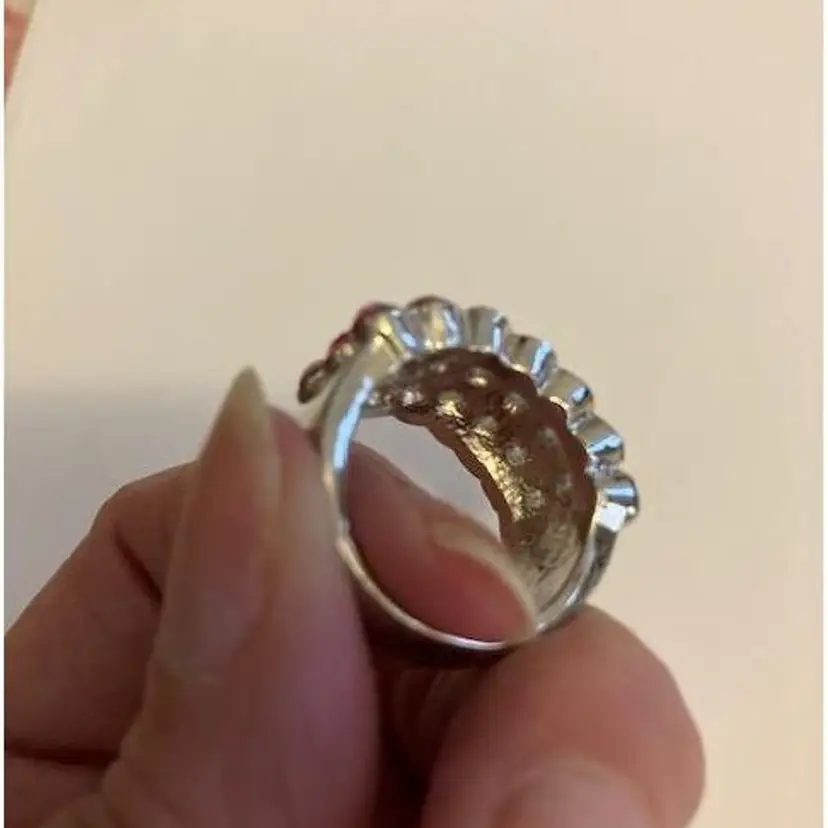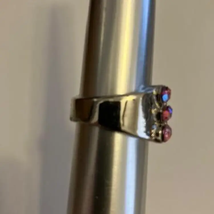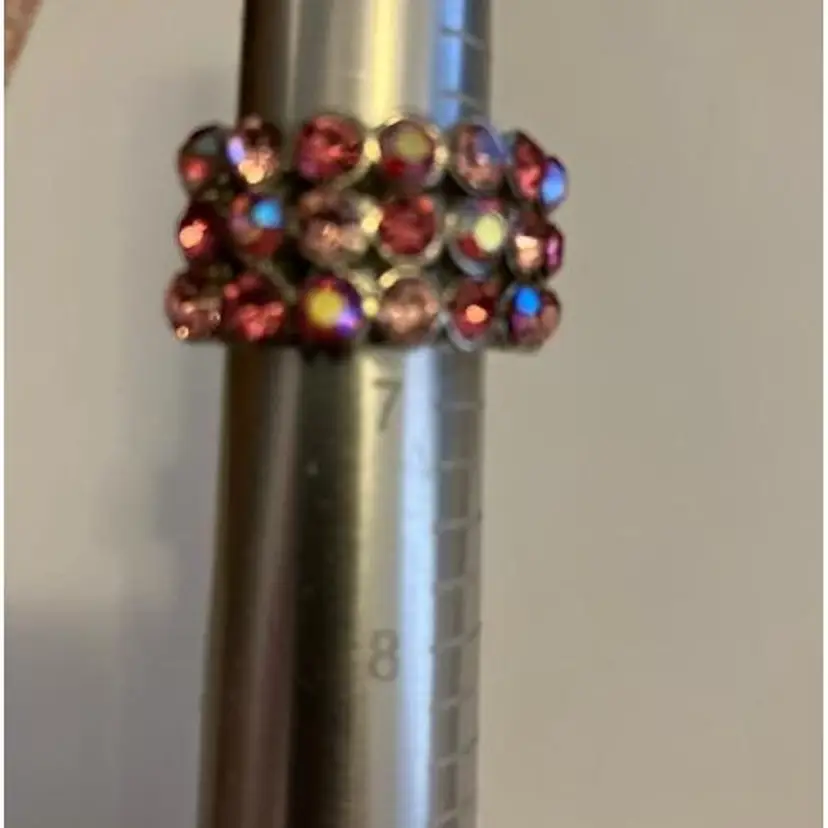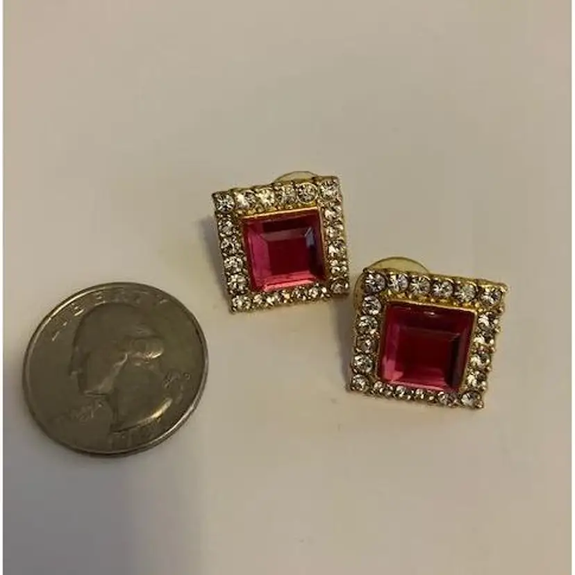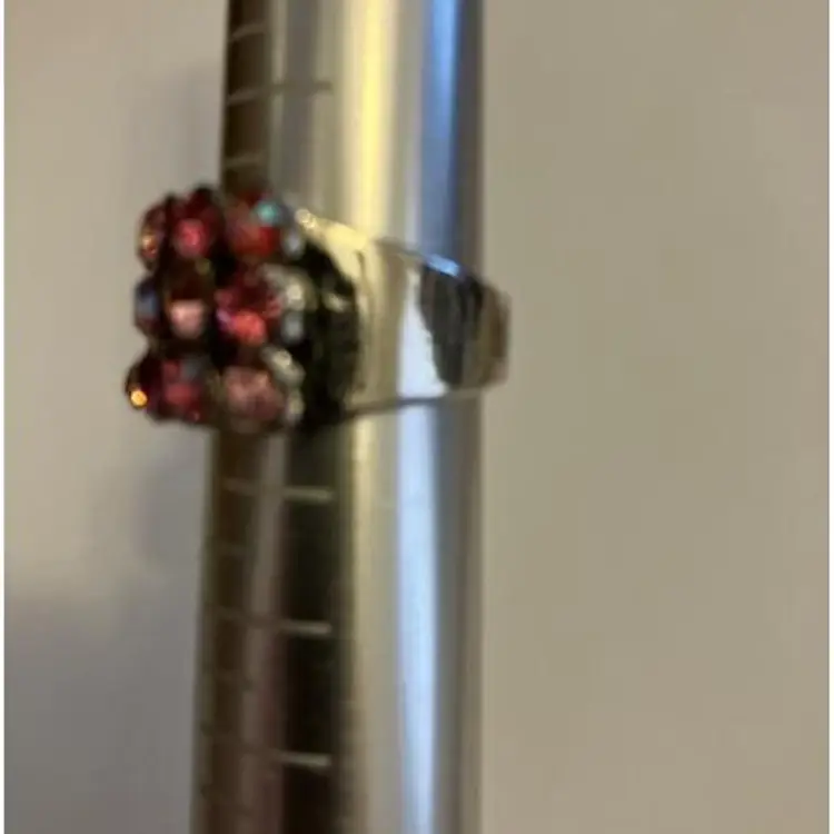 Sparkly silver tone with pink rhinestones cocktail ring, size 6 to 6 1/4. Gold tone with pink and white rhinestones pierced earrings measure about 1/2" x 1/2". Both in great condition. No marks or signatures on either.