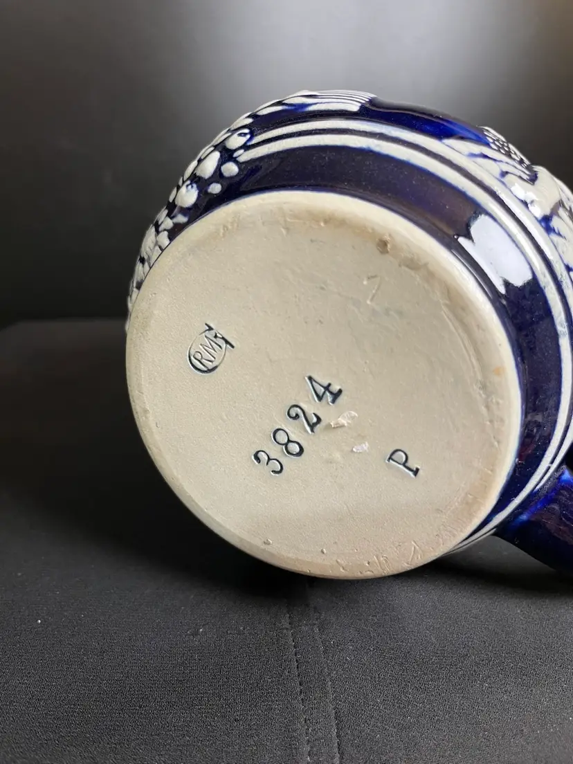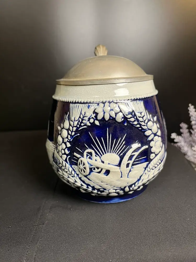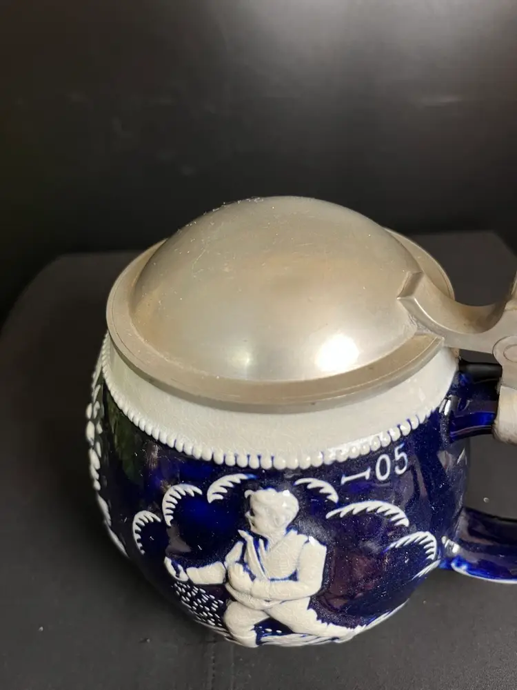 This is really a nice piece. The blue is striking and is even more so with silver toned metal lid & handle. Has 05 near handle on the outside of mug. Has a small dent on lid. No chips or cracks and is in good vintage condition. measures approx 5.5"H, 6"W, 1 1/2 Lb