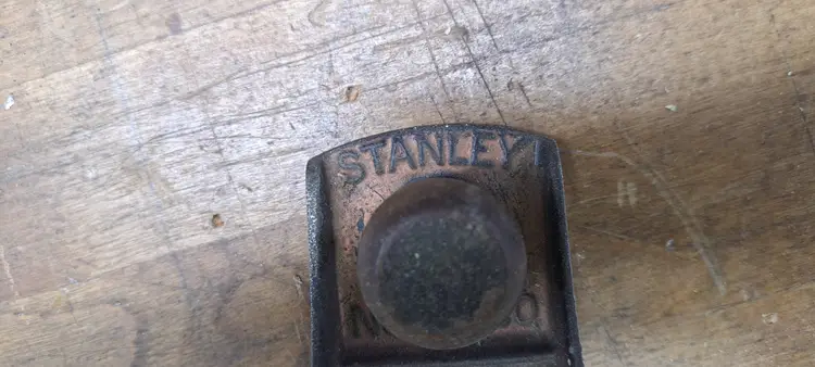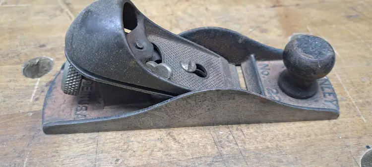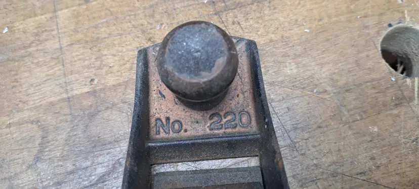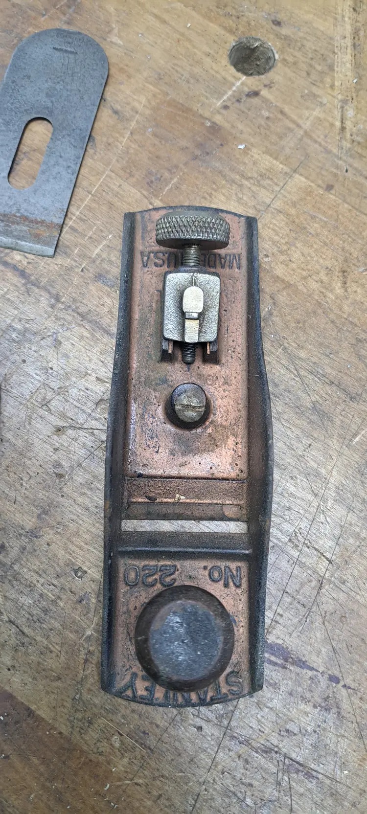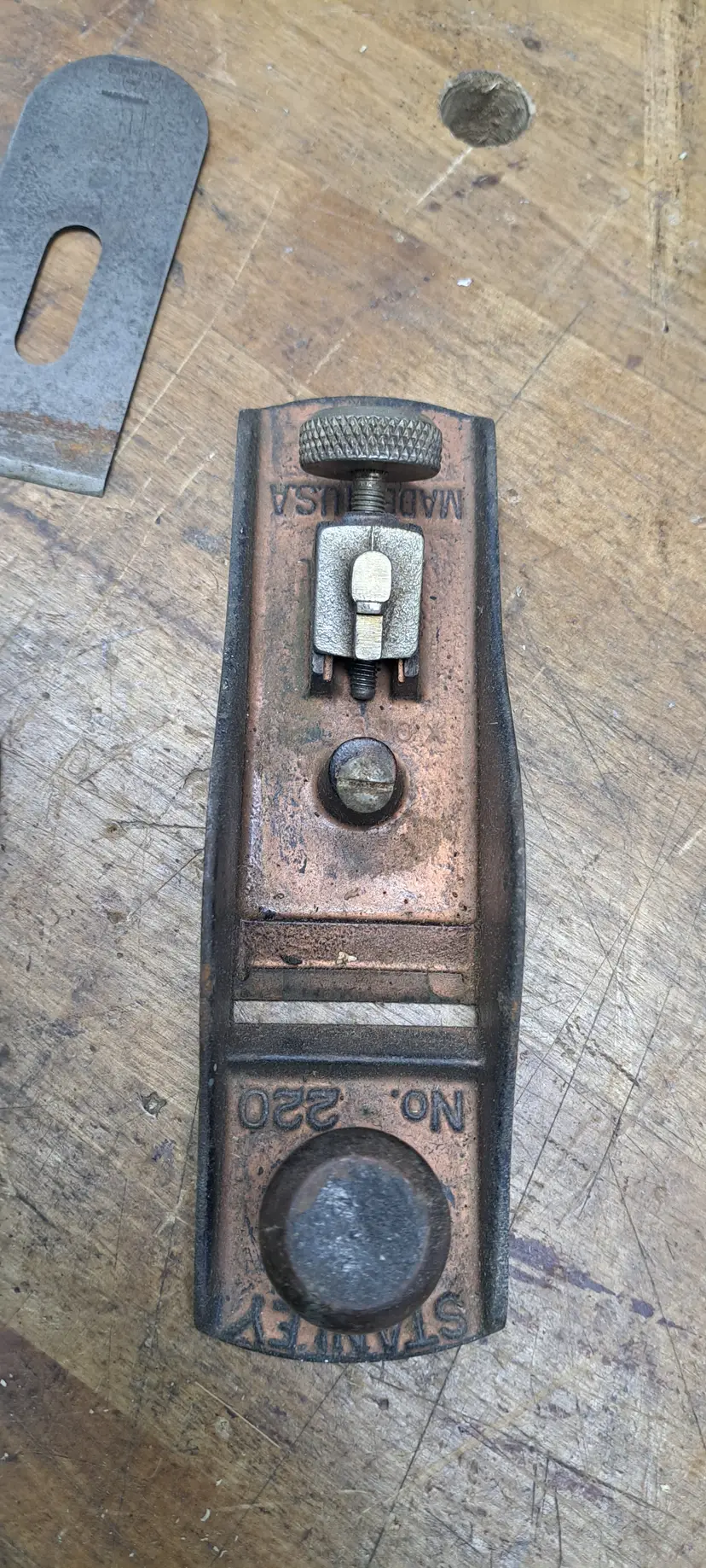 Stanley block plane #220. Sweet heart AA trademark stamp on iron puts it at 1922-35 someone painted it copper color, not sure if I like that or not, maybe when it was 1st done.