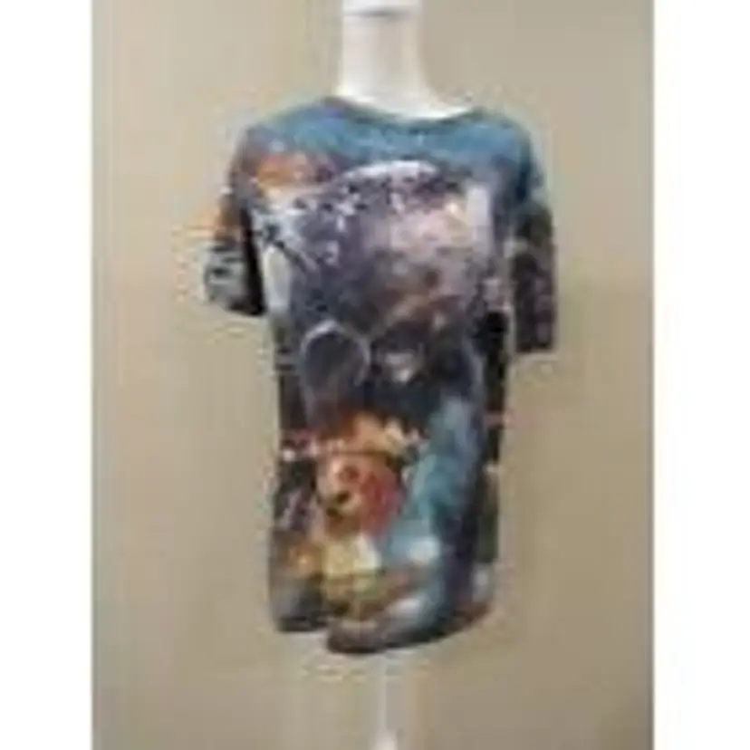 Express your love for the iconic Star Wars franchise with this stylish T-shirt featuring an all-over print of the DeathStar. Made with high-quality material, this T-shirt is perfect for men looking for a regular fit and short sleeve design. The graphic print pattern of stars and the DeathStar will surely stand out in the crowd, making it an ideal choice for fans of Star Wars. The T-shirt is available in size L and comes in multicolor. The theme of the T-shirt is based on the Star Wars franchise and features the character family of Star Wars. Get your hands on this T-shirt to show your love for Star Wars. Measurements are shoulder to waist 26", armpit to armpit 19" sleeve 8".