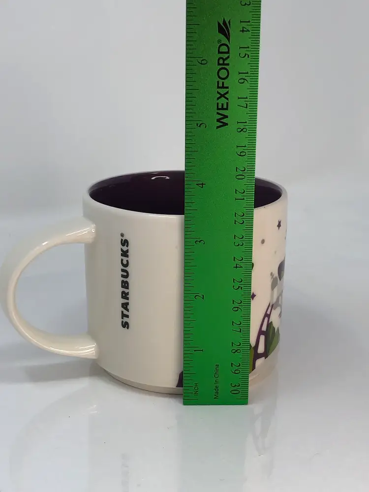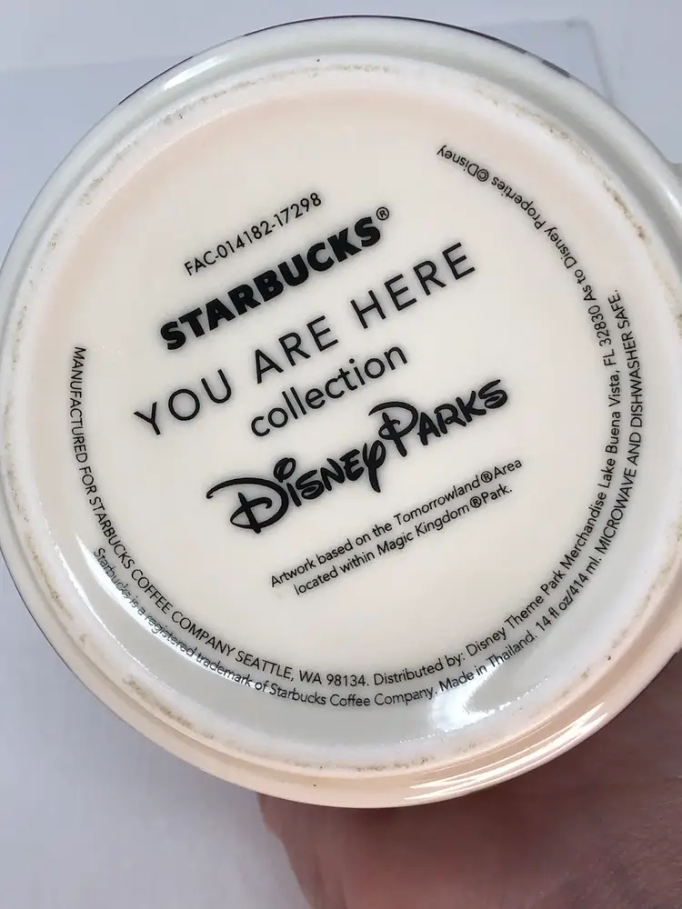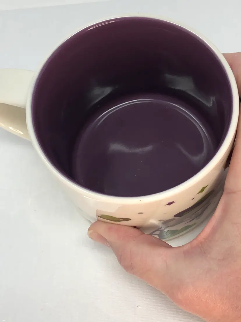 14 ounce 4" mug features Tomorrowland mechanical space design in purple, gray and green on white. Purple interior no chips or cracks