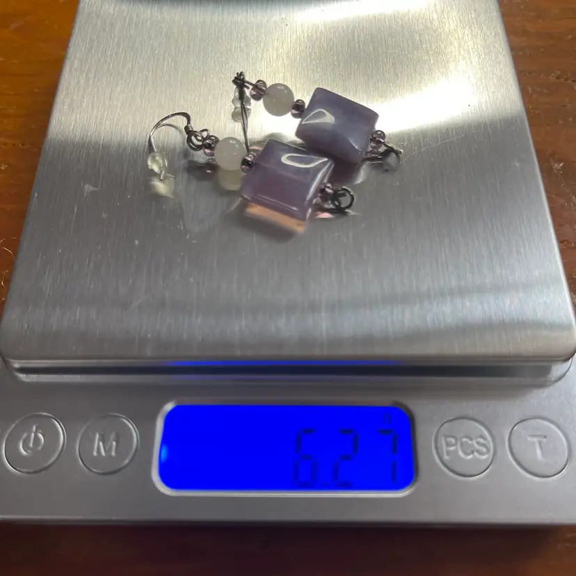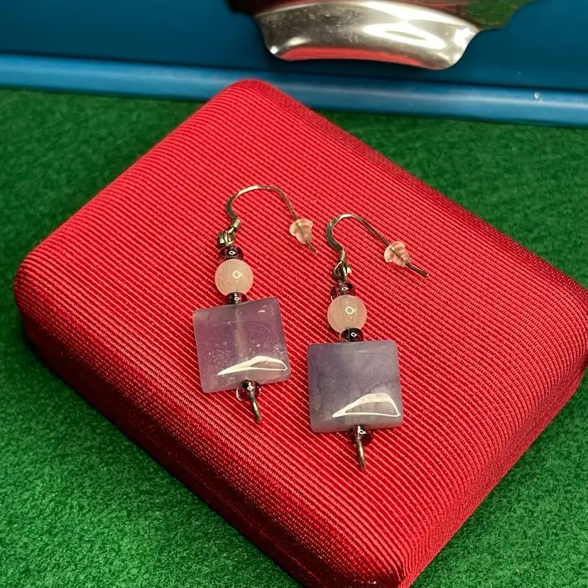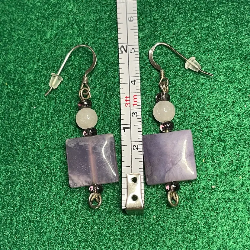These earrings are each constructed from a purple stone flat square bead a pink glass bead as well as a silver hook and finial. The hooks and finials are tested as sterling and the hooks are faintly marked 925. The earrings are about 2 inches long from the finial to the top of the hook.