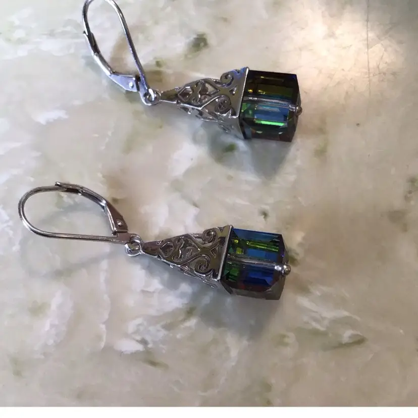 Marked 925 china FD, lever style ear wires with filigree & crystal dangles. #627