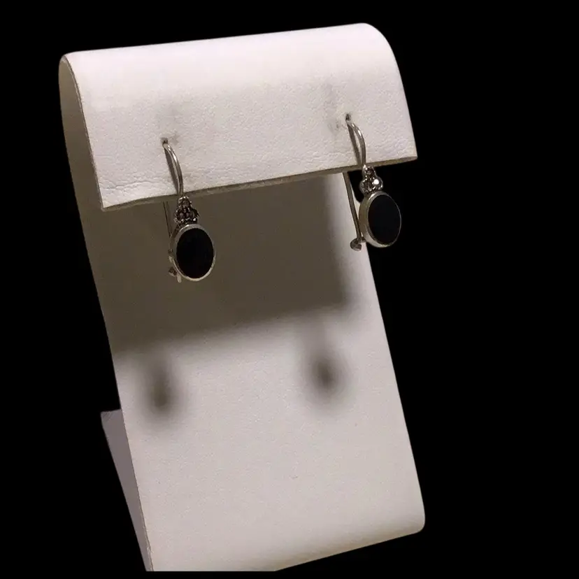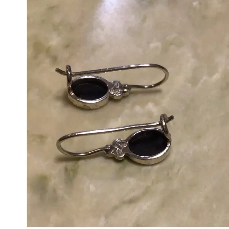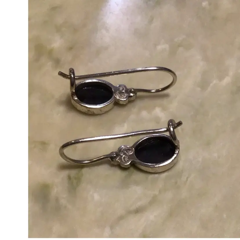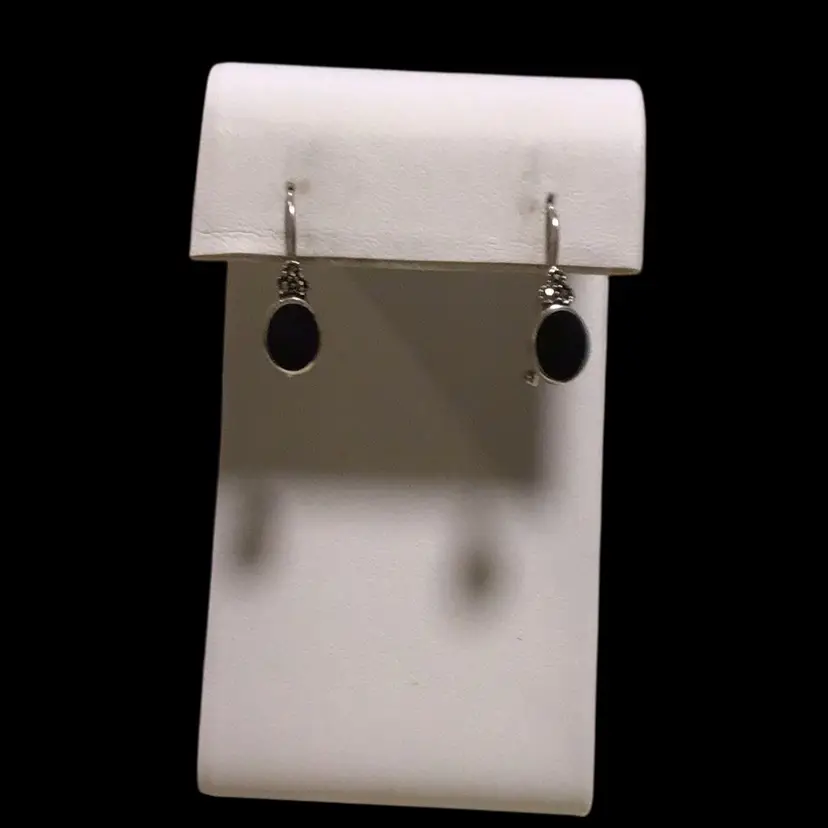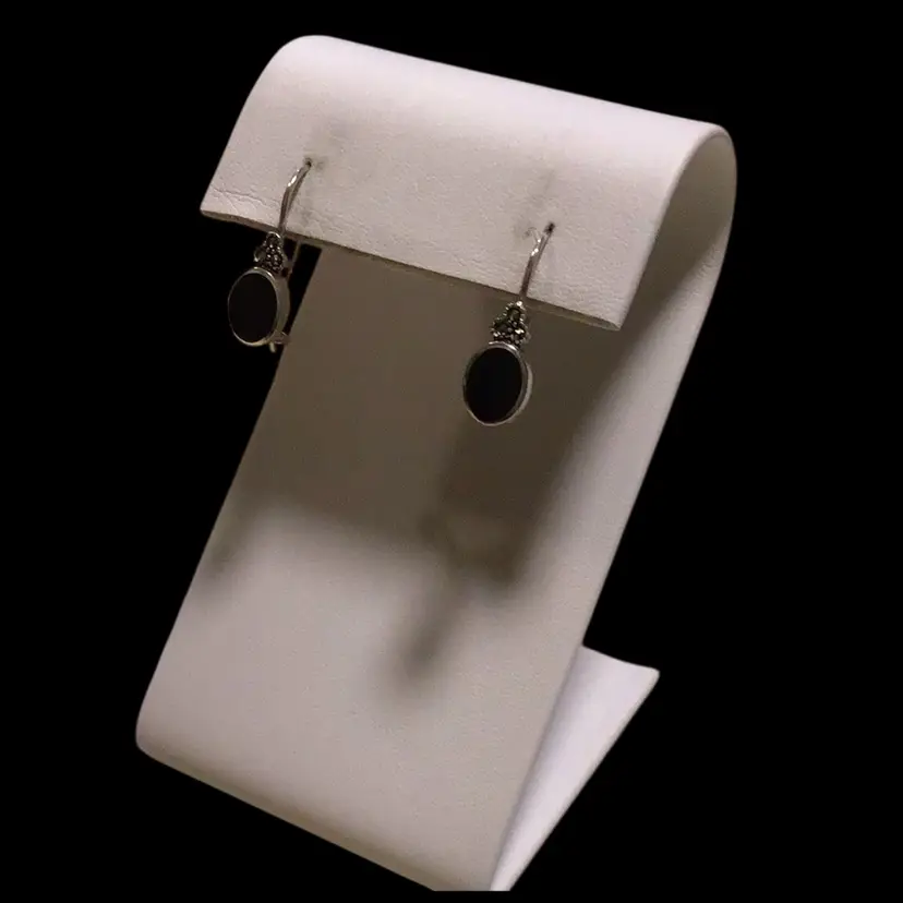 Marked 925 SU C. Oval onyx cabochon accented with 3 Marcasite on kidney wires 1” drop. #618