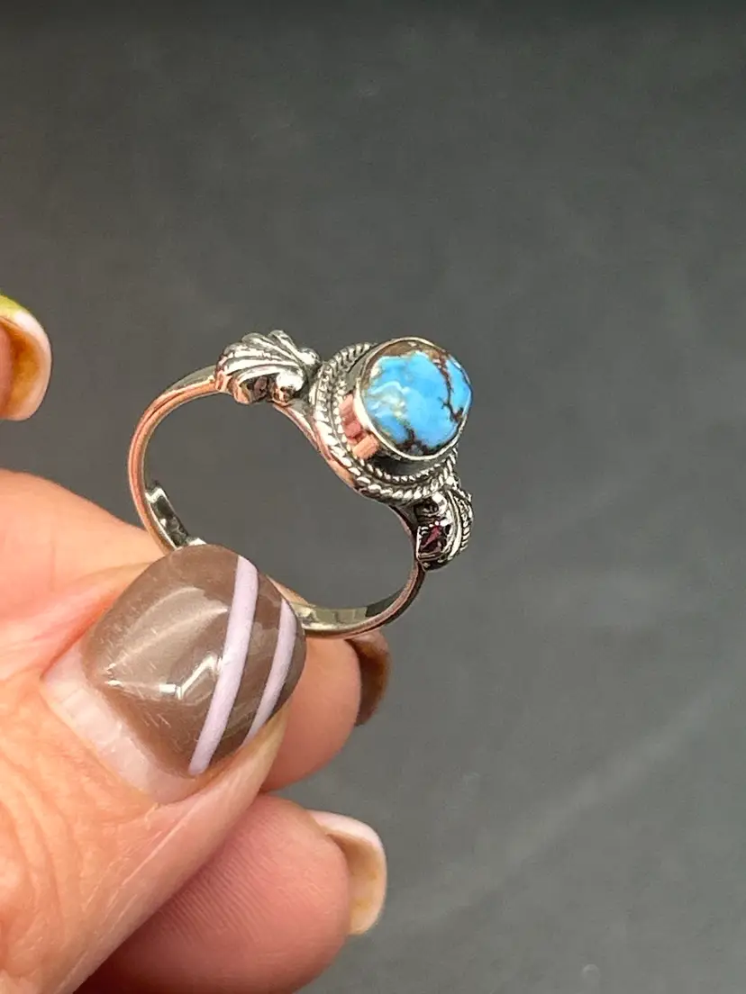 Notable Details: • Material: Sterling Silver (marked 925) • Gemstone: Natural turquoise with brown matrix • Design: Rope bezel with feather/floral shoulders • Ring Size: 5.5 • Stone Measurements: Approx. 10mm x 8mm (oval cabochon) • Condition: Excellent vintage condition with minimal surface wear; no cracks or repairs noted
