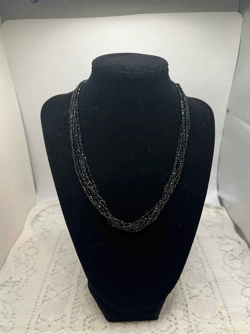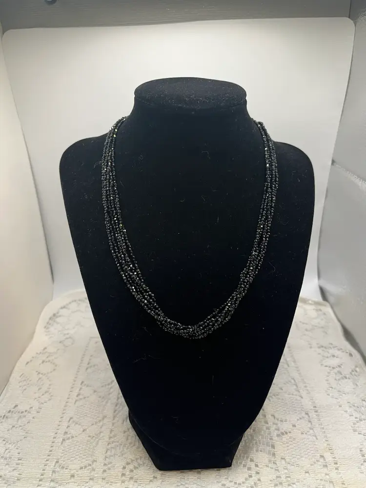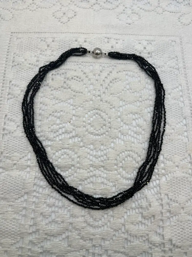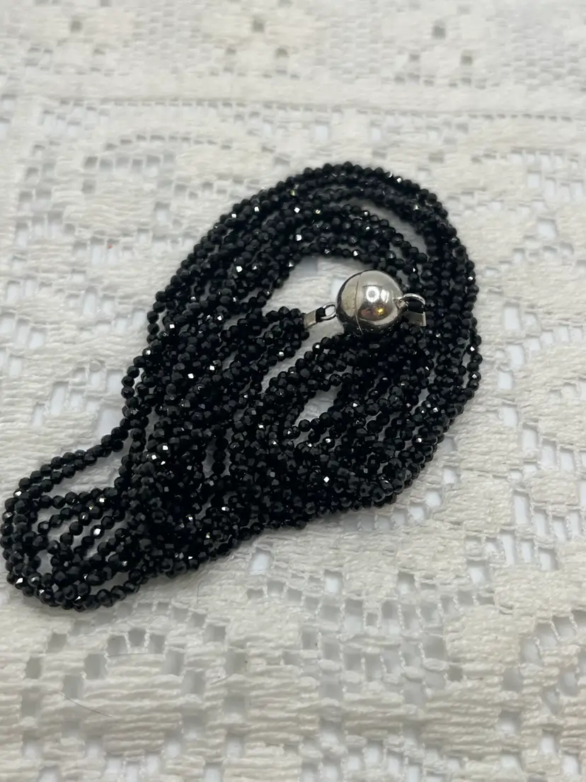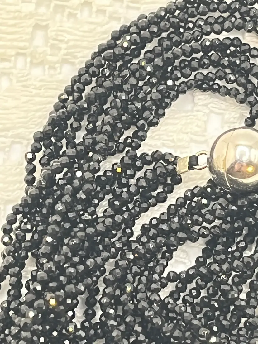 This stunning multi-strand beaded necklace features genuine black spinel beads and sterling silver accents. The round black spinel beads are carefully strung together to create a sophisticated, sparkling look. The necklace secures with a durable magnetic clasp, making it easy to wear.