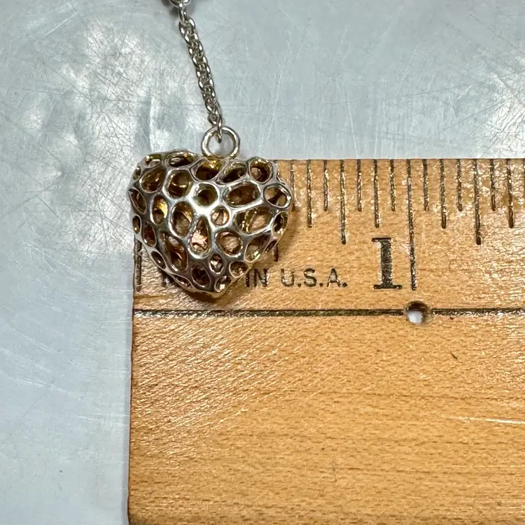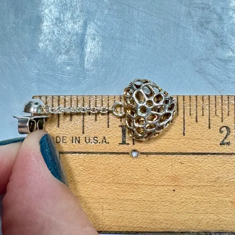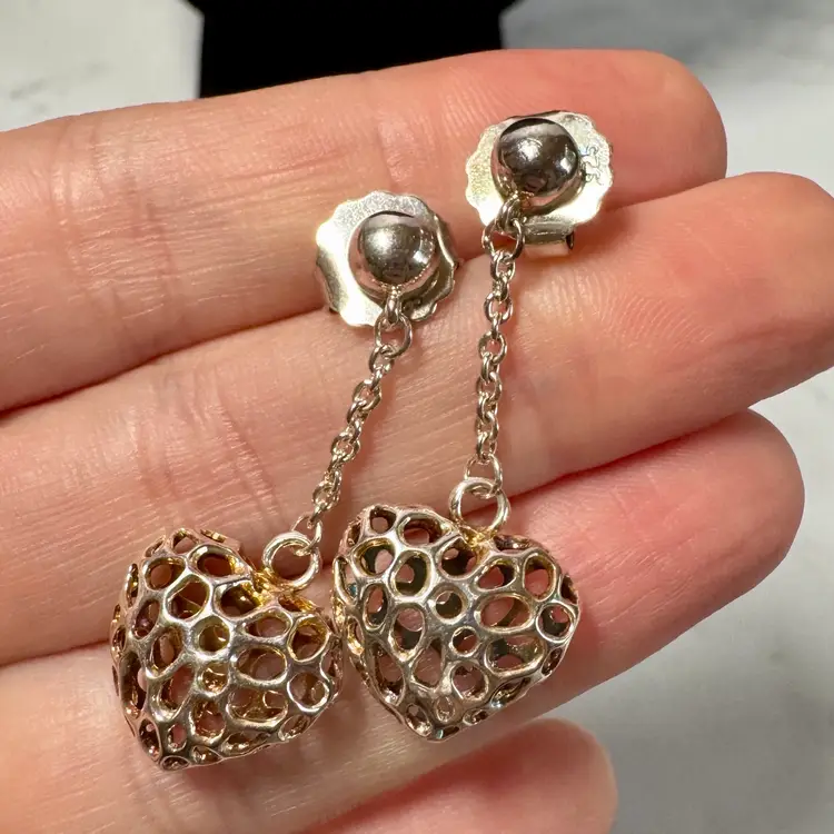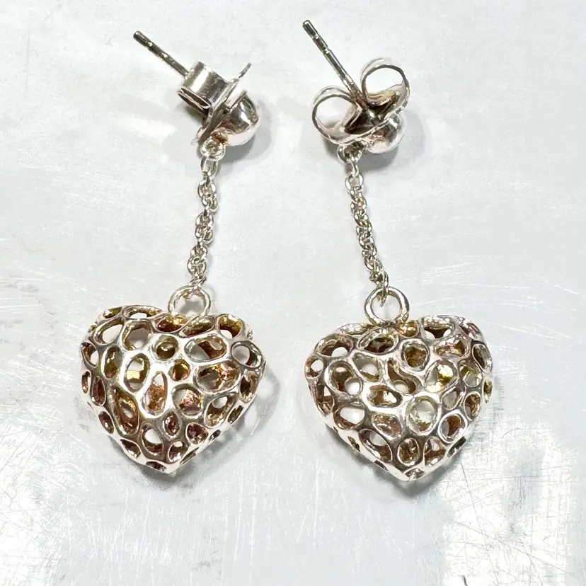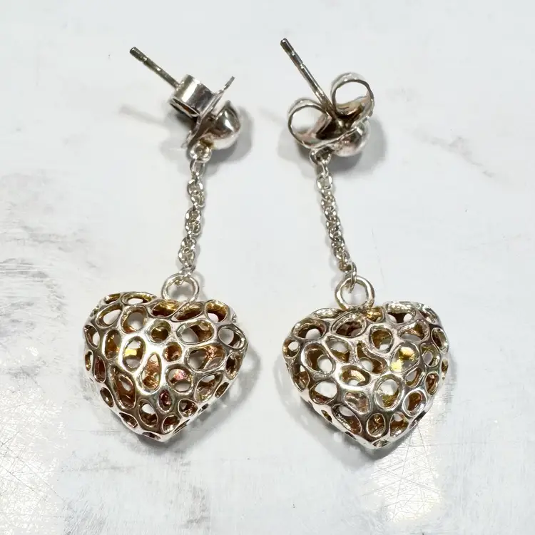 Charming sterling silver heart-shaped pierced earrings, marked 925 on large earring backs and tested sterling, featuring an intricate openwork design. Measure 1-1/2” long x 1/2” wide, weigh 6g per pair. Good condition with minor wear and patina. A delicate, handcrafted piece!