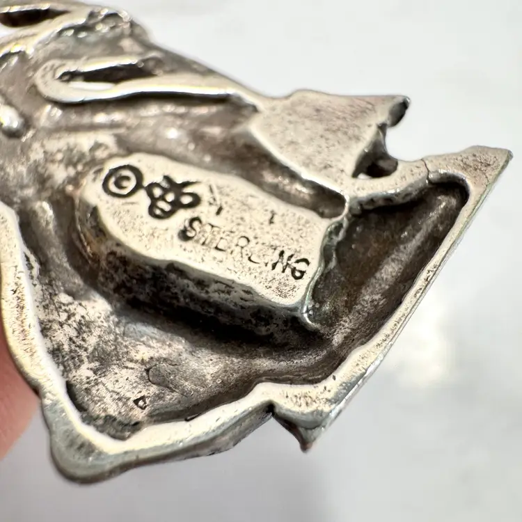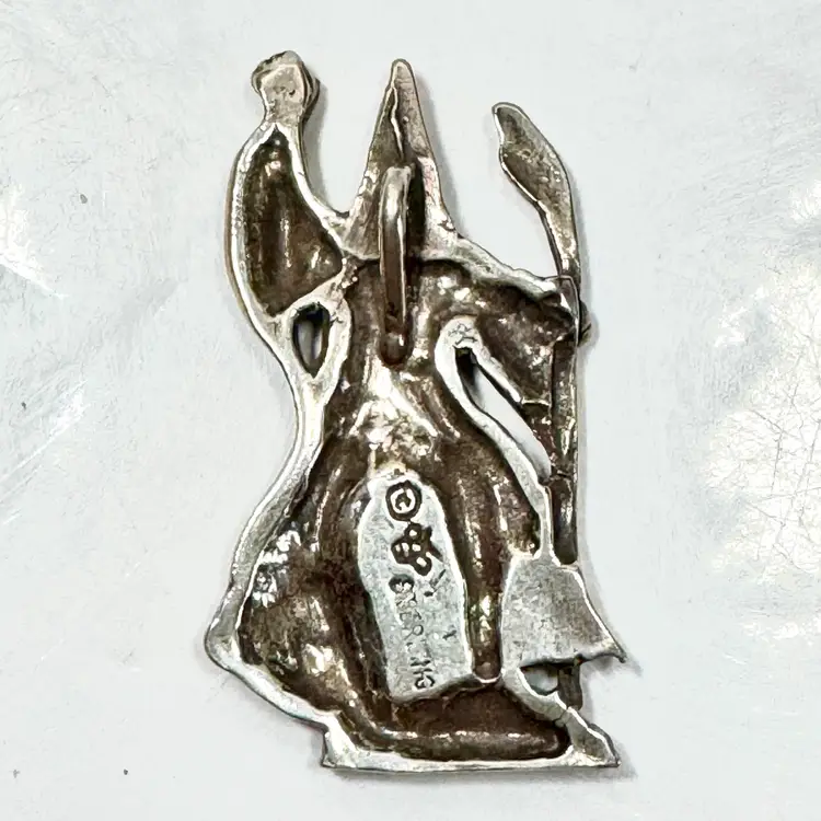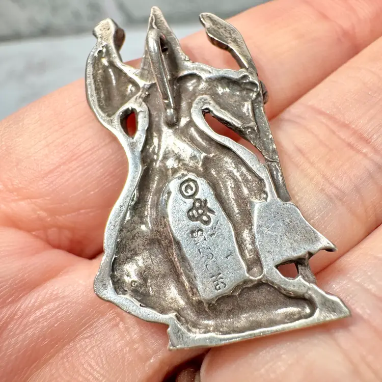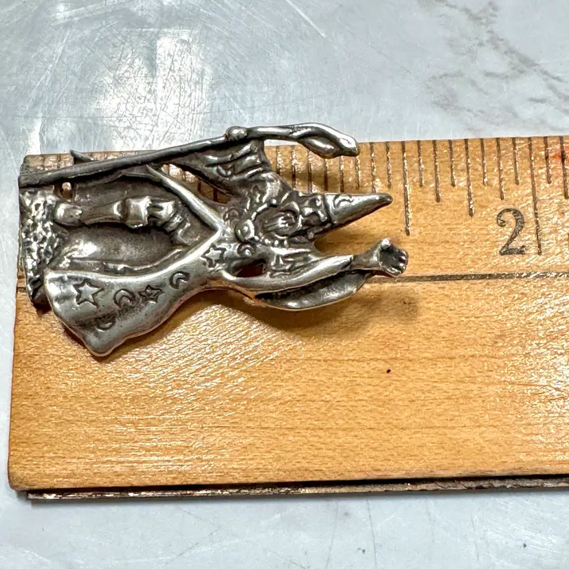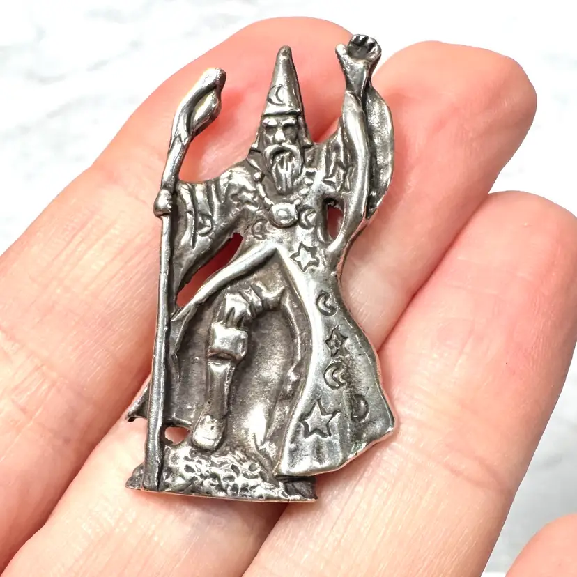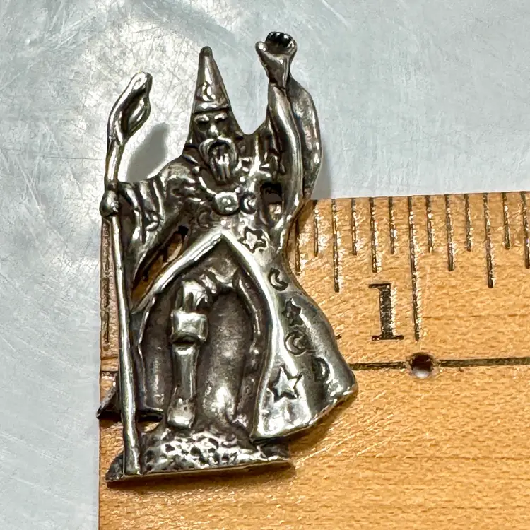 Enchanting sterling silver wizard pendant, resembling Merlin or Gandalf, marked sterling with a stylized bee symbol. Tested sterling, measures 3/4” wide x 1-1/2” tall, weighs 8g. No chain included. Good condition with minor wear and patina due to age. A captivating fantasy piece for collectors!