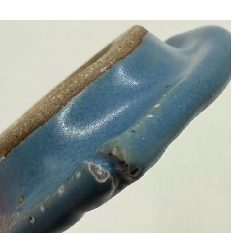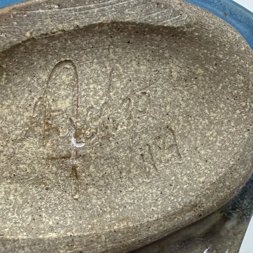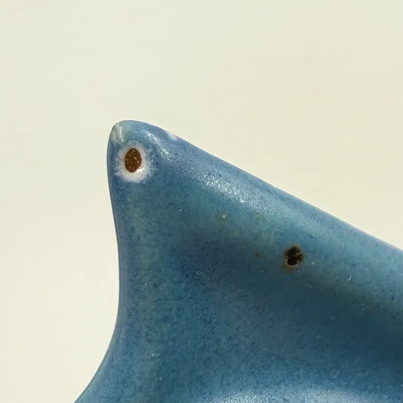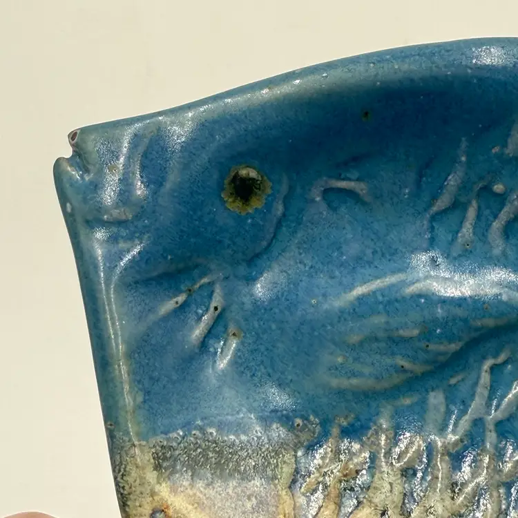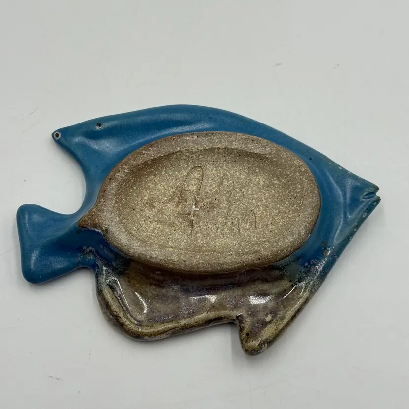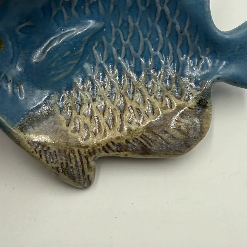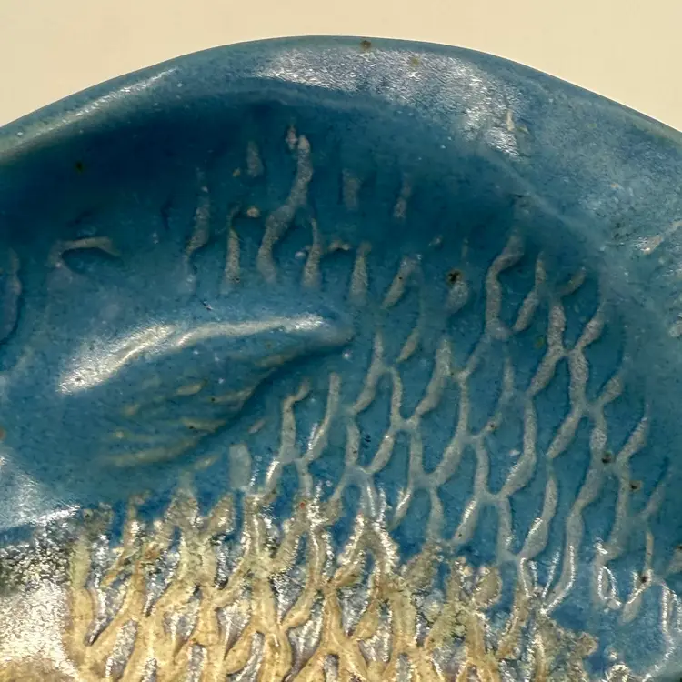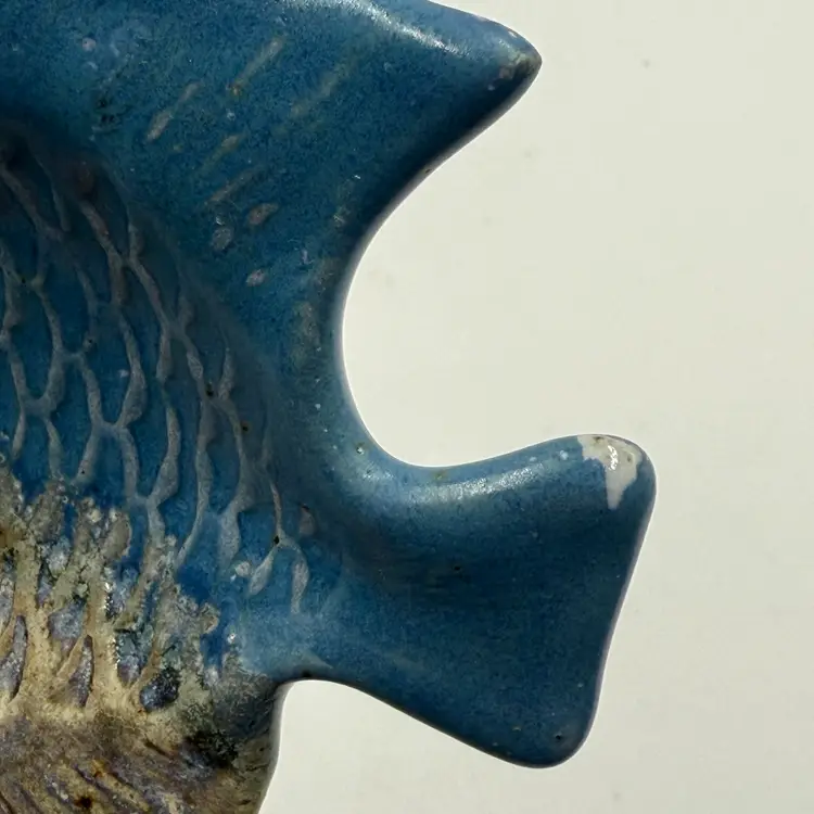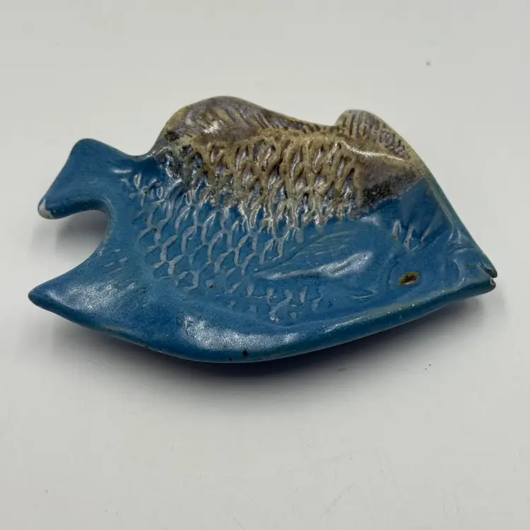 In good condition. There is a small chip on the bottom lip of the fish. There are a couple of glaze skips. Measures 5 inches long and 3 1/2 inches wide.