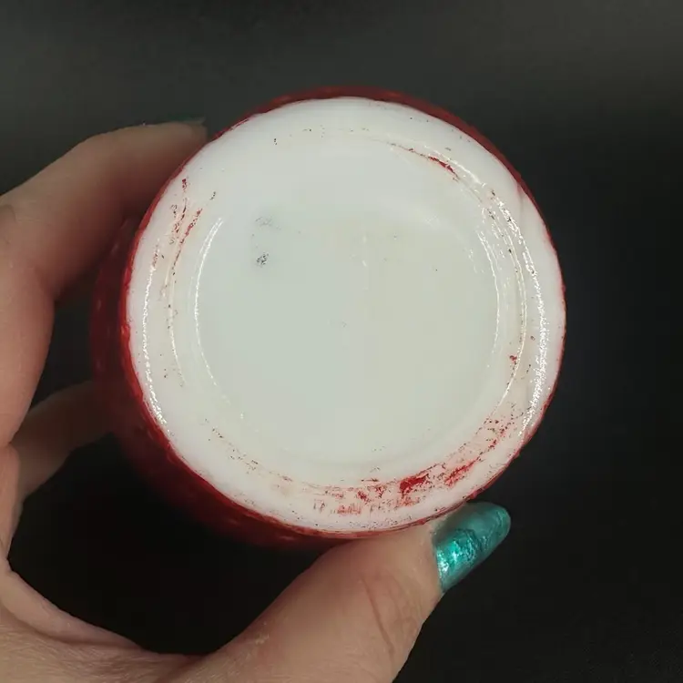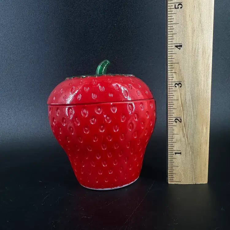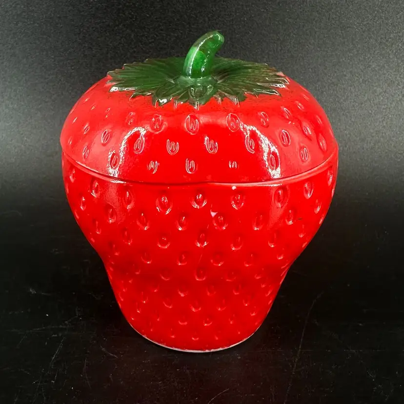 Strawberry lidded jar made of milk glass. No chips, cracks, or signatures. Jar with lid measures approximately 4” tall.