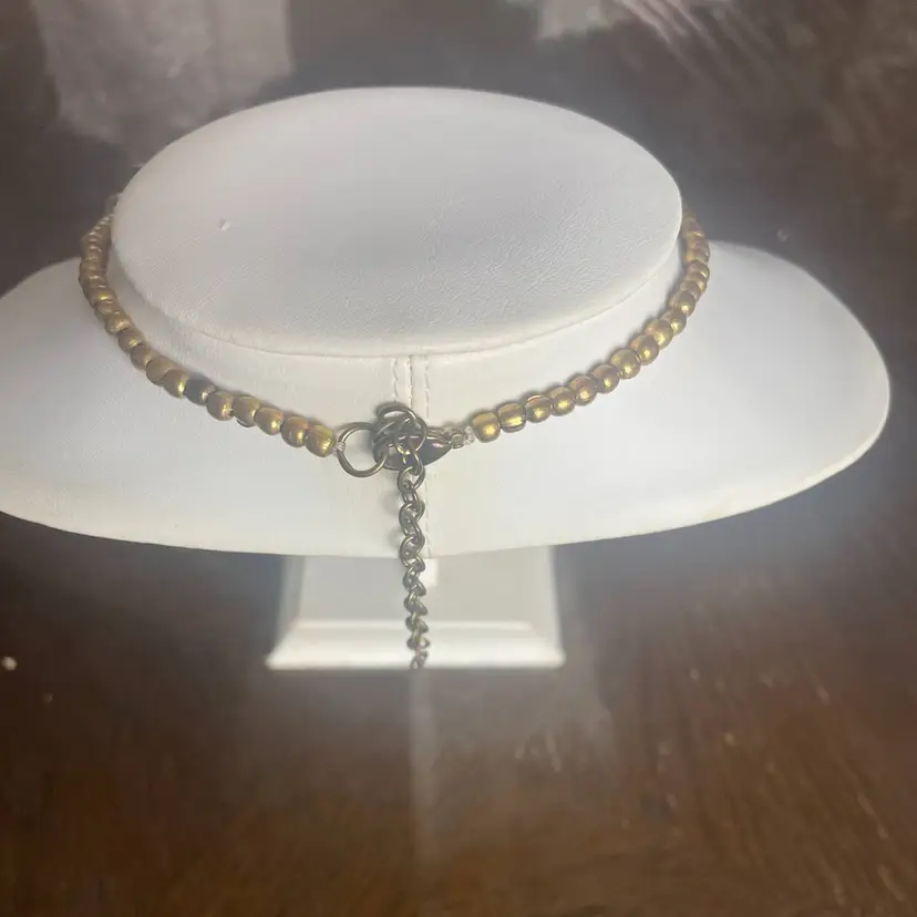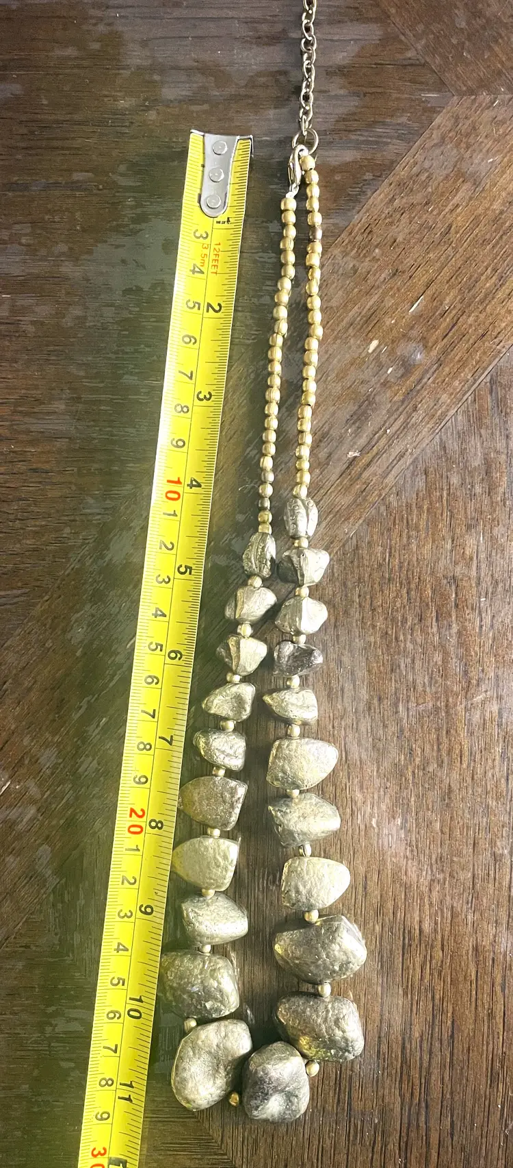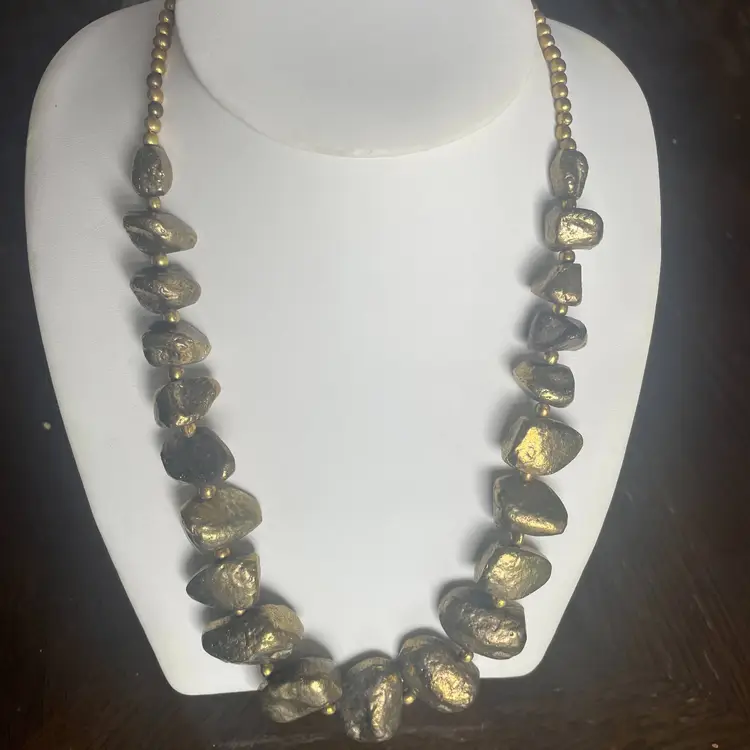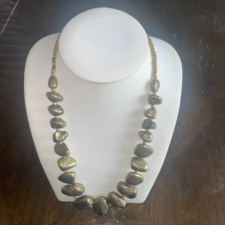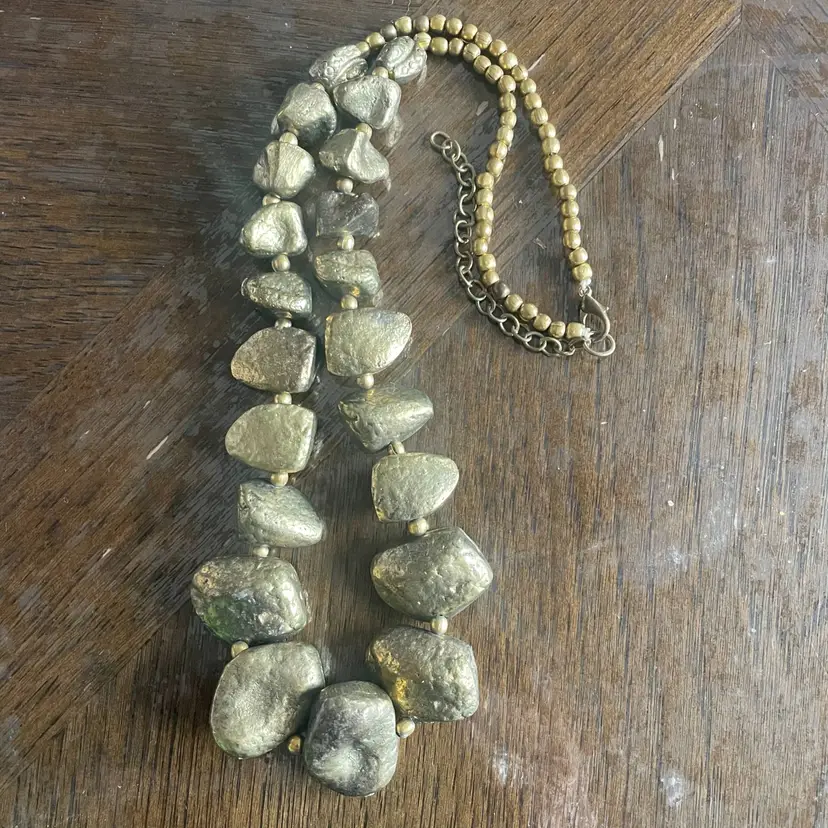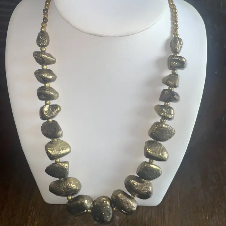 This necklace looks like it's straight out of a gold mine...all textured and natural-like, chunky and a bit clunky. The beads are rocks of pyrite stone in a brutalist style. They graduate in size from 1 inch wide at center to 1/2 inch wide near the hook and chain clasp.