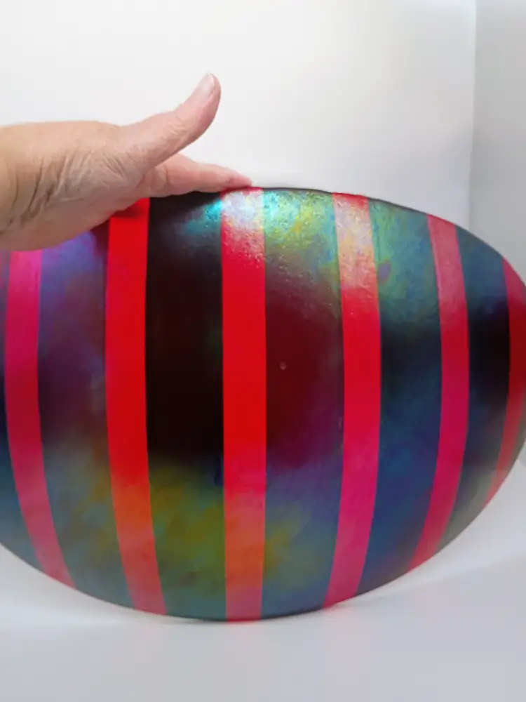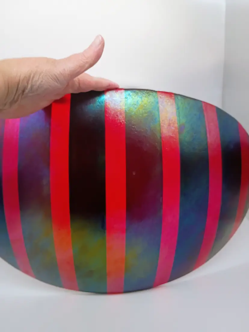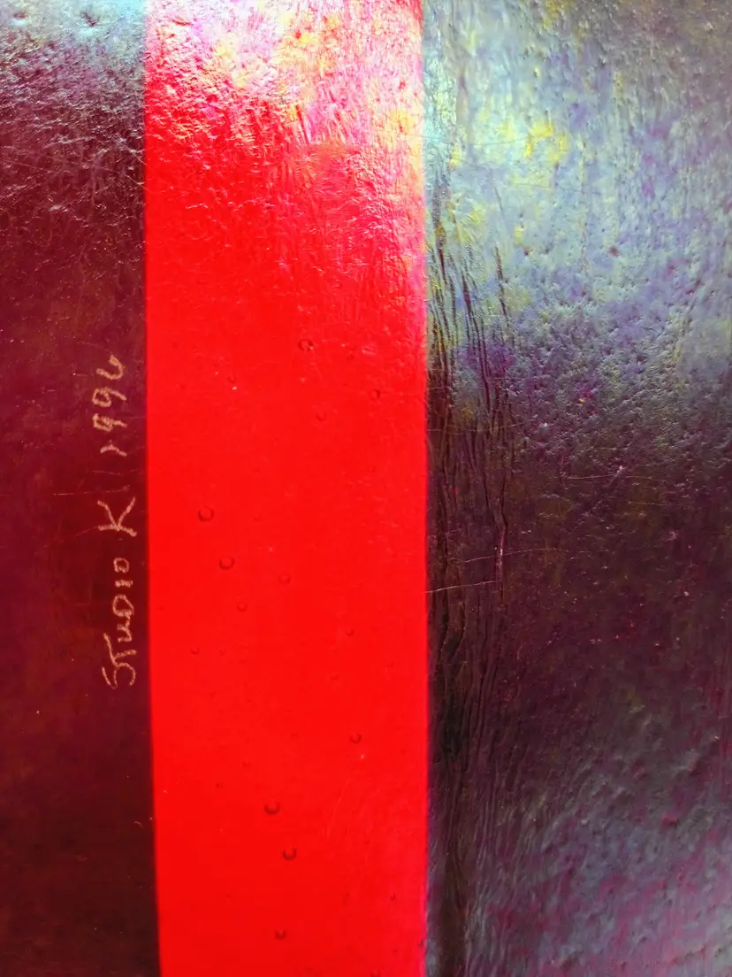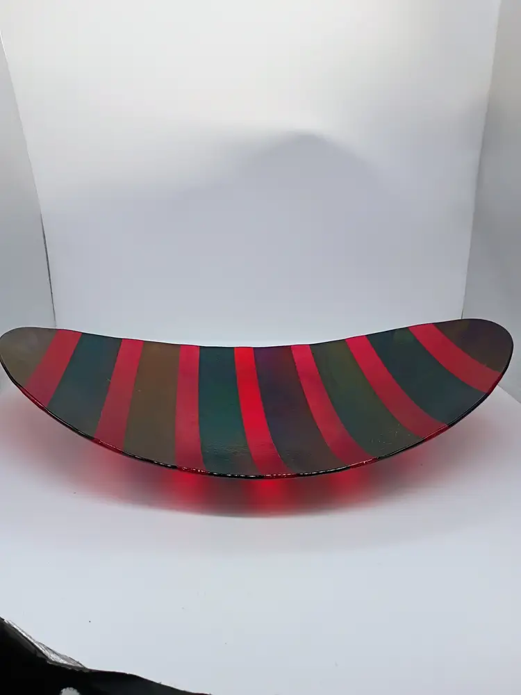 Vintage Studio K Kathleen Ash 1996 Fused Iridescent Dichroic Centerpiece Bowl. This is a 21 inch long curved sheet of fused glass Purples Teals, Red and Golds are primary colors. Rests on a center balance point. This is 13 inches wide and the tops of the curves are at about 4.5 inches tall. Truly a statement piece of contemporary modern glass art. This is preowned in Mint condition No chips cracks or flea bites. No damage to iridescent layer. This looks like it's brand new. Ships domestically and worldwide. Buyers please check shipping price this is going to be a huge box. Local pick up is avail in Cobb County Georgia on request. Due to the box size I have chosen the least expensive shipping choice for all locations if you need it sooner let me know and we can discuss the upgraded shipping