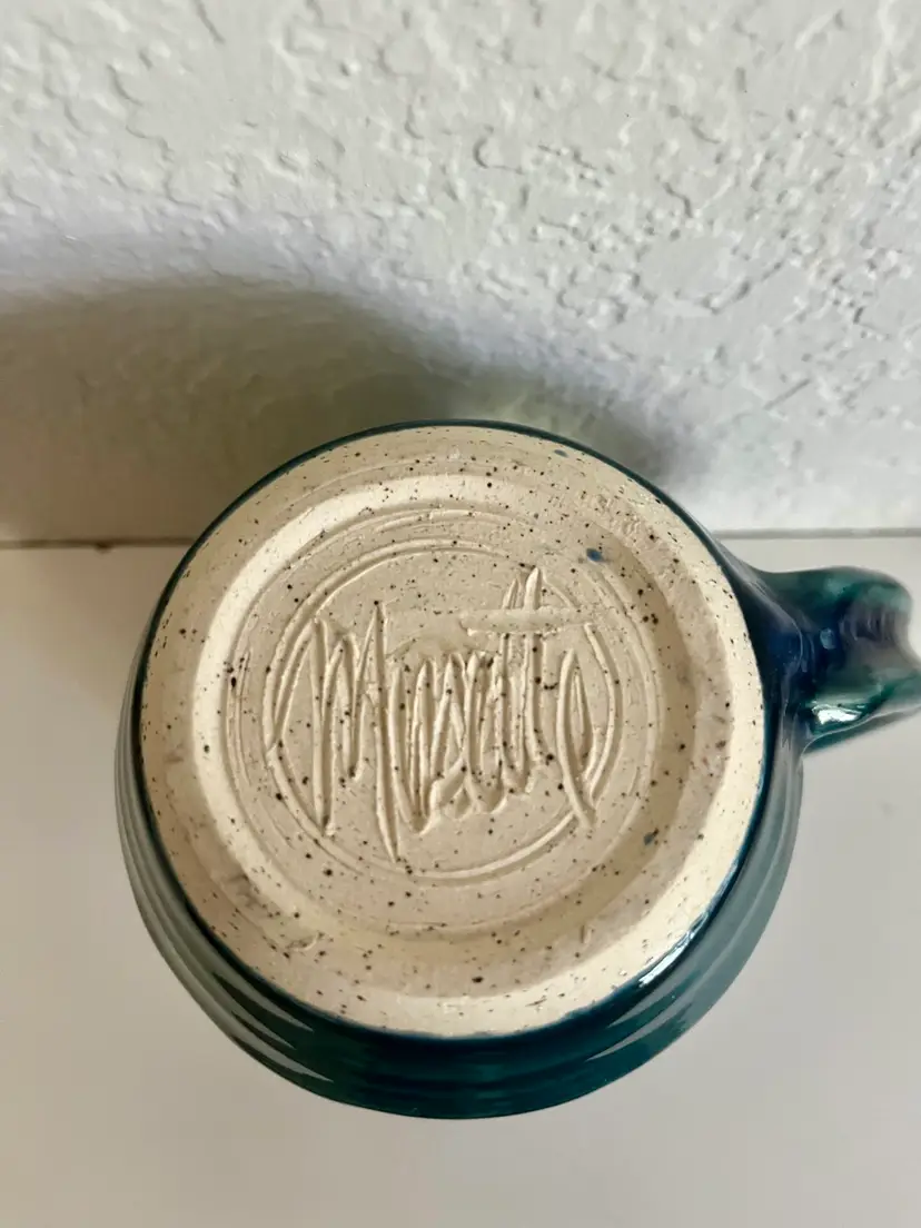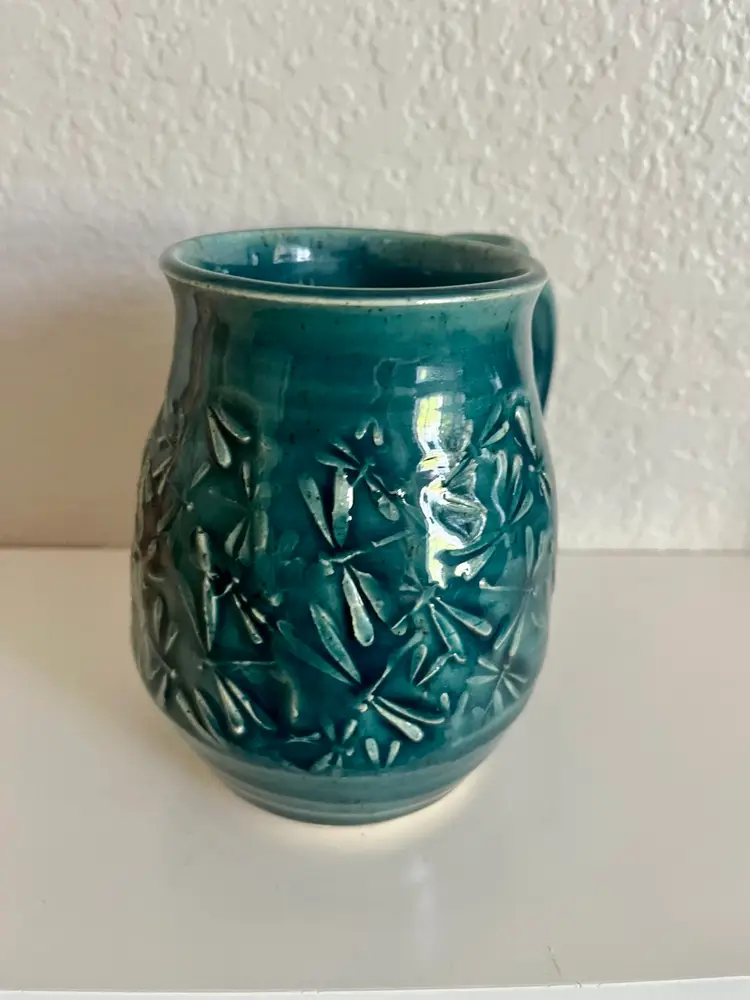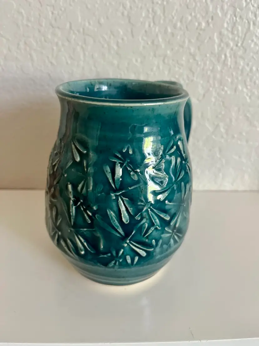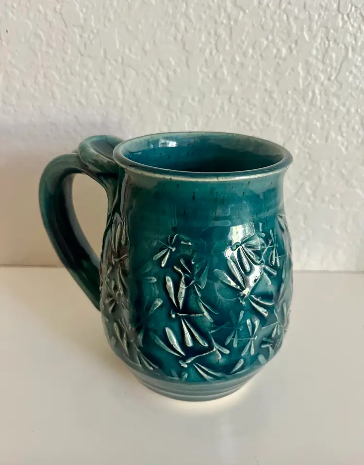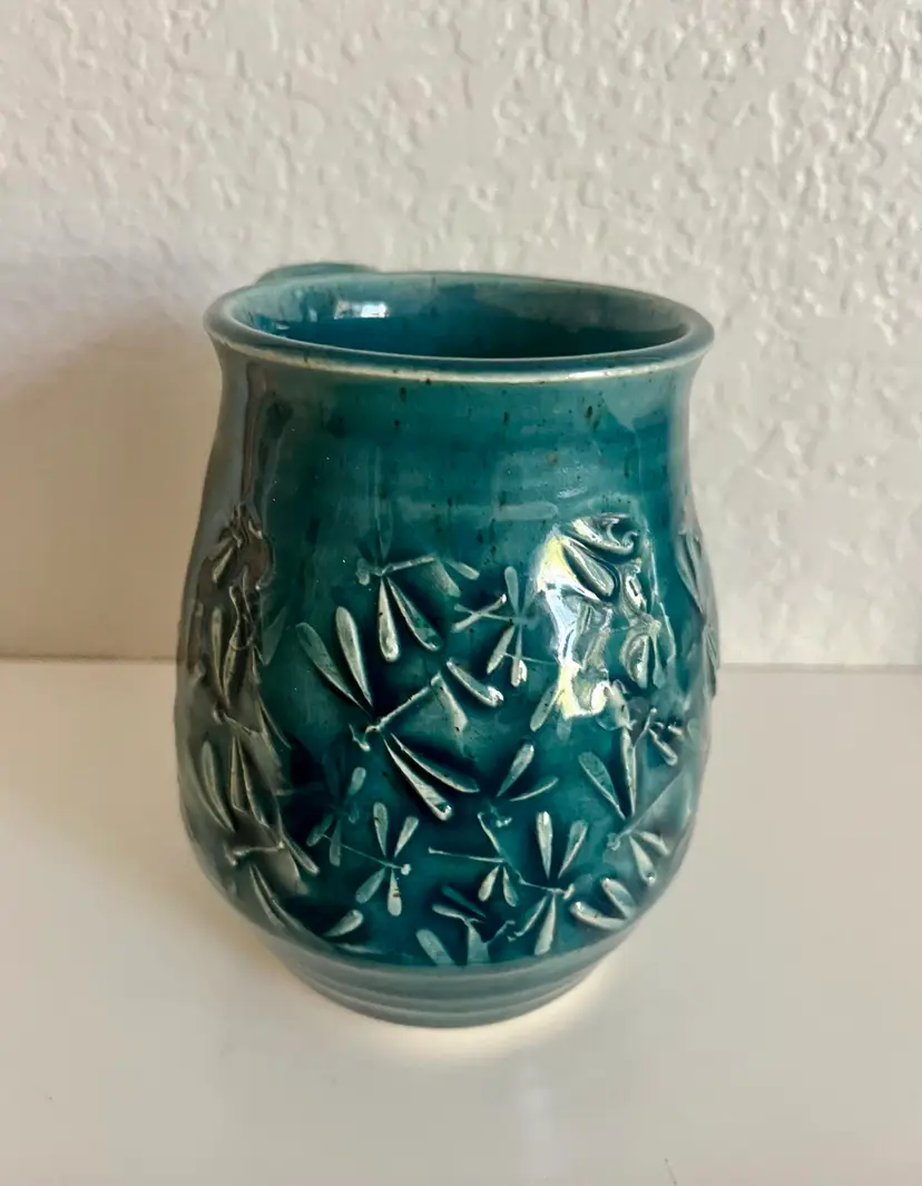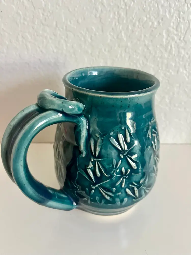 This beautiful signed studio pottery mug has a great big handle to hold a hot cup of coffee or tea. The dragonflies and the glaze are so pretty!