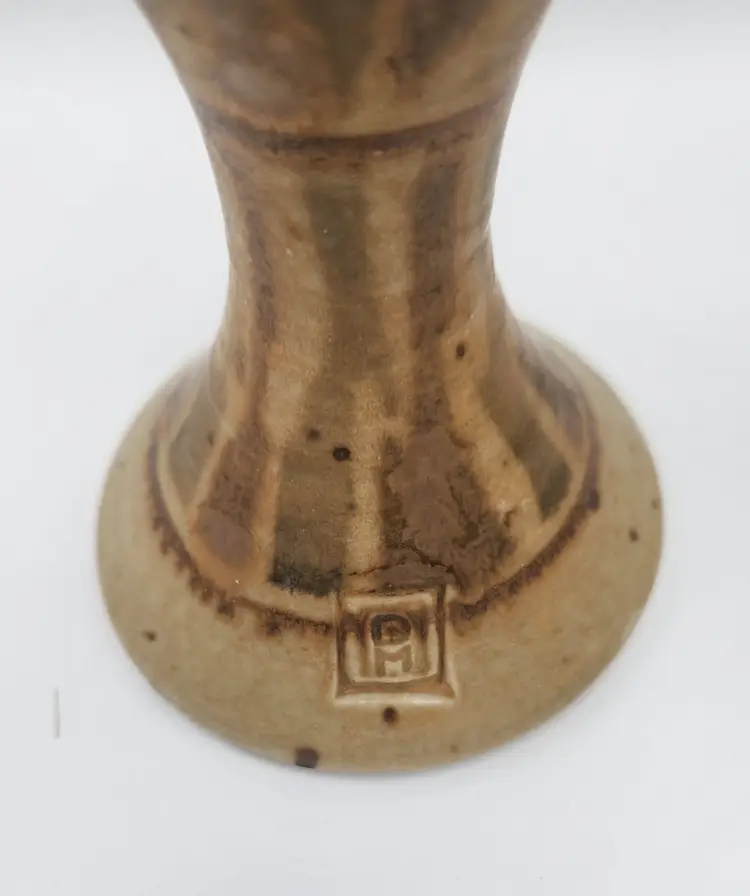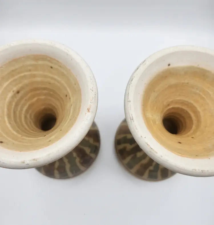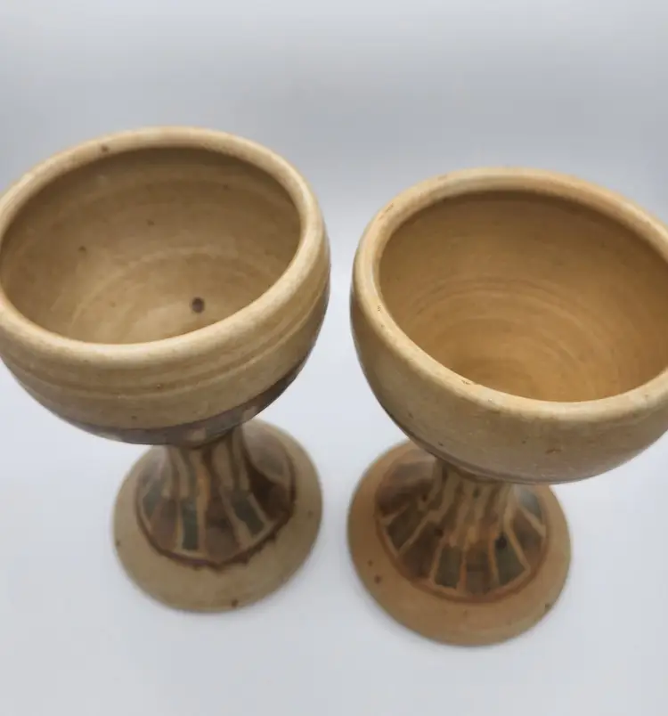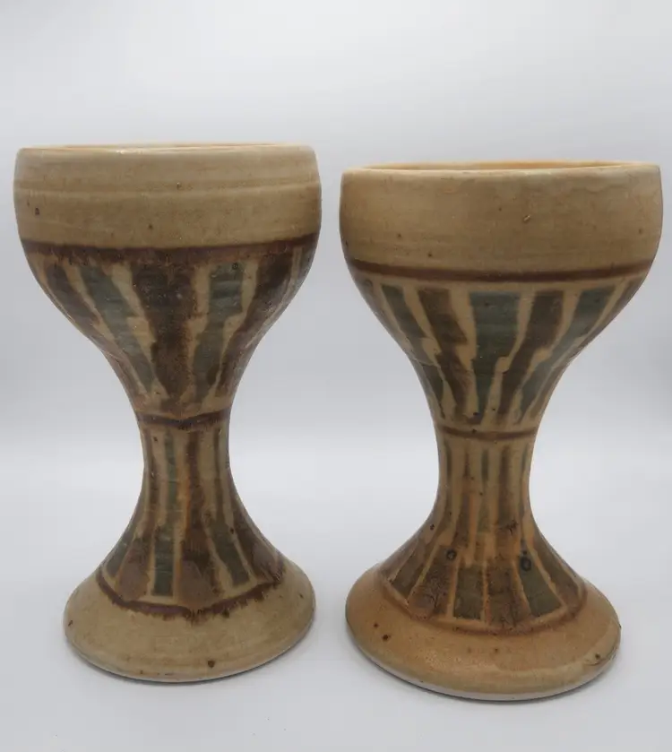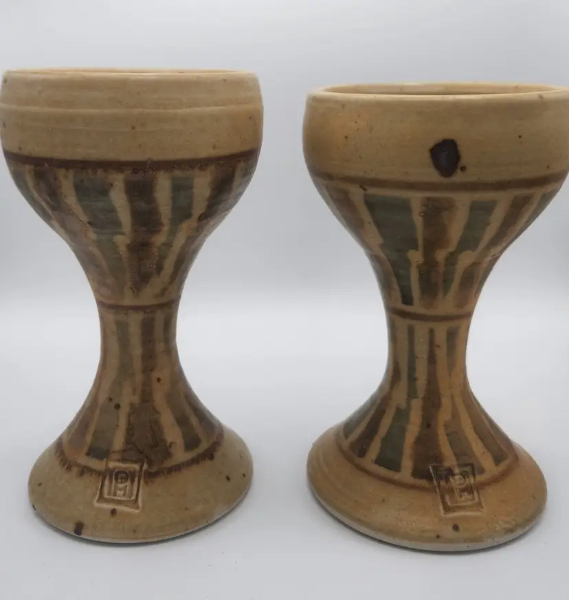 Set of two handmade studio pottery goblets, likely from the 1970s, made of stoneware clay with earth-toned colors. DM maker's mark near the base. 6.5" tall.