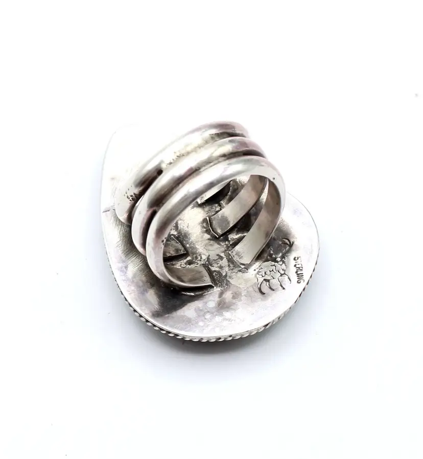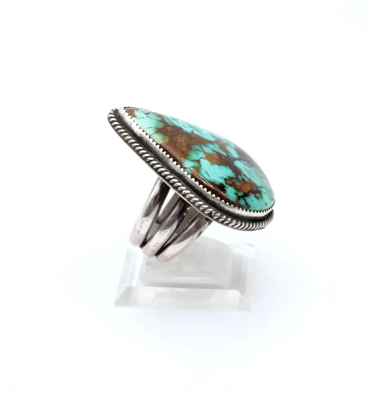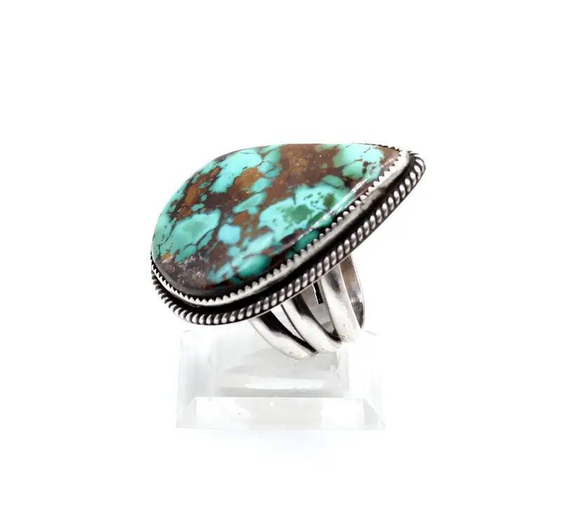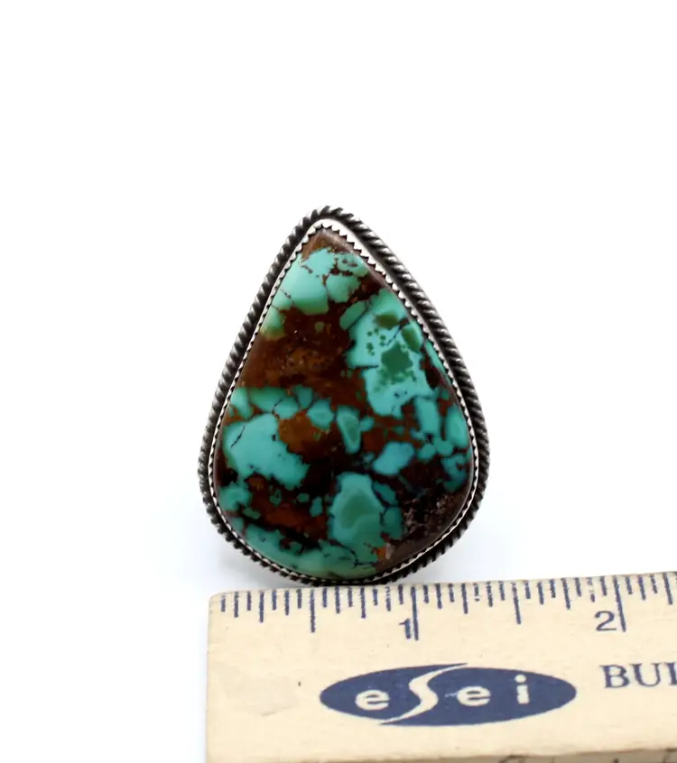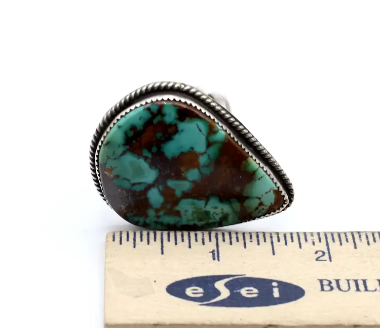 Amazing singed unknown artist SKM inside an Elk pictograph. This ring absolutely rocks a must have! Teardrop turquoise in a saw-tooth bezel with a twisted wire gallery. Three rail shank 11.89 mm band. The stone is approx 44.57mm x 33.40mm. Likley Navajo made or Artisan.