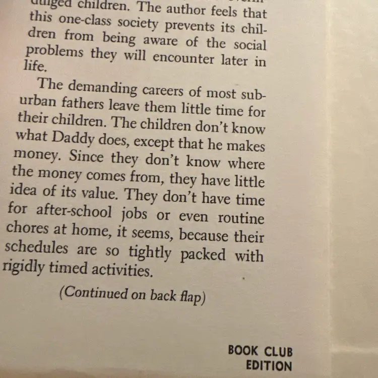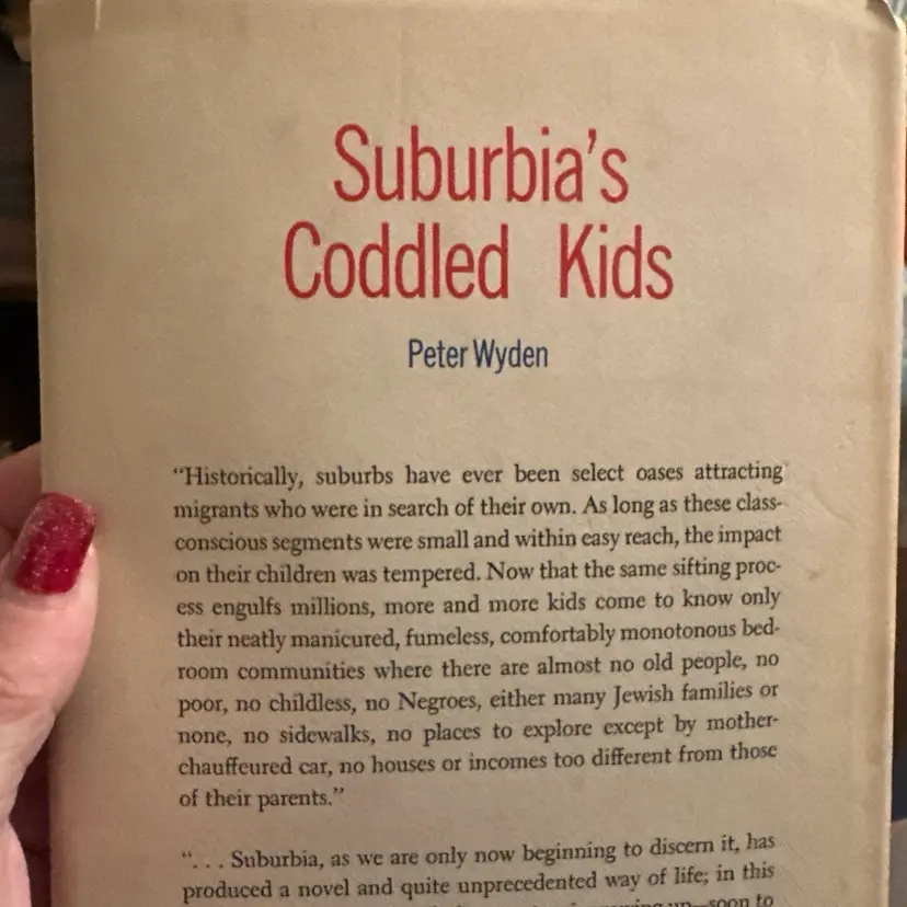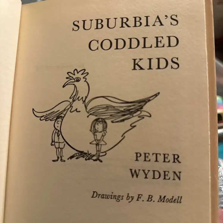 The product is a 1962 hardcover book titled "Suburbia's Coddled Kids" by Peter Wyden. This special edition includes a dust jacket and is part of a book club publication by Doubleday. The literature and fiction subject matter explores themes related to the suburban lifestyle and the challenges faced by children growing up in that environment. The collectible nature of this book makes it a valuable addition to any literature enthusiast's collection.